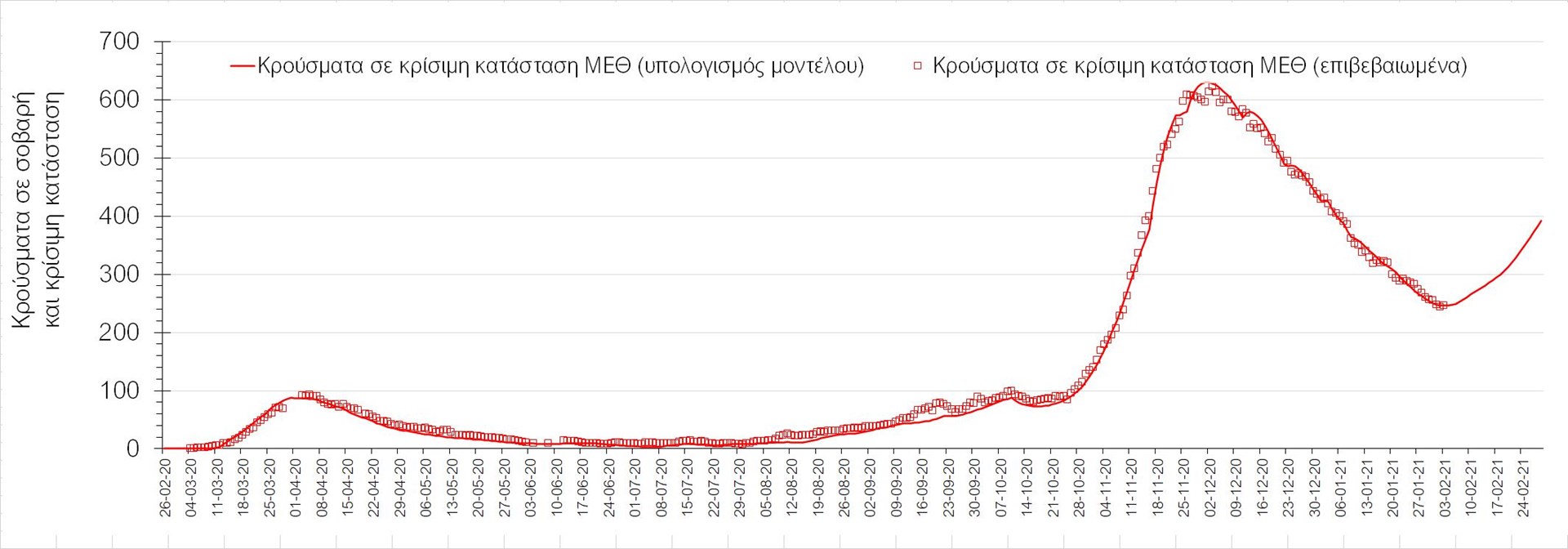 Όσον αφορά στους ασθενείς σε κρίσιμη κατάσταση (διασωληνωμένοι σε ΜΕΘ), ο αριθμός αυξήθηκε πολύ ελαφρά σε σχέση με την Τρίτη (246 από 244), και παραμένει στα αναμενόμενα επίπεδα. Η καμπύλη εξέλιξης του αριθμού των ασθενών που χρειάζονται διασωλήνωση φαίνεται να ακολουθεί την πορεία που διαφαίνονταν και από την υπολογιστική πλατφόρμα CORE, όπως αυτή παρουσιάζεται στο Σχήμα 1, ενώ μια εκτίμηση για την πορεία των θανάτων παρουσιάζεται στο Σχήμα 2.