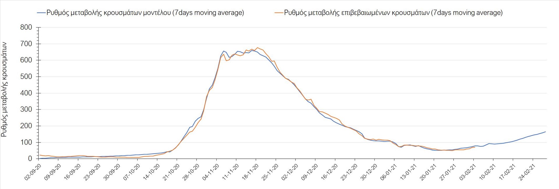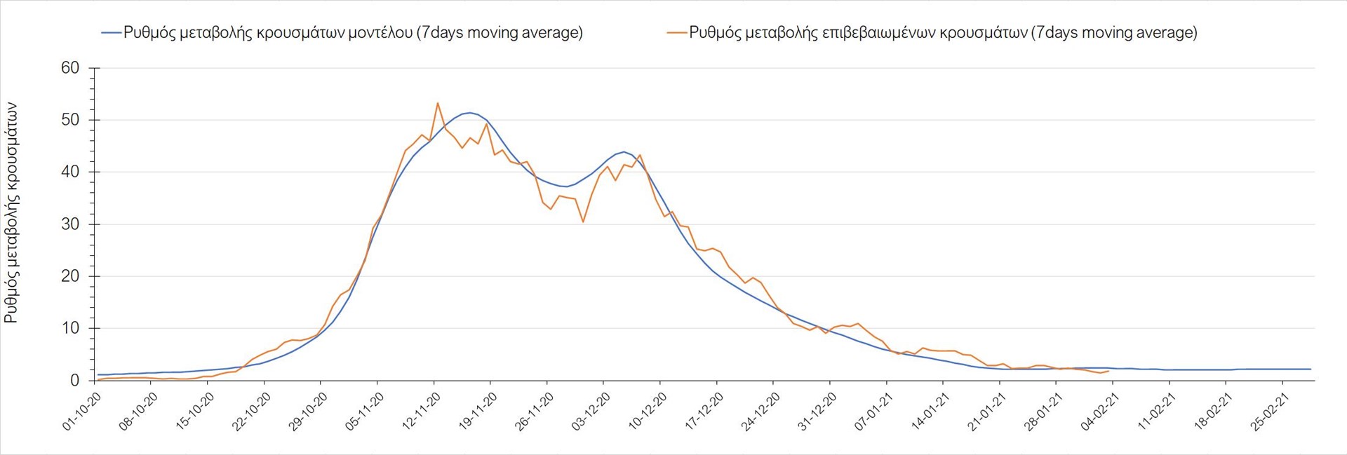 – Να γίνει χρήση συσκευών καθαρισμού αέρα (συσκευές απολύμανσης και φιλτραρίσματος αέρα) σε σχολικές αίθουσες με πάνω από 17 μαθητές, μέσα μαζικής μεταφοράς, εστιατόρια και δημόσιους χώρους. Αυτό θα συντελέσει σε μείωση κατά 20-25% του συνολικού ρυθμού μετάδοσης (καθώς η αερομεταφερόμενη μετάδοση αντιπροσωπεύει το 25-30% του συνόλου).Η επιτυχής διαχείριση του υγειονομικού κινδύνου τους επόμενους δύο μήνες είναι κρίσιμη όχι μόνο για την προστασία της υγείας του πληθυσμού της χώρας αλλά και για την επιτυχημένη λειτουργία του τουρισμού. Καθώς τα τουριστικά πακέτα για τα μεγάλα τουριστικά θέρετρα της χώρας κλείνονται κατά το πλείστον το Μάρτιο, θα είναι καθοριστικό να έχουμε αποδείξει σε όλο τον κόσμο ότι η Ελλάδα μπορεί να διαχειριστεί επιτυχημένα την υγειονομική κρίση και ότι είναι ένας τουριστικός προορισμός υγειονομικά ασφαλής. Για να συνδυάσουμε την καλή υγειονομική διαχείριση με την προάσπιση της οικονομικής δραστηριότητας και της ομαλής κοινωνικής λειτουργίας θα πρέπει να προετοιμάζουμε τις υποδομές μας με τις μεθόδους που προτείνονται παραπάνω ώστε να μειώνουμε ενεργά την πιθανότητα έκθεσης του πληθυσμού σε μεγάλο ιικό φορτίο. Με δεδομένη την παρουσία του πιο μεταδοτικού στελέχους Β.1.1.7 στην Ελλάδα, αυτή η απαίτηση γίνεται ακόμη πιο πιεστική την Τετάρτη. Με βάση τα παραπάνω και τη συνολική επιδημιολογική εικόνα της χώρας, η εφαρμογή ενός αυστηρού lockdown για τρεις εβδομάδες, φαίνεται να είναι μια λύση για την αναχαίτιση του επερχόμενου τρίτου κύματος.