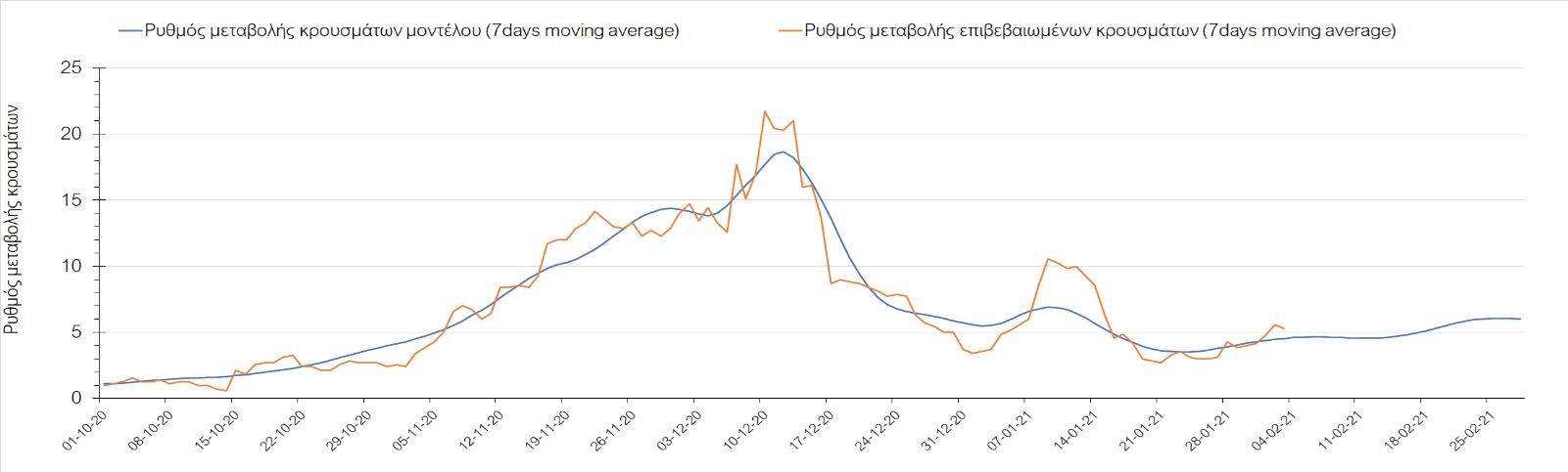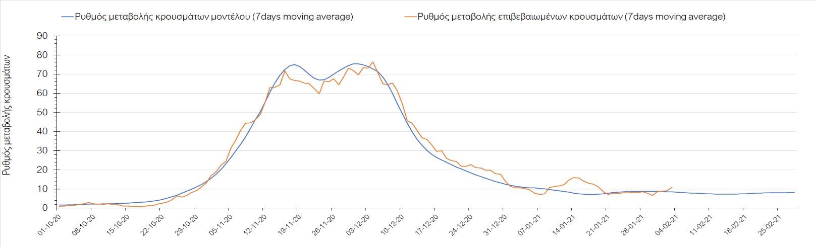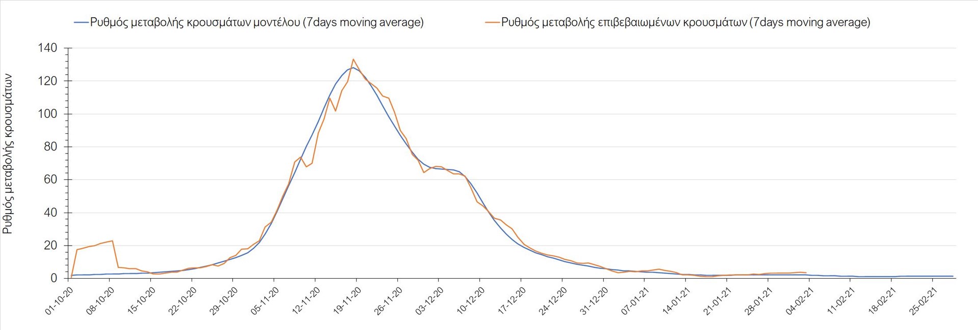 Και στις δύο περιπτώσεις φαίνεται ότι βρισκόμαστε περίπου γύρω στο 99% της αποκλιμάκωσης (βλέπε σχήματα 1 και 2). Επιπλέον, τόσο στους ασθενείς σε κρίσιμη κατάσταση (διασωληνωμένοι σε ΜΕΘ), όσο και στον αριθμό των θανάτων από COVID-19, υπάρχει μια μείωση στο ρυθμό αποκλιμάκωσης και με δεδομένη την άρση των μέτρων περιστολής που ισχύουν από την προηγούμενη εβδομάδα αναμένεται μια αργή αναστροφή της αποκλιμακωτικής πορείας από το τέλος της πρώτης εβδομάδας του Φεβρουαρίου και έπειτα.