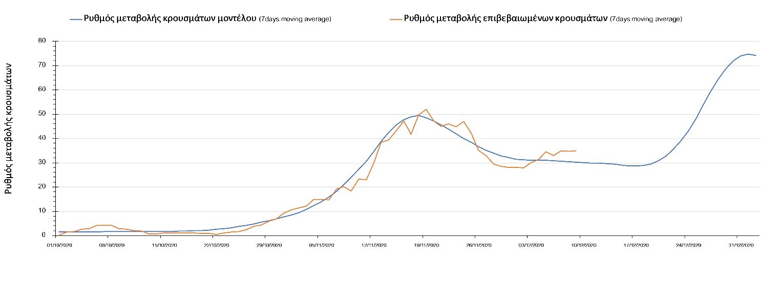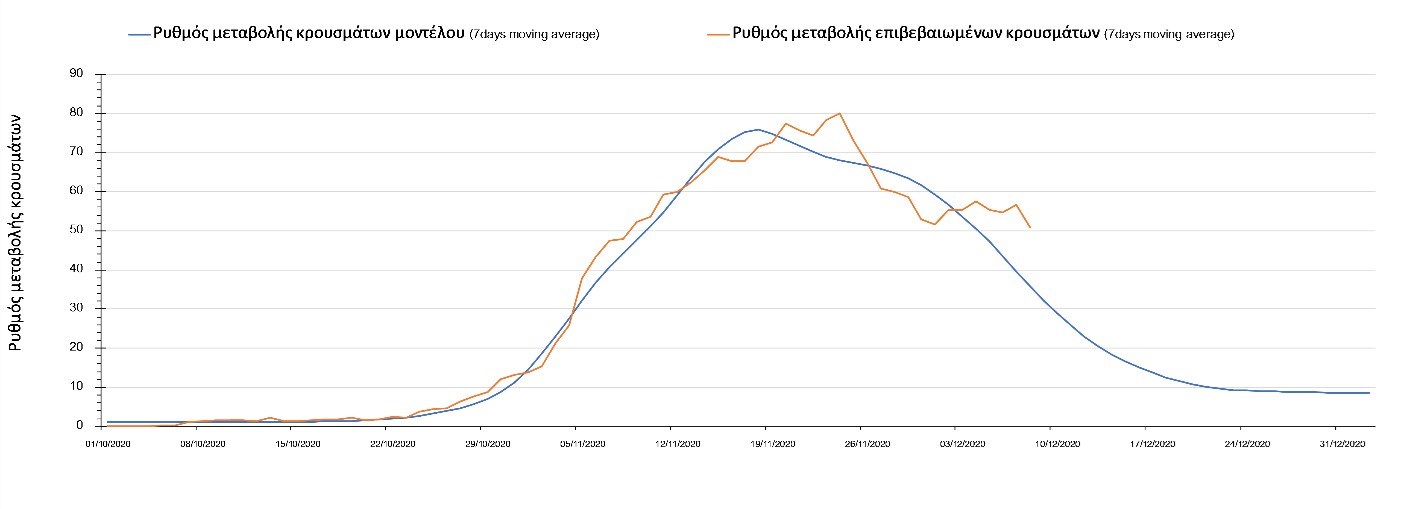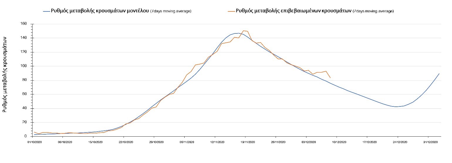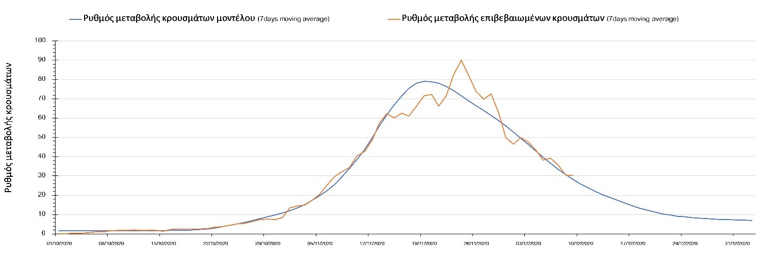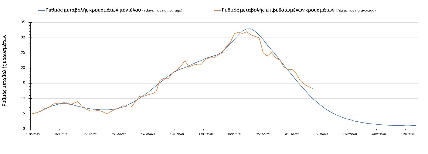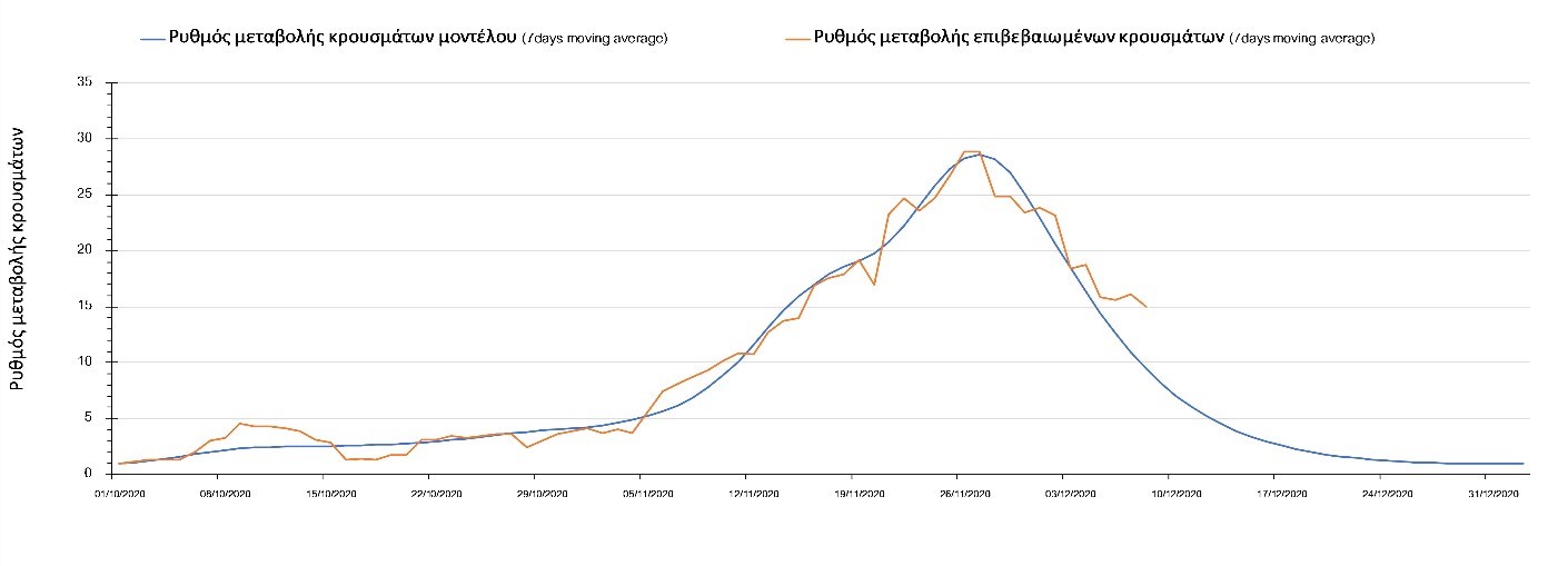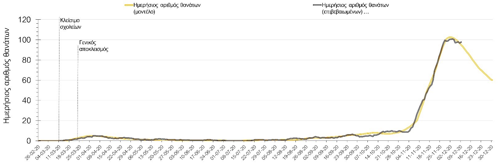 Και σήμερα ο αριθμός των θανάτων (95) παρέμεινε στα αναμενόμενα υψηλά επίπεδα, υποδηλώνοντας ότι μέχρι και πριν 2 εβδομάδες, ο ρυθμός μετάδοσης της νόσου ήταν υψηλός, λόγω της πλημμελούς εφαρμογής του lockdown τις πρώτες 15 ημέρες της εφαρμογής του και από τη συνέχιση της λειτουργίας των Δημοτικών σχολείων και την γενικότερα αυξημένη κοινωνική κινητικότητα των γονέων που συνάδει με τη συνοδεία των νεαρών παιδιών από και προς το σχολείο σε συνδυασμό με την χαμηλή εφαρμογή της τηλεργασίας, η οποία αυξάνει περαιτέρω την πιθανότητα μετάδοσης του SARS-CoV-2 από τους εργαζόμενους ενήλικες. Ο υψηλός αριθμός των θανάτων σε συνδυασμό με την παρατηρούμενη μείωση των επιβεβαιωμένων κρουσμάτων σε σχέση με την προηγούμενη εβδομάδα μπορεί να ερμηνευθεί από το γεγονός ότι έγινε πιο συνεπής εφαρμογή του lockdown μετά τις 17-18 Νοεμβρίου, περίπου 10 μέρες μετά την ανακοίνωση του.
