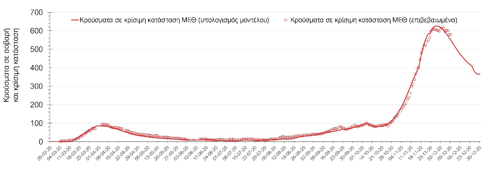 Σχήμα 1. Αριθμός κρουσμάτων σε κρίσιμη κατάσταση (ΜΕΘ) σύμφωνα με τα στοιχεία του ΕΟΔΥ και τις προβλέψεις της υπολογιστικής πλατφόρμας CORE.