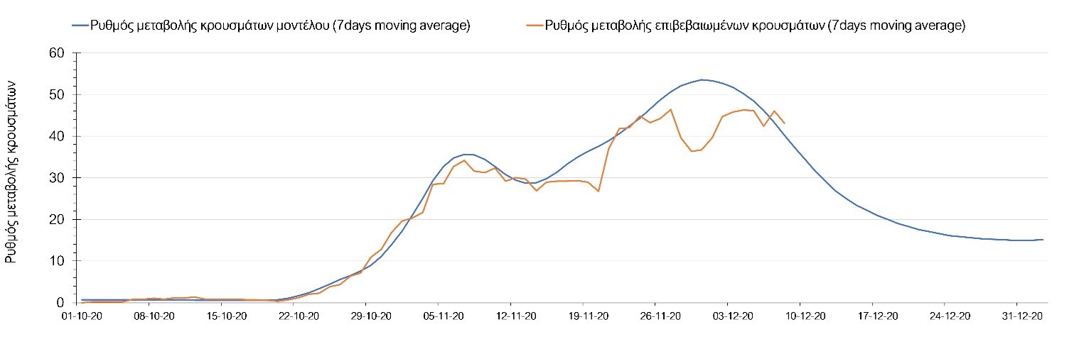 Σχήμα 2. Αριθμός θανάτων (κυλιόμενος μέσος όρος 7 ημερών) σύμφωνα με τα στοιχεία του ΕΟΔΥ και τις προβλέψεις της υπολογιστικής πλατφόρμας CORE.Η πορεία της μέσης εβδομαδιαίας τιμής των κρουσμάτων όπως έχουν καταγραφεί από τον ΕΟΔΥ και η αναμενόμενη πορεία τους στην περίπτωση ανοίγματος των εμπορικών καταστημάτων στις 14 Δεκεμβρίου όπως προδιαγράφεται από την υπολογιστική πλατφόρμα CORE για την Ελληνική επικράτεια, αποτυπώνονται στο Σχήμα 3.