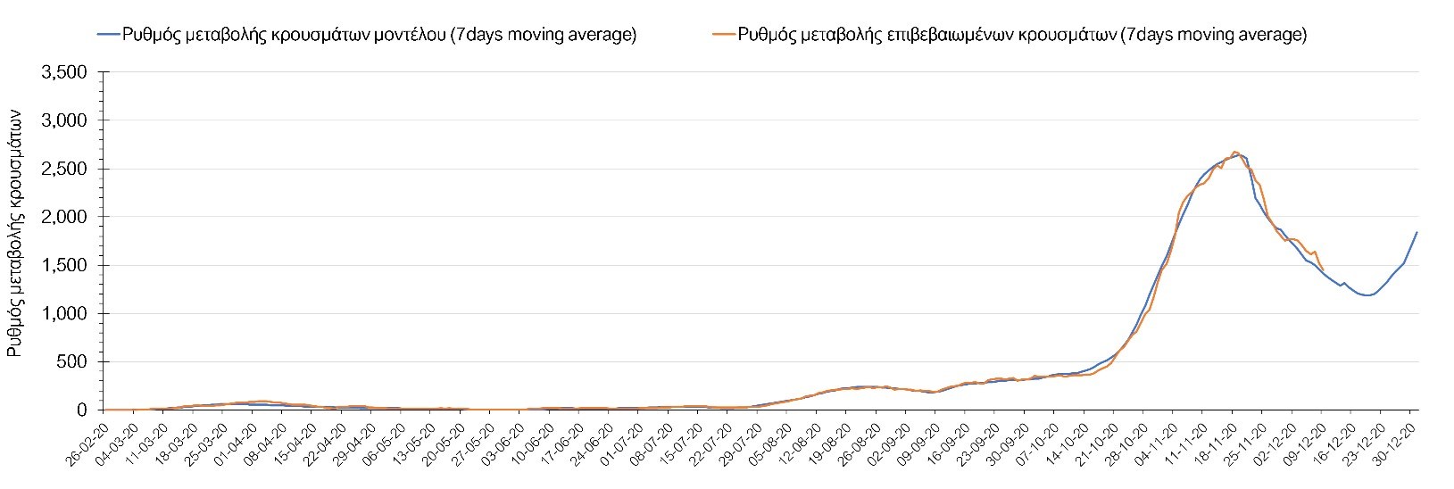 Σχήμα 4. Πορεία του ημερησίου αριθμού των κρουσμάτων (κυλιόμενος μέσος όρος 7 ημερών) στην Αττική