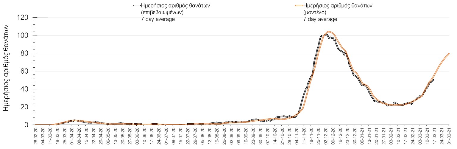 Σχήμα 2. Αριθμός θανάτων (κυλιόμενος μέσος όρος 7 ημερών) σύμφωνα με τα στοιχεία του ΕΟΔΥ και τις προβλέψεις της υπολογιστικής πλατφόρμας CORE.Η πορεία της μέσης εβδομαδιαίας τιμής των κρουσμάτων, καθώς και του κυλιόμενου μέσου όρου 7 ημερών του αριθμού των κρουσμάτων ανά 100.000 πληθυσμού, όπως έχουν καταγραφεί από τον ΕΟΔΥ και η αναμενόμενη πορεία τους όπως προδιαγράφεται από την υπολογιστική πλατφόρμα CORE για την Ελληνική επικράτεια μέχρι το τέλος του Ιανουαρίου, αποτυπώνονται στο Σχήμα 3. Η ανάλυσή μας έχει επικαιροποιηθεί με βάση την απόφαση εφαρμογής αυστηρού lockdown από την Κυριακή 3 Ιανουαρίου μέχρι και τις 17 Ιανουαρίου. Στις 11 Ιανουαρίου λάβαμε υπόψη το άνοιγμα της πρωτοβάθμιας εκπαίδευσης, ενώ το άνοιγμα των βιβλιοπωλείων, κομμωτηρίων, λιανικού εμπορίου και των εμπορικών καταστημάτων από τη Δευτέρα 18/1, ενώ επιπλέον, έχει ληφθεί υπόψη το άνοιγμα τις δευτεροβάθμιας εκπαίδευσης από τη Δευτέρα 1 Φεβρουαρίου στις κίτρινες περιοχές. Στις κόκκινες περιοχές, από τη Δευτέρα 1 Φεβρουαρίου έχει γίνει άνοιγμα μόνο των Γυμνασίων (και συνεχίζεται το καθεστώς τηλε-εκπαίδευση για τα Λύκεια), στις οποίες επίσης, η λειτουργία του λιανεμπορίου θα πραγματοποιείται με τη μέθοδο click away, και η λειτουργία καταστημάτων ένδυσης, υπόδησης, βιβλιοπωλείων, κομμωτηρίων και καταστημάτων προσωπικής περιποίησης με προκαθορισμένο ραντεβού (click-in-shop) και με 1 άτομο ανά 25 τ.μ. Έχουν ληφθεί υπόψιν τα περιοριστικά μέτρα που ανακοινώθηκαν στις 5 Φεβρουαρίου) για Αθήνα, Θεσσαλονίκη, Πάτρα, Χαλκίδα και Χαλκιδική και που τέθηκαν σε ισχύ από το Σάββατο 6 Φεβρουαρίου και μέχρι τη Δευτέρα 15 Φεβρουαρίου, ενώ επιπλέον για την Αθήνα και στο βαθμό που αυτή επηρεάζει όλη την υπόλοιπη Ελλάδα, το αυστηρό lock down, με εφαρμογή από την Πέμπτη 11/2 έως και τις 15/3. Επιπλέον, στο σύνολο της Ελλάδας έχει ληφθεί υπόψιν το lockdown μέχρι και τις 21/3 που εφαρμόσθηκε στις Περιφερειακές Ενότητες Αχαΐας, Αρκαδίας, Θεσσαλονίκης, Λάρισας, Λευκάδας, Φθιώτιδας, Αργολίδας, Κορινθίας, Θεσπρωτίας, Άρτας, Σάμου, Βοιωτίας, Χίου, Αιτωλοακαρνανίας, Ρόδου, Ηρακλείου και Ευβοίας. Επιπλέον, όσον αφορά τις προσομοιώσεις των επιμέρους περιοχών, έγινε επικαιροποίηση των προβλέψεων σε όλες τις επιμέρους περιφερειακές ενότητες όπου εφαρμόσθηκε το lockdown από τις 4/3, το οποίο όπως ανακοινώθηκε και επίσημα σήμερα, θα διατηρηθεί εώς τις 29/3. Όπως ήδη αναφέρθηκε, λόγω της απόκλισης που παρατηρήθηκε την Τρίτη 9/3, έγινε επαναπαραμετροποίηση του μοντέλου με μεγαλύτερη ποσόστωση μεταλλαγμένων στελεχών του SARS-CoV-2 στην κοινότητα, δηλαδή το πόσο τοις εκατό (%) των κρουσμάτων που εντοπίζονται καθημερινά είναι φορείς κάποιου μεταλλαγμένου και πιο ταχέως μεταδιδόμενου στελέχους. Όπως φαίνεται από το διάγραμμα, από τις 8 Ιανουαρίου έχουμε μια αύξηση κρουσμάτων μέχρι τις 11 Ιανουαρίου η οποία οφείλεται στη μείωση της περιστολής που σημειώθηκε στις γιορτές. Από τις 11 μέχρι τις 18 Ιανουαρίου προβλεπόταν μια μείωση κρουσμάτων λόγω της εφαρμογής του lockdown και η οποία όντως παρατηρήθηκε. Εντούτοις, όπως είχαμε προβλέψει, από τις 23 Ιανουαρίου και έπειτα διαφαίνεται αύξηση στον κυλιόμενο μέσο όρο των κρουσμάτων, η οποία έγινε ιδιαίτερα έντονη μετά τις 17/2, η οποία και συνεχίζεται μέχρι τώρα. Λόγω της ισχυρής παρουσία των μεταλλαγμένων στελεχών, πιστεύουμε ότι για να επιτευχθεί κάμψη της επιδημικής καμπύλης, θα πρέπει να γίνει αυστηρή εφαρμογή των μέτρ
