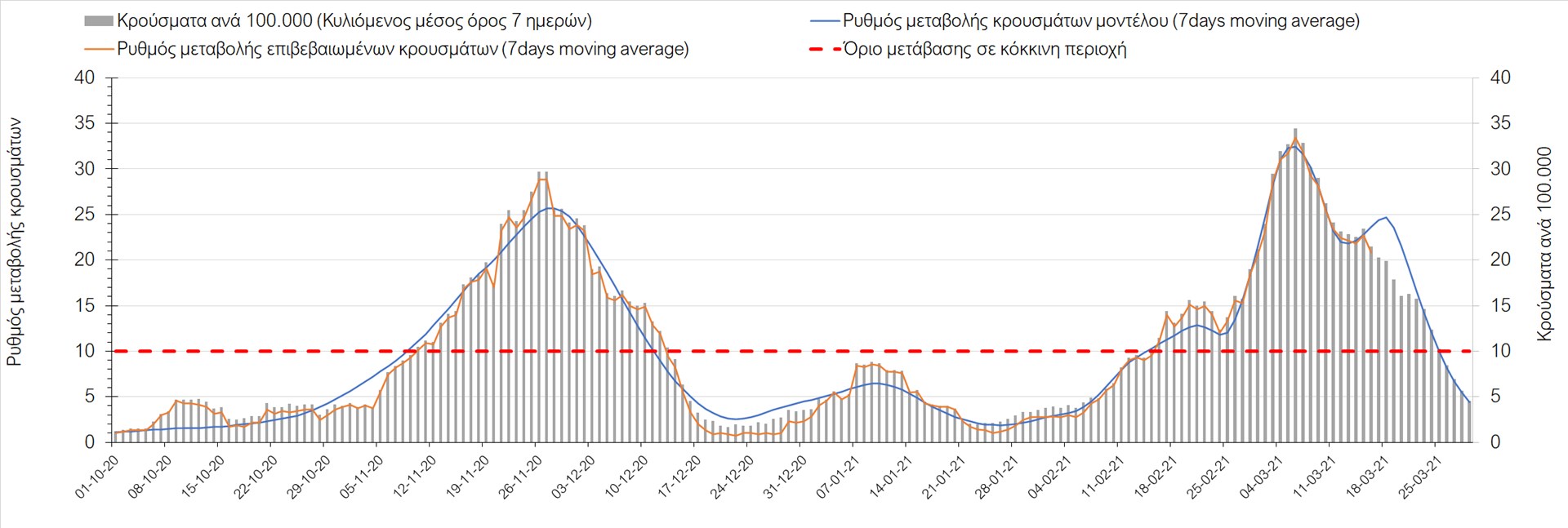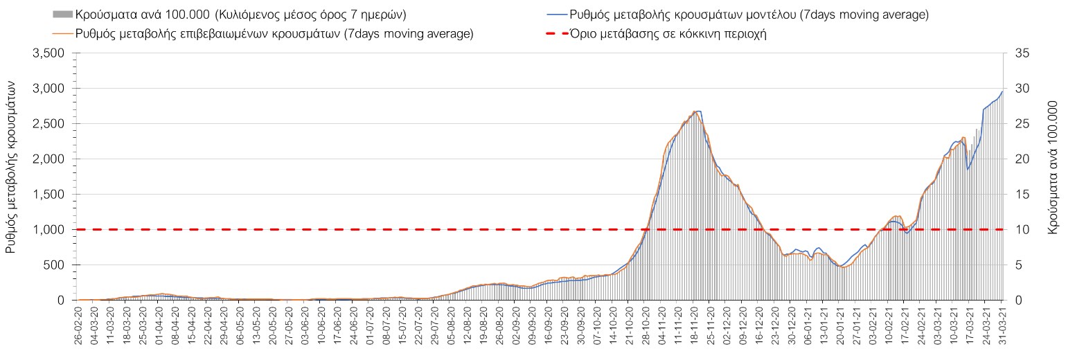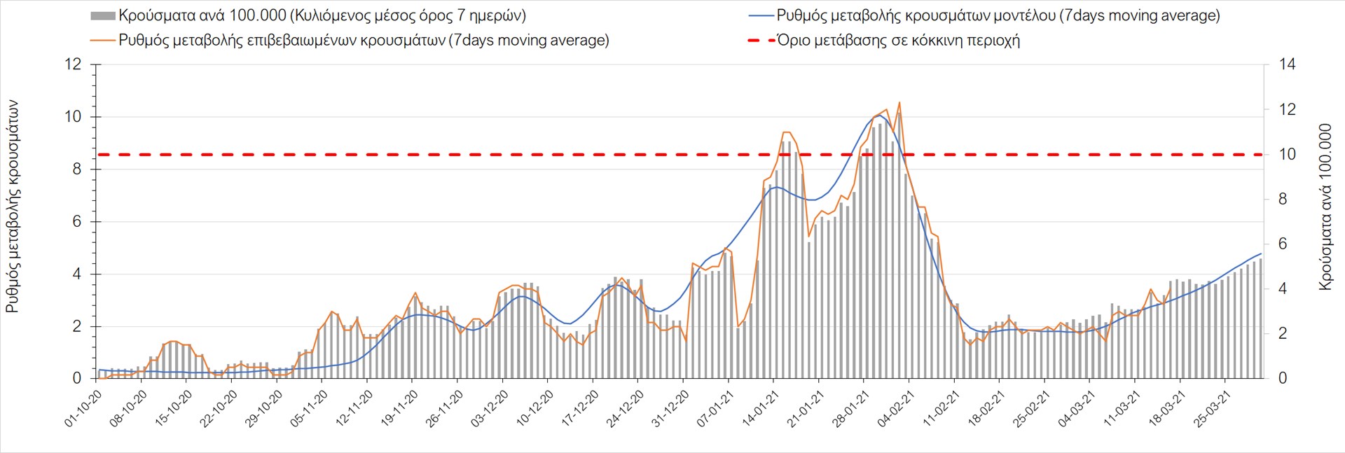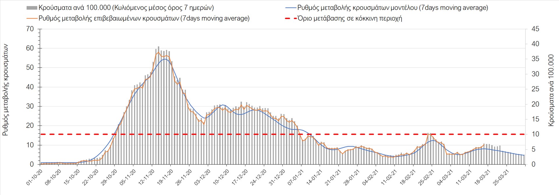 Σχήμα 42. Πορεία του ημερησίου αριθμού των κρουσμάτων (κυλιόμενος μέσος όρος 7 ημερών) στην ΘάσοΣυμπεράσματα:Η αύξηση που παρατηρείται πλέον στον αριθμό των ασθενών σε κρίσιμη κατάσταση (διασωληνομένοι σε ΜΕΘ), καθώς και ο αριθμός των θανάτων (αν και με κάποια μικρή απόκλιση σήμερα) συνάδουν με τις προσομοιώσεις του μοντέλου CORE. Εντούτοις, σημαντικές αποκλίσεις προς τα πάνω παρατηρήθηκαν σήμερα στον αριθμό των κρουσμάτων στο σύνολο της Ελλάδας, καθώς και στις μεγαλύτερες μητροπολιτικές περιοχές, δηλαδή την Αθήνα και τη Θεσσαλονίκη. Τα παραπάνω αποτελέσματα αποτυπώνονται και στο δείκτη θετικότητας, του οποίου η ημερήσια τιμή παρουσίασε πολύ μεγάλη αύξηση. Σε πανελλαδικό επίπεδο ο κυλιόμενος εβδομαδιαίος μέσος όρος του δείκτη θετικότητας αυξήθηκε στο 7,3% (η ημερήσια τιμή σήμερα είναι 12,3%) ενώ ο κυλιόμενος εβδομαδιαίος μέσος όρος του πραγματικού αριθμού αναπαραγωγής Rt (δηλαδή ο αριθμός των ατόμων που ένας φορέας μπορεί να επιμολύνει) μειώθηκε στο 0,99 (τιμές του Rt πάνω από τη μονάδα υποδηλώνουν καθαρή αύξηση της διασποράς του ιού στην κοινότητα). Πλέον, με τον υψηλότερο αριθμό φορέων του μεταλλαγμένου στελέχους και την αναθεώρηση στις προβλέψεις, δεν προβλέπεται σύντομα κάμψη του ρυθμού αύξησης, και μπορεί να χρειαστεί να παραταθούν τα περιοριστικά μέτρα και μετά το τέλος Μαρτίου.Με δεδομένο τον πολύ υψηλό αριθμό κρουσμάτων σήμερα, αλλά και το γεγονός ότι πολλές περιοχές συμπεριλαμβανομένου και της Αττικής βρίσκονται ήδη σε lockdown εδώ και μέρες, η πορεία της πανδημίας δεν είναι η αναμενόμενη, γεγονός που στη παρούσα φάση ίσως υποδηλώνει περισσότερο μεγαλύτερη διασπορά των μεταλλαγμένων στελεχών στην κοινότητα και λιγότερο πλημμελή εφαρμογή των μέτρων. Συνεπώς, παρά την επαναπαραμετροποίηση του μοντέλου και την αναθεώρηση των προβλέψεων, είναι επιτακτική η ανάγκη να έχουμε καλύτερη εικόνα της διασποράς τους, έτσι ώστε να μπορέσει να γίνει ορθή αναπροσαρμογή των εκτιμήσεων για την πορεία της πανδημίας στις επόμενες εβδομάδες.Mε βάση τα δεδομένα αυτής της εβδομάδας, καλώς εφαρμόσθηκαν τα περιοριστικά μέτρα που ισχύουν από τις 4 Μαρτίου, τα οποία ίσως χρειαστούν επιπλέον αναθεώρηση, με βάση την επιδημιολογική εικόνα που θα επικρατήσει, ενώ επίσης καλώς εφαρμόσθηκε το lockdown στην Αθήνα μέχρι τις 15 Μαρτίου. Με τα μέχρι τώρα δεδομένα, τα μέτρα αυτά φαίνονται να είναι προς τη σωστή κατεύθυνση, και αναμένουμε να δούμε εάν θα αποδειχθούν ικανά και στην πράξη να αναχαιτίσουν την επέλαση ενός τρίτου κύματος, εν αναμονή και επιπλέον στοιχείων, τόσο για τη μεταδοτικότητα του στελέχους B.1.1.7. του SARS-CoV-2, όσο και της διασποράς του στην κοινότητα, οπότε συνολικά προτείνουμε την εφαρμογή καθολικού lockdown σε όλη τη χώρα, ώστε να αναχαιτιστεί η διαφαινόμενη ανοδική πορεία που διαμορφώνεται. Η πρόταση αυτή υποστηρίζεται και από το υψηλό ποσοστό πληρότητας των ΜΕΘ, των οποίων οι ανάγκες αναμένεται να συνεχίσουν να αυξάνουν.Παρά την εφαρμογή οριζόντιων μέτρων ανάσχεσης της πανδημίας που εφαρμόσθηκαν από τα τέλη Οκτωβρίου, η πορεία της τελευταίας διαφοροποιείται από περιοχή σε περιοχή. Οι παραπάνω παρατηρήσεις τείνουν στο συμπέρασμα ότι η διαχείριση του υγειονομικού κινδύνου θα πρέπει να εξεταστεί σε τοπικό επίπεδο. Πλέον προβληματίζουν πέρα από την Αττική, η Αχαΐα, η Εύβοια, η Βοιωτία, η Χαλκιδική, καθώς επίσης η Αρκαδία, η Αργολίδα, η Φθιώτιδα, η Ευρυτα