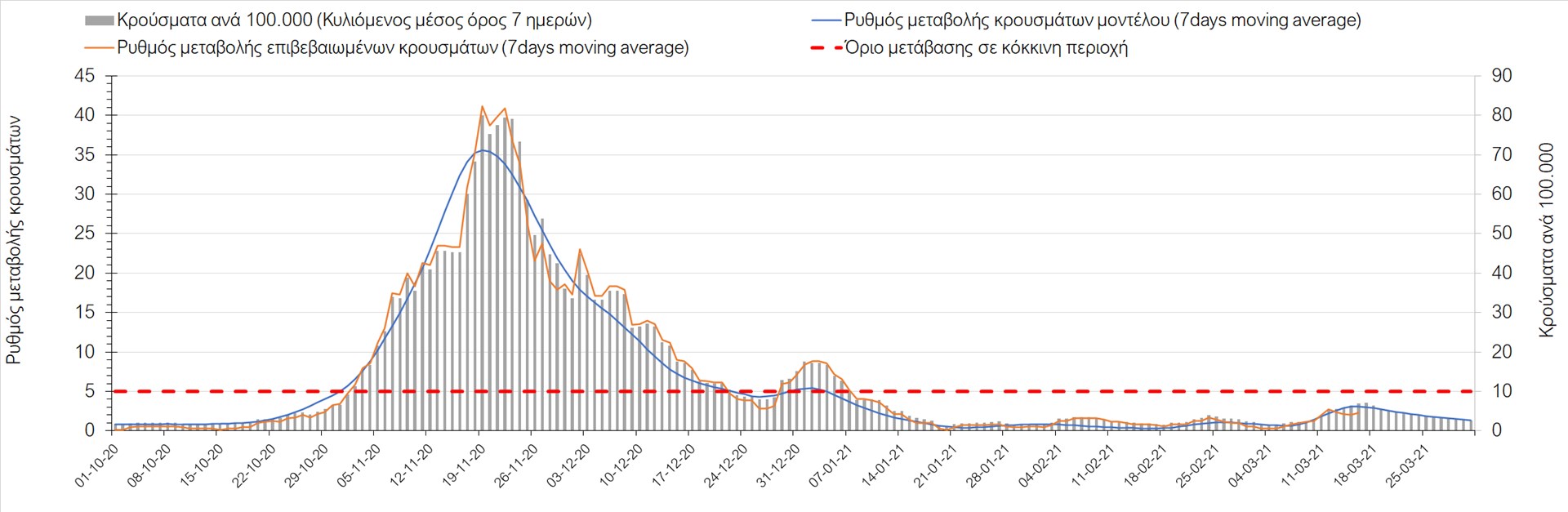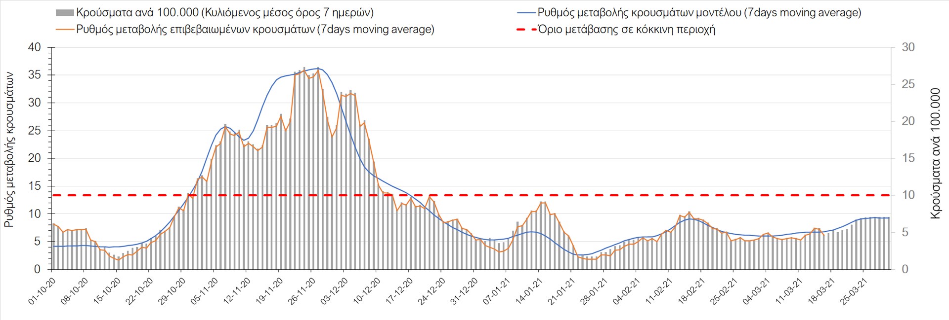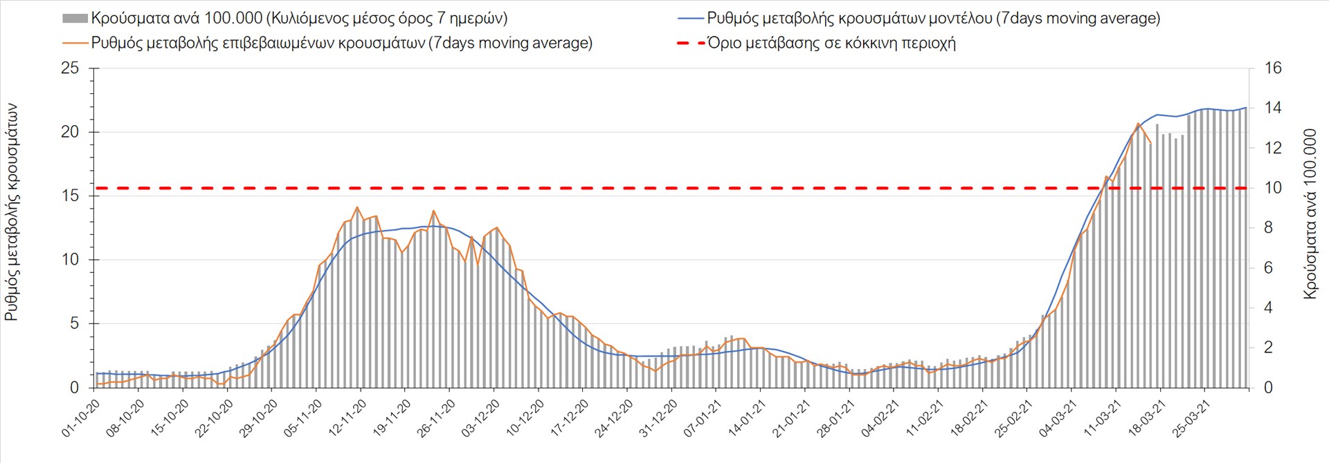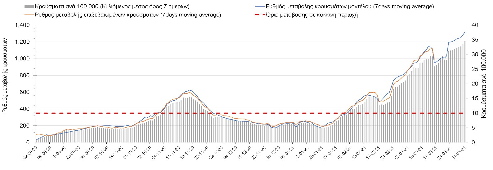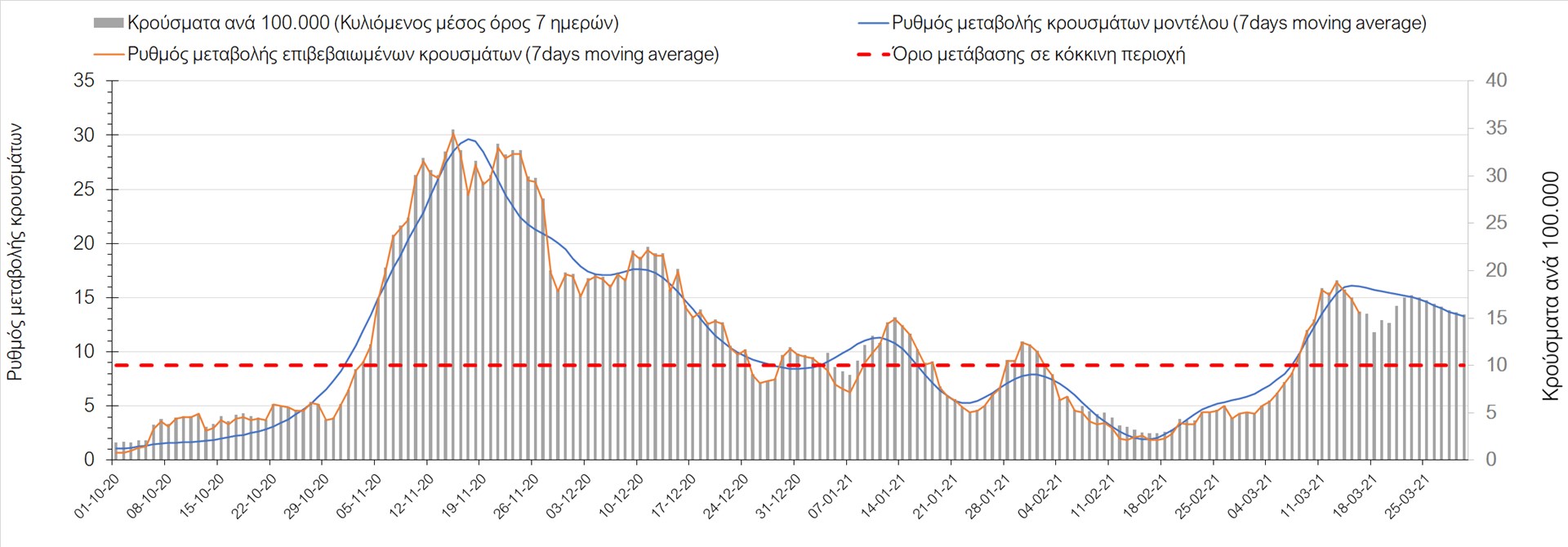 Σχήμα 42. Πορεία του ημερησίου αριθμού των κρουσμάτων (κυλιόμενος μέσος όρος 7 ημερών) στην ΘάσοΣυμπεράσματα:Η αύξηση που παρατηρείται πλέον στον αριθμό των ασθενών σε κρίσιμη κατάσταση (διασωληνομένοι σε ΜΕΘ), καθώς και ο αριθμός των θανάτων (αν και με κάποια μικρή απόκλιση σήμερα) συνάδουν με τις προσομοιώσεις του μοντέλου CORE. Εντούτοις, σημαντικές αποκλίσεις προς τα πάνω παρατηρήθηκαν σήμερα στον αριθμό των κρουσμάτων στο σύνολο της Ελλάδας, καθώς και στις μεγαλύτερες μητροπολιτικές περιοχές, δηλαδή την Αθήνα και τη Θεσσαλονίκη. Τα παραπάνω αποτελέσματα αποτυπώνονται και στο δείκτη θετικότητας, του οποίου η ημερήσια τιμή παρουσίασε πολύ μεγάλη αύξηση. Σε πανελλαδικό επίπεδο ο κυλιόμενος εβδομαδιαίος μέσος όρος του δείκτη θετικότητας αυξήθηκε στο 7,3% (η ημερήσια τιμή σήμερα είναι 12,3%) ενώ ο κυλιόμενος εβδομαδιαίος μέσος όρος του πραγματικού αριθμού αναπαραγωγής Rt (δηλαδή ο αριθμός των ατόμων που ένας φορέας μπορεί να επιμολύνει) μειώθηκε στο 0,99 (τιμές του Rt πάνω από τη μονάδα υποδηλώνουν καθαρή αύξηση της διασποράς του ιού στην κοινότητα). Πλέον, με τον υψηλότερο αριθμό φορέων του μεταλλαγμένου στελέχους και την αναθεώρηση στις προβλέψεις, δεν προβλέπεται σύντομα κάμψη του ρυθμού αύξησης, και μπορεί να χρειαστεί να παραταθούν τα περιοριστικά μέτρα και μετά το τέλος Μαρτίου.Με δεδομένο τον πολύ υψηλό αριθμό κρουσμάτων σήμερα, αλλά και το γεγονός ότι πολλές περιοχές συμπεριλαμβανομένου και της Αττικής βρίσκονται ήδη σε lockdown εδώ και μέρες, η πορεία της πανδημίας δεν είναι η αναμενόμενη, γεγονός που στη παρούσα φάση ίσως υποδηλώνει περισσότερο μεγαλύτερη διασπορά των μεταλλαγμένων στελεχών στην κοινότητα και λιγότερο πλημμελή εφαρμογή των μέτρων. Συνεπώς, παρά την επαναπαραμετροποίηση του μοντέλου και την αναθεώρηση των προβλέψεων, είναι επιτακτική η ανάγκη να έχουμε καλύτερη εικόνα της διασποράς τους, έτσι ώστε να μπορέσει να γίνει ορθή αναπροσαρμογή των εκτιμήσεων για την πορεία της πανδημίας στις επόμενες εβδομάδες.Mε βάση τα δεδομένα αυτής της εβδομάδας, καλώς εφαρμόσθηκαν τα περιοριστικά μέτρα που ισχύουν από τις 4 Μαρτίου, τα οποία ίσως χρειαστούν επιπλέον αναθεώρηση, με βάση την επιδημιολογική εικόνα που θα επικρατήσει, ενώ επίσης καλώς εφαρμόσθηκε το lockdown στην Αθήνα μέχρι τις 15 Μαρτίου. Με τα μέχρι τώρα δεδομένα, τα μέτρα αυτά φαίνονται να είναι προς τη σωστή κατεύθυνση, και αναμένουμε να δούμε εάν θα αποδειχθούν ικανά και στην πράξη να αναχαιτίσουν την επέλαση ενός τρίτου κύματος, εν αναμονή και επιπλέον στοιχείων, τόσο για τη μεταδοτικότητα του στελέχους B.1.1.7. του SARS-CoV-2, όσο και της διασποράς του στην κοινότητα, οπότε συνολικά προτείνουμε την εφαρμογή καθολικού lockdown σε όλη τη χώρα, ώστε να αναχαιτιστεί η διαφαινόμενη ανοδική πορεία που διαμορφώνεται. Η πρόταση αυτή υποστηρίζεται και από το υψηλό ποσοστό πληρότητας των ΜΕΘ, των οποίων οι ανάγκες αναμένεται να συνεχίσουν να αυξάνουν.Παρά την εφαρμογή οριζόντιων μέτρων ανάσχεσης της πανδημίας που εφαρμόσθηκαν από τα τέλη Οκτωβρίου, η πορεία της τελευταίας διαφοροποιείται από περιοχή σε περιοχή. Οι παραπάνω παρατηρήσεις τείνουν στο συμπέρασμα ότι η διαχείριση του υγειονομικού κινδύνου θα πρέπει να εξεταστεί σε τοπικό επίπεδο. Πλέον προβληματίζουν πέρα από την Αττική, η Αχαΐα, η Εύβοια, η Βοιωτία, η Χαλκιδική, καθώς επίσης η Αρκαδία, η Αργολίδα, η Φθιώτιδα, η Ευρυτα