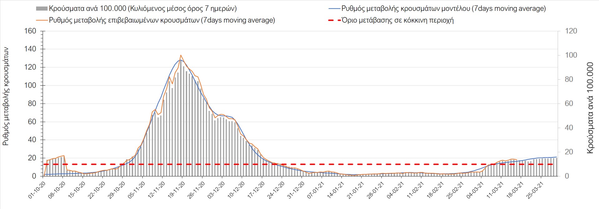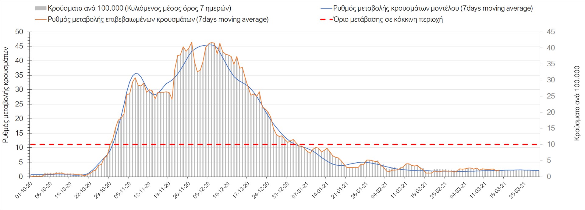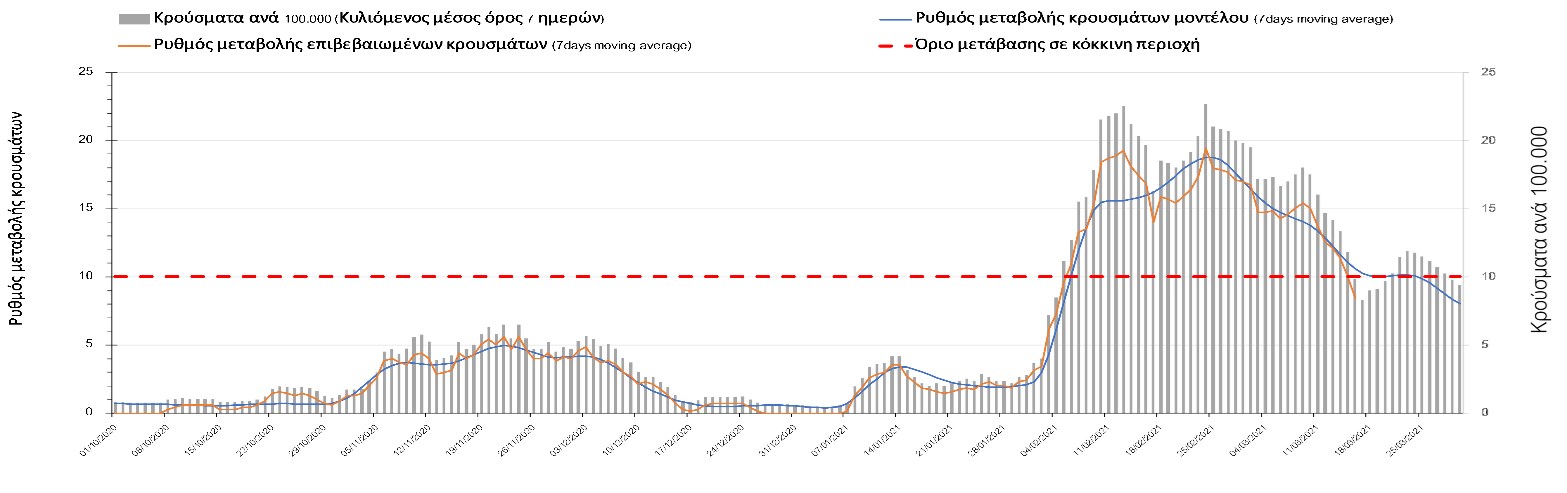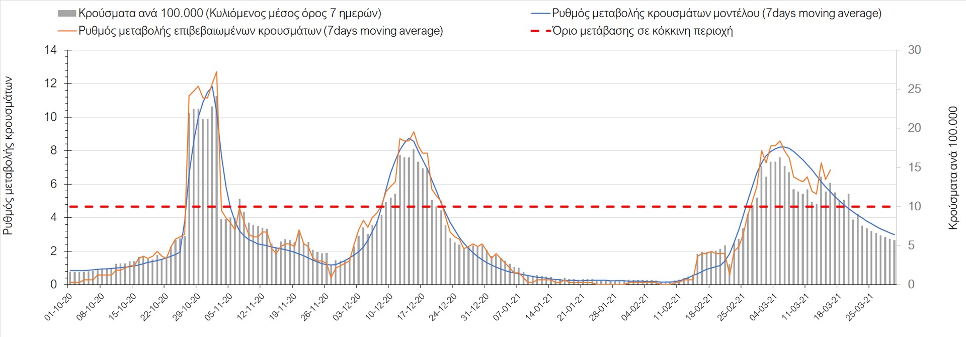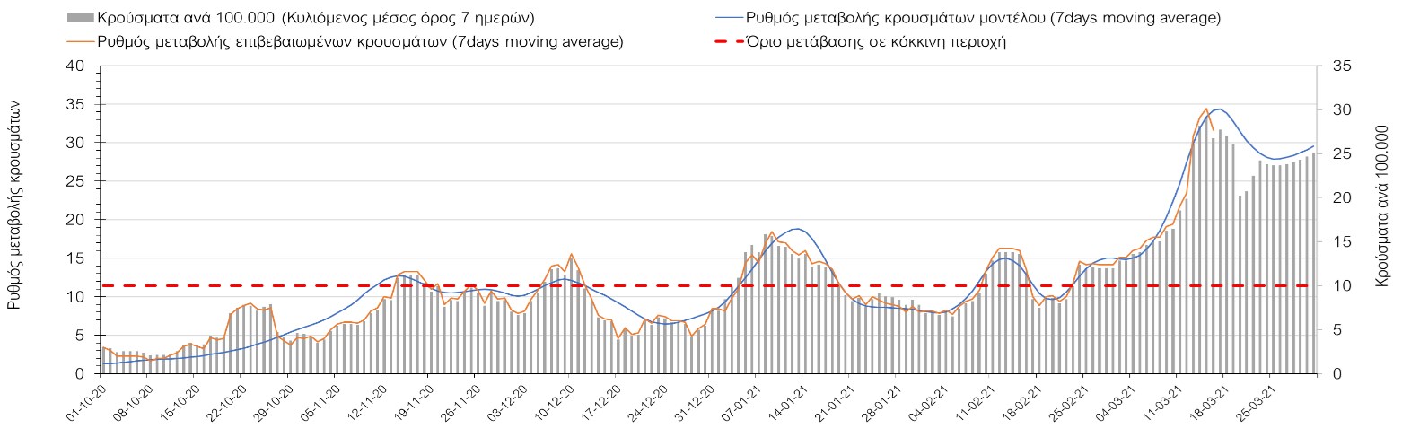 Σχήμα 42. Πορεία του ημερησίου αριθμού των κρουσμάτων (κυλιόμενος μέσος όρος 7 ημερών) στην ΘάσοΣυμπεράσματα:Η αύξηση που παρατηρείται πλέον στον αριθμό των ασθενών σε κρίσιμη κατάσταση (διασωληνομένοι σε ΜΕΘ), καθώς και ο αριθμός των θανάτων (αν και με κάποια μικρή απόκλιση σήμερα) συνάδουν με τις προσομοιώσεις του μοντέλου CORE. Εντούτοις, σημαντικές αποκλίσεις προς τα πάνω παρατηρήθηκαν σήμερα στον αριθμό των κρουσμάτων στο σύνολο της Ελλάδας, καθώς και στις μεγαλύτερες μητροπολιτικές περιοχές, δηλαδή την Αθήνα και τη Θεσσαλονίκη. Τα παραπάνω αποτελέσματα αποτυπώνονται και στο δείκτη θετικότητας, του οποίου η ημερήσια τιμή παρουσίασε πολύ μεγάλη αύξηση. Σε πανελλαδικό επίπεδο ο κυλιόμενος εβδομαδιαίος μέσος όρος του δείκτη θετικότητας αυξήθηκε στο 7,3% (η ημερήσια τιμή σήμερα είναι 12,3%) ενώ ο κυλιόμενος εβδομαδιαίος μέσος όρος του πραγματικού αριθμού αναπαραγωγής Rt (δηλαδή ο αριθμός των ατόμων που ένας φορέας μπορεί να επιμολύνει) μειώθηκε στο 0,99 (τιμές του Rt πάνω από τη μονάδα υποδηλώνουν καθαρή αύξηση της διασποράς του ιού στην κοινότητα). Πλέον, με τον υψηλότερο αριθμό φορέων του μεταλλαγμένου στελέχους και την αναθεώρηση στις προβλέψεις, δεν προβλέπεται σύντομα κάμψη του ρυθμού αύξησης, και μπορεί να χρειαστεί να παραταθούν τα περιοριστικά μέτρα και μετά το τέλος Μαρτίου.Με δεδομένο τον πολύ υψηλό αριθμό κρουσμάτων σήμερα, αλλά και το γεγονός ότι πολλές περιοχές συμπεριλαμβανομένου και της Αττικής βρίσκονται ήδη σε lockdown εδώ και μέρες, η πορεία της πανδημίας δεν είναι η αναμενόμενη, γεγονός που στη παρούσα φάση ίσως υποδηλώνει περισσότερο μεγαλύτερη διασπορά των μεταλλαγμένων στελεχών στην κοινότητα και λιγότερο πλημμελή εφαρμογή των μέτρων. Συνεπώς, παρά την επαναπαραμετροποίηση του μοντέλου και την αναθεώρηση των προβλέψεων, είναι επιτακτική η ανάγκη να έχουμε καλύτερη εικόνα της διασποράς τους, έτσι ώστε να μπορέσει να γίνει ορθή αναπροσαρμογή των εκτιμήσεων για την πορεία της πανδημίας στις επόμενες εβδομάδες.Mε βάση τα δεδομένα αυτής της εβδομάδας, καλώς εφαρμόσθηκαν τα περιοριστικά μέτρα που ισχύουν από τις 4 Μαρτίου, τα οποία ίσως χρειαστούν επιπλέον αναθεώρηση, με βάση την επιδημιολογική εικόνα που θα επικρατήσει, ενώ επίσης καλώς εφαρμόσθηκε το lockdown στην Αθήνα μέχρι τις 15 Μαρτίου. Με τα μέχρι τώρα δεδομένα, τα μέτρα αυτά φαίνονται να είναι προς τη σωστή κατεύθυνση, και αναμένουμε να δούμε εάν θα αποδειχθούν ικανά και στην πράξη να αναχαιτίσουν την επέλαση ενός τρίτου κύματος, εν αναμονή και επιπλέον στοιχείων, τόσο για τη μεταδοτικότητα του στελέχους B.1.1.7. του SARS-CoV-2, όσο και της διασποράς του στην κοινότητα, οπότε συνολικά προτείνουμε την εφαρμογή καθολικού lockdown σε όλη τη χώρα, ώστε να αναχαιτιστεί η διαφαινόμενη ανοδική πορεία που διαμορφώνεται. Η πρόταση αυτή υποστηρίζεται και από το υψηλό ποσοστό πληρότητας των ΜΕΘ, των οποίων οι ανάγκες αναμένεται να συνεχίσουν να αυξάνουν.Παρά την εφαρμογή οριζόντιων μέτρων ανάσχεσης της πανδημίας που εφαρμόσθηκαν από τα τέλη Οκτωβρίου, η πορεία της τελευταίας διαφοροποιείται από περιοχή σε περιοχή. Οι παραπάνω παρατηρήσεις τείνουν στο συμπέρασμα ότι η διαχείριση του υγειονομικού κινδύνου θα πρέπει να εξεταστεί σε τοπικό επίπεδο. Πλέον προβληματίζουν πέρα από την Αττική, η Αχαΐα, η Εύβοια, η Βοιωτία, η Χαλκιδική, καθώς επίσης η Αρκαδία, η Αργολίδα, η Φθιώτιδα, η Ευρυτα