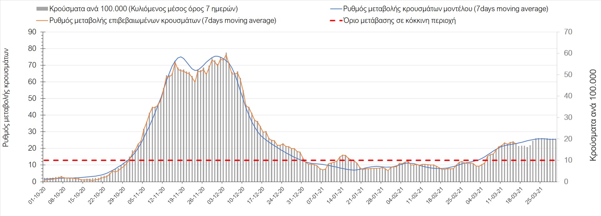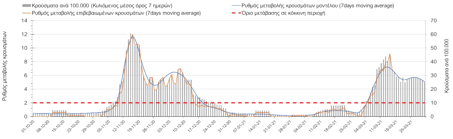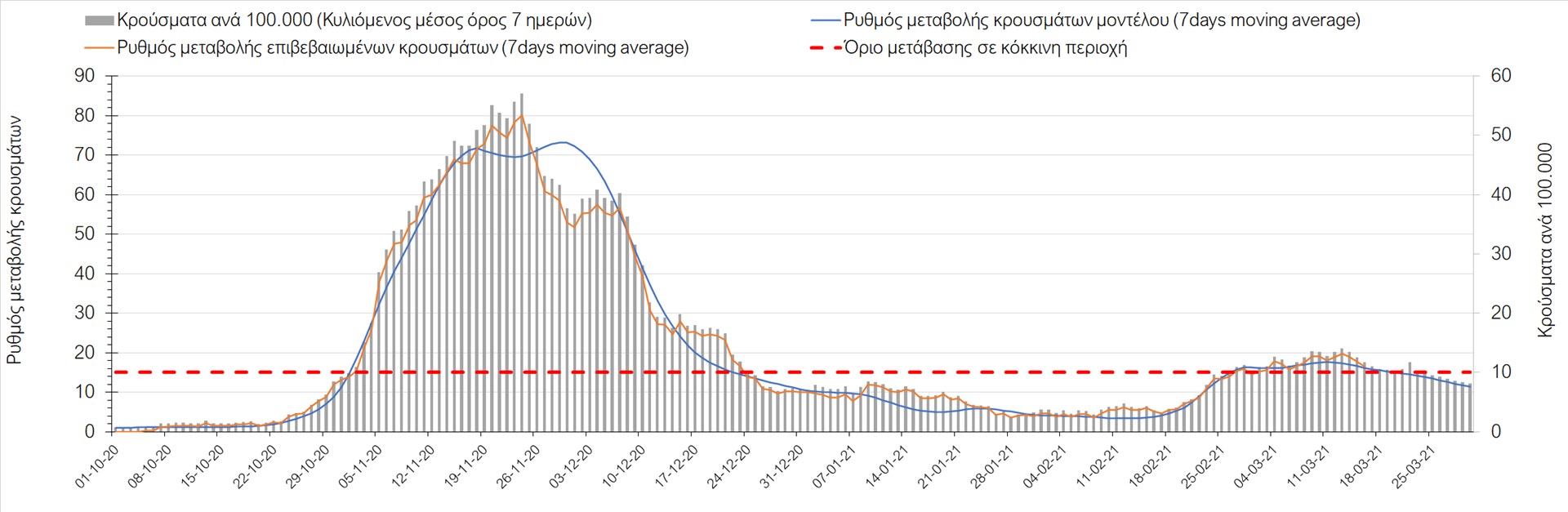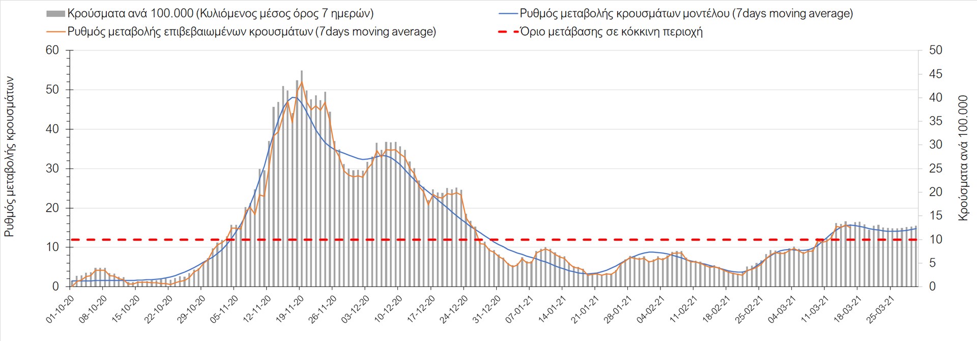 Σχήμα 42. Πορεία του ημερησίου αριθμού των κρουσμάτων (κυλιόμενος μέσος όρος 7 ημερών) στην ΘάσοΣυμπεράσματα:Η αύξηση που παρατηρείται πλέον στον αριθμό των ασθενών σε κρίσιμη κατάσταση (διασωληνομένοι σε ΜΕΘ), καθώς και ο αριθμός των θανάτων (αν και με κάποια μικρή απόκλιση σήμερα) συνάδουν με τις προσομοιώσεις του μοντέλου CORE. Εντούτοις, σημαντικές αποκλίσεις προς τα πάνω παρατηρήθηκαν σήμερα στον αριθμό των κρουσμάτων στο σύνολο της Ελλάδας, καθώς και στις μεγαλύτερες μητροπολιτικές περιοχές, δηλαδή την Αθήνα και τη Θεσσαλονίκη. Τα παραπάνω αποτελέσματα αποτυπώνονται και στο δείκτη θετικότητας, του οποίου η ημερήσια τιμή παρουσίασε πολύ μεγάλη αύξηση. Σε πανελλαδικό επίπεδο ο κυλιόμενος εβδομαδιαίος μέσος όρος του δείκτη θετικότητας αυξήθηκε στο 7,3% (η ημερήσια τιμή σήμερα είναι 12,3%) ενώ ο κυλιόμενος εβδομαδιαίος μέσος όρος του πραγματικού αριθμού αναπαραγωγής Rt (δηλαδή ο αριθμός των ατόμων που ένας φορέας μπορεί να επιμολύνει) μειώθηκε στο 0,99 (τιμές του Rt πάνω από τη μονάδα υποδηλώνουν καθαρή αύξηση της διασποράς του ιού στην κοινότητα). Πλέον, με τον υψηλότερο αριθμό φορέων του μεταλλαγμένου στελέχους και την αναθεώρηση στις προβλέψεις, δεν προβλέπεται σύντομα κάμψη του ρυθμού αύξησης, και μπορεί να χρειαστεί να παραταθούν τα περιοριστικά μέτρα και μετά το τέλος Μαρτίου.Με δεδομένο τον πολύ υψηλό αριθμό κρουσμάτων σήμερα, αλλά και το γεγονός ότι πολλές περιοχές συμπεριλαμβανομένου και της Αττικής βρίσκονται ήδη σε lockdown εδώ και μέρες, η πορεία της πανδημίας δεν είναι η αναμενόμενη, γεγονός που στη παρούσα φάση ίσως υποδηλώνει περισσότερο μεγαλύτερη διασπορά των μεταλλαγμένων στελεχών στην κοινότητα και λιγότερο πλημμελή εφαρμογή των μέτρων. Συνεπώς, παρά την επαναπαραμετροποίηση του μοντέλου και την αναθεώρηση των προβλέψεων, είναι επιτακτική η ανάγκη να έχουμε καλύτερη εικόνα της διασποράς τους, έτσι ώστε να μπορέσει να γίνει ορθή αναπροσαρμογή των εκτιμήσεων για την πορεία της πανδημίας στις επόμενες εβδομάδες.Mε βάση τα δεδομένα αυτής της εβδομάδας, καλώς εφαρμόσθηκαν τα περιοριστικά μέτρα που ισχύουν από τις 4 Μαρτίου, τα οποία ίσως χρειαστούν επιπλέον αναθεώρηση, με βάση την επιδημιολογική εικόνα που θα επικρατήσει, ενώ επίσης καλώς εφαρμόσθηκε το lockdown στην Αθήνα μέχρι τις 15 Μαρτίου. Με τα μέχρι τώρα δεδομένα, τα μέτρα αυτά φαίνονται να είναι προς τη σωστή κατεύθυνση, και αναμένουμε να δούμε εάν θα αποδειχθούν ικανά και στην πράξη να αναχαιτίσουν την επέλαση ενός τρίτου κύματος, εν αναμονή και επιπλέον στοιχείων, τόσο για τη μεταδοτικότητα του στελέχους B.1.1.7. του SARS-CoV-2, όσο και της διασποράς του στην κοινότητα, οπότε συνολικά προτείνουμε την εφαρμογή καθολικού lockdown σε όλη τη χώρα, ώστε να αναχαιτιστεί η διαφαινόμενη ανοδική πορεία που διαμορφώνεται. Η πρόταση αυτή υποστηρίζεται και από το υψηλό ποσοστό πληρότητας των ΜΕΘ, των οποίων οι ανάγκες αναμένεται να συνεχίσουν να αυξάνουν.Παρά την εφαρμογή οριζόντιων μέτρων ανάσχεσης της πανδημίας που εφαρμόσθηκαν από τα τέλη Οκτωβρίου, η πορεία της τελευταίας διαφοροποιείται από περιοχή σε περιοχή. Οι παραπάνω παρατηρήσεις τείνουν στο συμπέρασμα ότι η διαχείριση του υγειονομικού κινδύνου θα πρέπει να εξεταστεί σε τοπικό επίπεδο. Πλέον προβληματίζουν πέρα από την Αττική, η Αχαΐα, η Εύβοια, η Βοιωτία, η Χαλκιδική, καθώς επίσης η Αρκαδία, η Αργολίδα, η Φθιώτιδα, η Ευρυτα