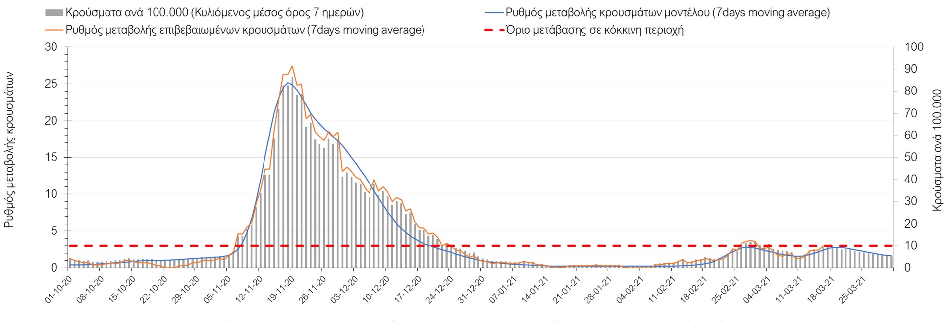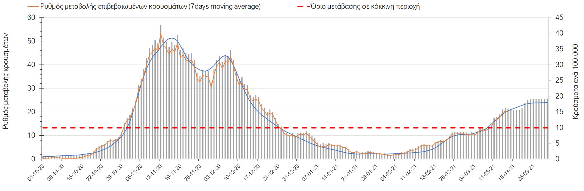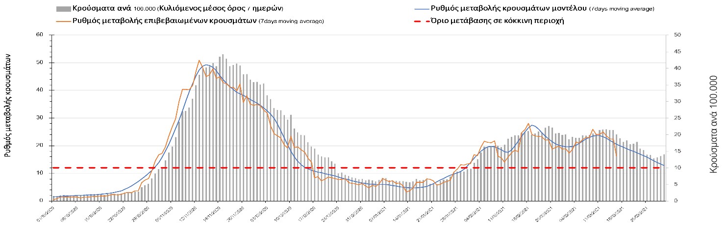 Σχήμα 28. Πορεία του ημερησίου αριθμού των κρουσμάτων (κυλιόμενος μέσος όρος 7 ημερών) στην Πιερία