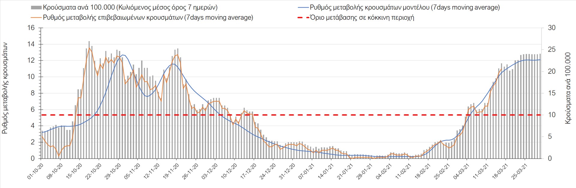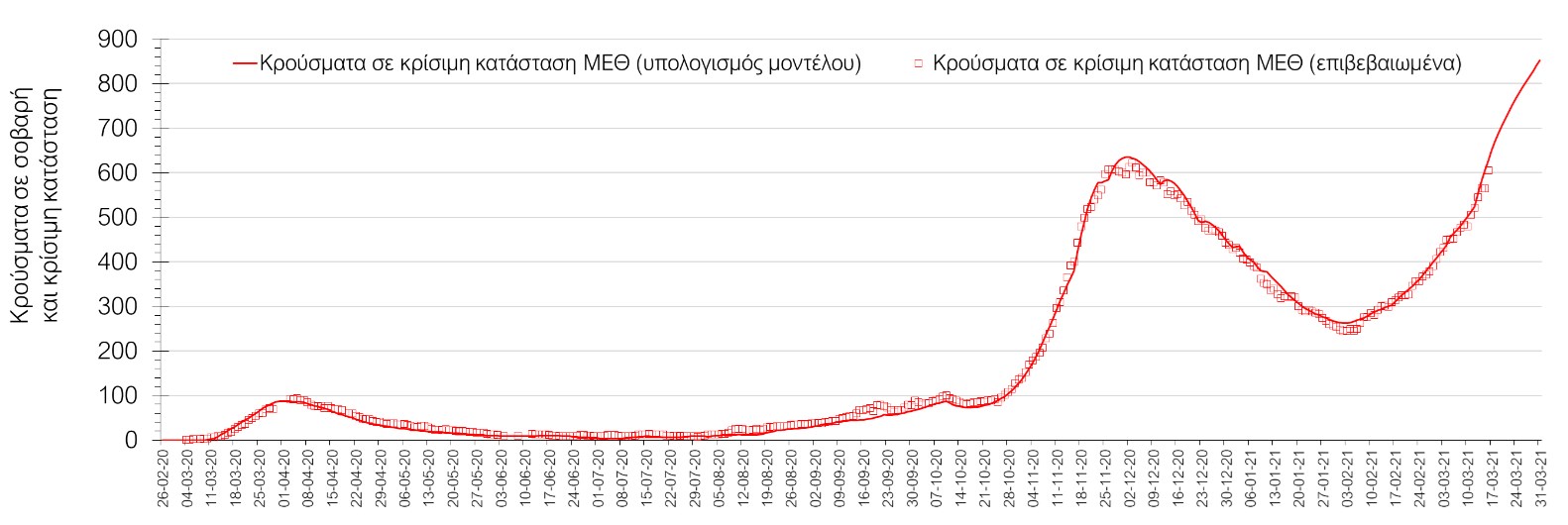 Σύμφωνα με τα στοιχεία του ΕΟΔΥ, ο αριθμός κρουσμάτων της Τρίτης ανέρχεται στα 1533 νέα κρούσματα, με τα αποτελέσματα να συνάδουν με τις προβλέψεις της υπολογιστικής πλατφόρμας CORE (n=1069), μετά την αναγκαία επαναπαραμετροποίηση του μοντέλου, έτσι ώστε να συμπεριληφθεί η πιο μεγάλη διασπορά των μεταλλαγμένων στελεχών στην κοινότητα. Ο αριθμός των τεστ που πραγματοποιήθηκαν ήταν 12.459 και σε συνδυασμό με τον αριθμό των κρουσμάτων, ο δείκτης θετικότητας έφτασε στο 12,3%. Η πραγματοποίηση αριθμού τεστ σε επίπεδα άνω των 50.000 την ημέρα (όπως και πραγματοποιείται τις τελευταίες ημέρες), συντελεί στο να εξάγουμε πιο ασφαλή συμπεράσματα σχετικά με την πορεία της πανδημίας. Γενικά όμως θα πρέπει να αυξηθεί κι άλλο ο αριθμός των τεστ ανίχνευσης του SARS-CoV-2 χρησιμοποιώντας τα rapid test για να καταπολεμηθεί η δυναμική αύξησης της διασποράς στις περιοχές όπου μια τέτοια αύξηση διαφαίνεται από τα μέχρι τώρα δεδομένα και την υπολογιστική πλατφόρμα CORE. Επειδή και την Τρίτη ο δείκτης θετικότητας παρέμεινε σε υψηλά επίπεδα, δυστυχώς επιβεβαιώνεται ότι η διασπορά των μεταλλαγμένων στην κοινότητα είναι πολύ μεγαλύτερη από αυτή που είχε αποτυπωθεί με βάση τα τελευταία διαθέσιμα δεδομένα και πραγματοποιήθηκε επαναπαραμετροποίηση του μοντέλου στα νέα δεδομένα και επικαιροποίηση των προβλέψεων, οι οποία έλαβε υπόψη επίσης την παράταση του lockdown έως και τις 29 Μαρτίου. Η παράταση είναι απόρροια της επιβαρυμένης επιδημιολογικής εικόνας, όπως αυτή αποτυπώνεται τόσο στον αριθμό των νέων κρουσμάτων που αποτυπώνονται καθημερινά, όσο και στην επιβάρυνση του συστήματος υγείας και ιδιαίτερα της πληρότητας των κλινών ΜΕΘ.Ο αριθμός θανάτων (59) είναι σημαντικά αυξημένος σε σχέση με χθες (46), και όπως είχαμε προβλέψει από την προηγούμενη εβδομάδα, ο κυλιόμενος εβδομαδιαίος μέσος όρος που είναι 50, αναμένεται να αυξηθεί περαιτέρω μέχρι και κοντά στα 80 μέχρι το τέλος Μαρτίου (σε επίπεδο μέσης εβδομαδιαίας τιμής), με δεδομένη την αύξηση του αριθμού των κρουσμάτων και την αύξηση του αριθμού των διασωληνωμένων.Όσον αφορά στους ασθενείς σε κρίσιμη κατάσταση (διασωληνωμένοι σε ΜΕΘ), ο αριθμός τους αυξήθηκε έντονα σε σχέση με χθες (605 από 564), ενώ αναμένεται να πλησιάσουν ίσως και τους 850 μέχρι το τέλος του Μαρτίου με βάση την επικαιροποιημένη πρόβλεψη, εάν συνεχιστεί ο ίδιος ρυθμός αύξησης. Η καμπύλη εξέλιξης του αριθμού των ασθενών με βάση τις προσομοιώσεις της πλατφόρμας CORE, όπως αυτή παρουσιάζεται στο Σχήμα 1, ενώ μια εκτίμηση για την πορεία των θανάτων ανά ημέρα παρουσιάζεται στο Σχήμα 2.