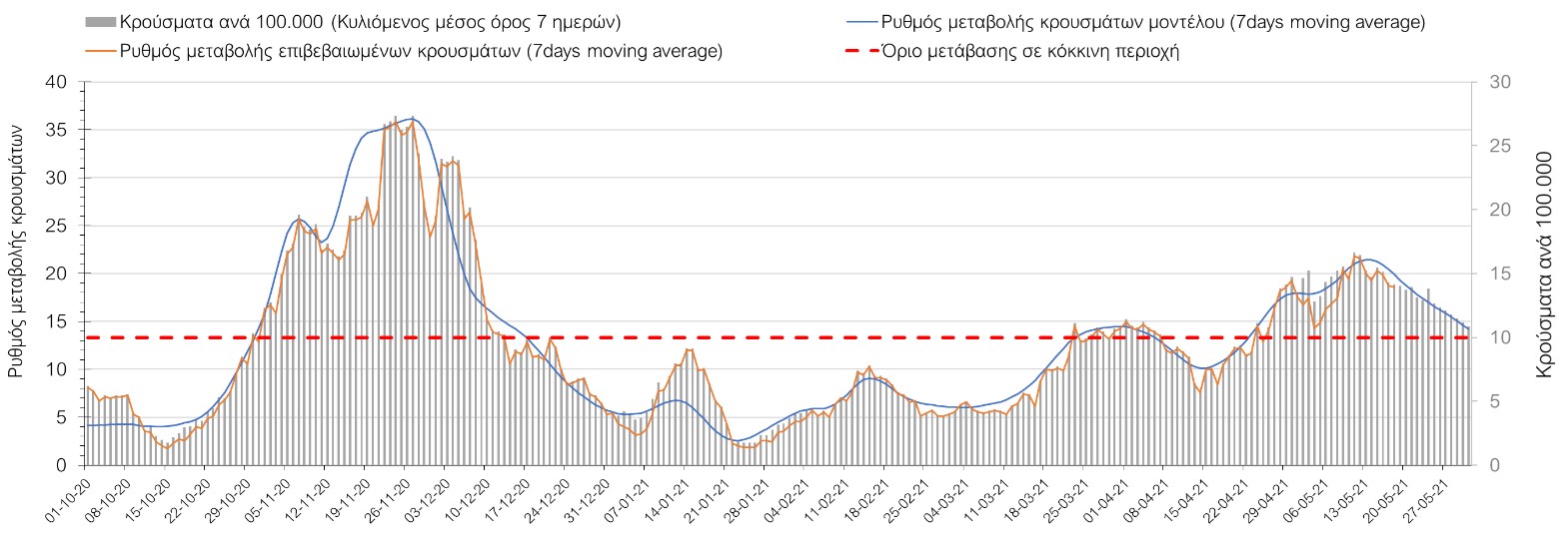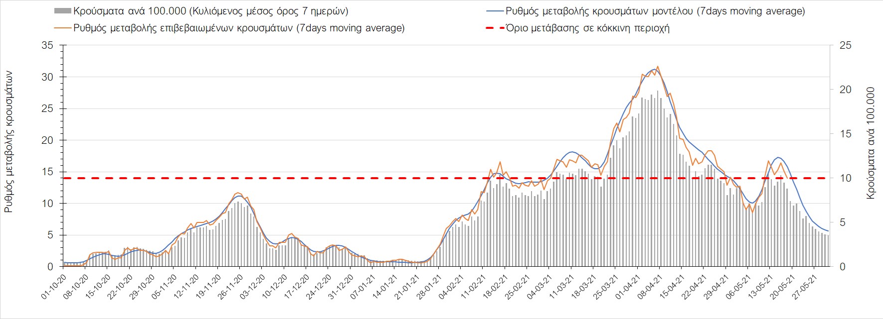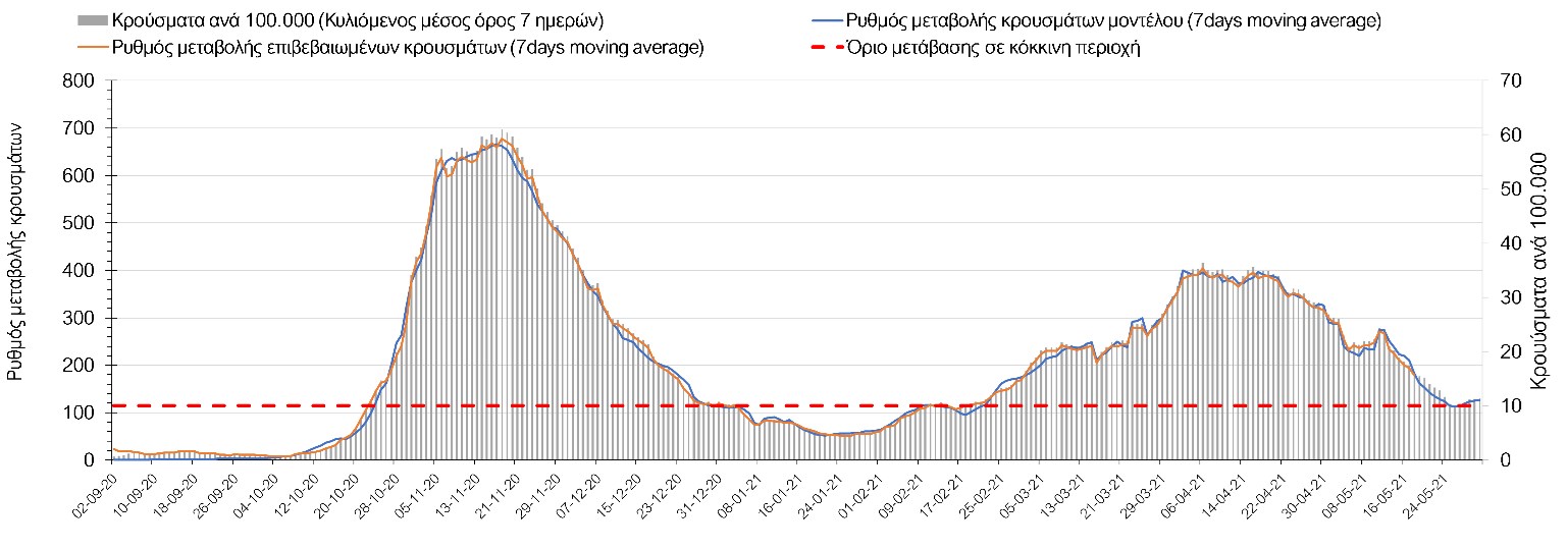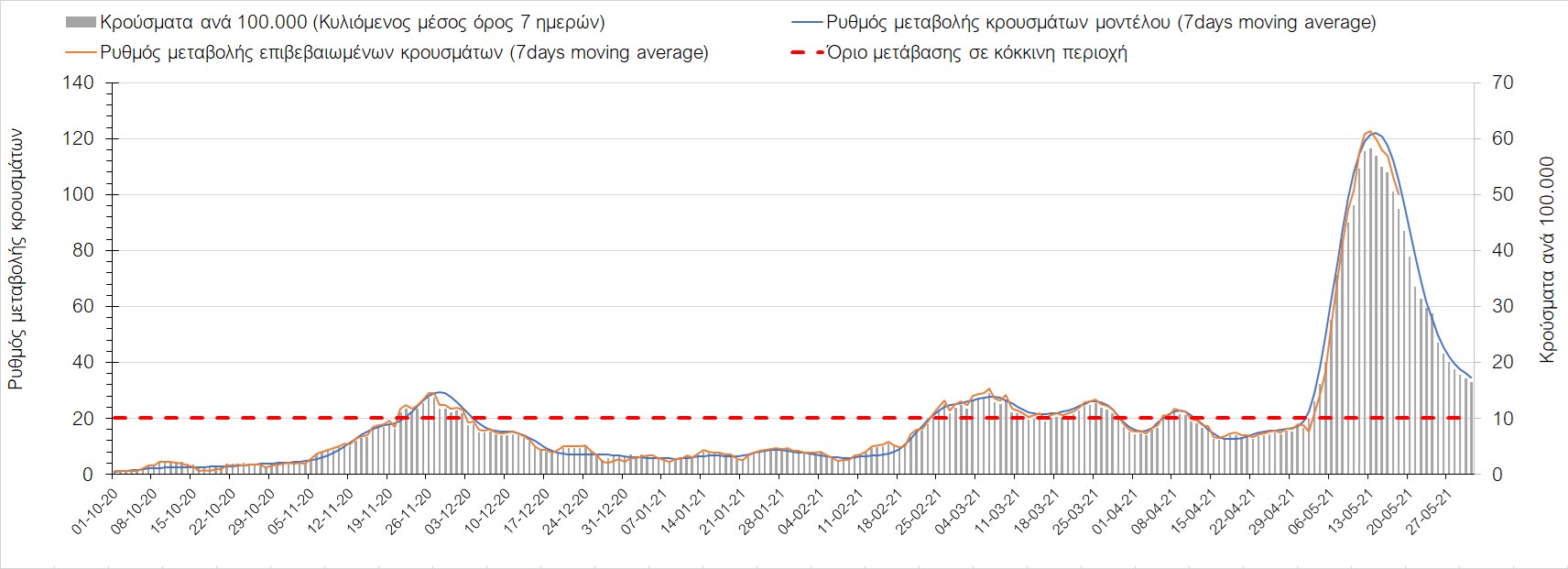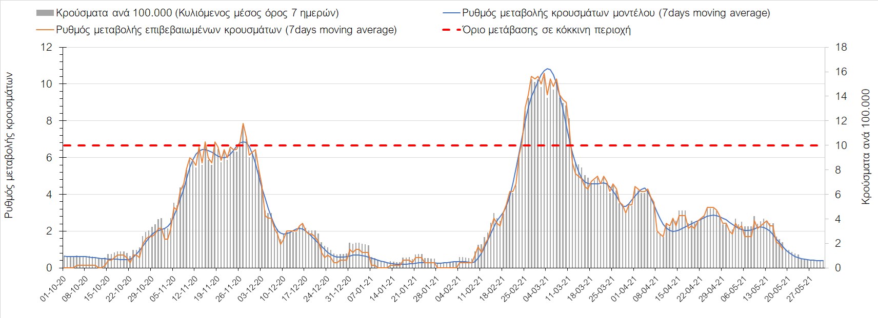 Σχήμα 52. Πορεία του ημερησίου αριθμού των κρουσμάτων (κυλιόμενος μέσος όρος 7 ημερών) στην Θάσο Συμπεράσματα:Με βάση τα αποτελέσματα, είχαμε μείωση των ασθενών σε κρίσιμη κατάσταση (διασωληνωμένοι σε ΜΕΘ) σε σχέση με προχθές, και συνεχίζει η συνολικά αργή αποκλιμάκωση, η οποία εκφράζεται και στον αριθμό των θανάτων. Οι προβλέψεις αυτές συνάδουν με τις προσομοιώσεις του μοντέλου CORE, όπως και ο αριθμός των κρουσμάτων, μετά και τις επικαιροποιημένες προβλέψεις προ 2 μηνών, όπου ελήφθη υπόψιν η μεγαλύτερη διασπορά των μεταλλαγμένων και ταχύτερα μεταδιδόμενων στελεχών. Σε πανελλαδικό επίπεδο ο κυλιόμενος εβδομαδιαίος μέσος όρος του δείκτη θετικότητας διαμορφώθηκε στο 4,2% (η ημερήσια τιμή είναι 3,99%) ενώ ο κυλιόμενος εβδομαδιαίος μέσος όρος του πραγματικού αριθμού αναπαραγωγής Rt (δηλαδή ο αριθμός των ατόμων που ένας φορέας μπορεί να επιμολύνει) διαμορφώθηκε στο 0,96 (τιμές του Rt κάτω από τη μονάδα υποδηλώνουν καθαρή μείωση της διασποράς του ιού στην κοινότητα). Η ταυτόχρονη αύξηση και των δύο δεικτών, που παρατηρήθηκε την εβδομάδα μετά του Πάσχα, υποδηλώνει την συνολικά αυξητική πορεία στο συνολικό αριθμό κρουσμάτων στη χώρα από την Πέμπτη του Πάσχα και έπειτα. Με βάση τα αποτελέσματα, βλέπουμε ότι οι ανοδικές τάσεις διαφόρων περιοχών οι οποίες χρονικά συνάδουν με αύξηση επαφών τις ημέρες του Πάσχα, έχουν περιέλθει σε κάμψη. Παρόλο που την προηγούμενη εβδομάδα παρατηρήθηκε μείωση και των δύο δεικτών, είναι σημαντικό να διατηρηθεί ο υψηλός αριθμός των τεστ ανίχνευσης, έτσι ώστε να μπορούμε να έχουμε καλή εικόνα της διασποράς της πανδημίας στις επόμενες ημέρες, όπου συνδυάζονται με τα πιο πρόσφατα ανοίγματα (εστίαση, άνοιγμα Δημοτικών και Γυμνασίων). Όπως ήδη αναφέρθηκε, αναμένεται στις επόμενες ημέρες μια προσωρινή αύξηση του αριθμού των κρουσμάτων, η οποία θα οδηγήσει σε ένα μέγιστο περί τα 2500 κρούσματα/ημέρα (κυλιόμενος εβδομαδιαίος μέσος όρος) στο τέλος Μαΐου (γύρω στις 26 Μαΐου). Μετά από το χρονικό αυτό σημείο και με δεδομένο τον υψηλό ρυθμό εμβολιασμού και μαζική χρήση self test προβλέπεται μια καθαρή πτώση των κρουσμάτων και αποκλιμάκωση της πανδημίας που θα μας οδηγήσει στα περίπου 1000 κρούσματα/ημέρα (ως κυλιόμενος εβδομαδιαίος Μ.Ο.) γύρω στις 25 Ιουνίου και στα 750 κρούσματα/ημέρα την 1η Ιουλίου.Η ήπια αναχαίτιση του 3ου κύματος που παρατηρούνταν μέχρι και τις ημέρες του Πάσχα, οφείλονταν σε ένα συνδυασμό παραμέτρων, οι οποίες είναι η συνέχιση του lockdown, η χρήση των self-test, η αύξηση του αριθμού των τεστ από τον ΕΟΔΥ, γεγονός που συντελεί στην απομάκρυνση από τις αλυσίδες μετάδοσης των ασυμπτωματικών και προσυμπτωματικών φορέων, η προοδευτική βελτίωση του καιρού και σε μικρότερο βαθμό η πρόοδος των εμβολιασμών, η σημασία των οποίων στον έλεγχο της πανδημίας θα αρχίσει να είναι πιο εμφανής από το τέλος του επόμενου μήνα, ιδιαίτερα λαμβάνοντας υπόψιν τη σημαντική αύξηση του ρυθμού εμβολιασμού, με περίπου 110.000 εμβολιασμούς ημερησίως. Όμως, με δεδομένο το άνοιγμα του λιανικού εμπορίου και όλων των εκπαιδευτικών βαθμίδων πλέον, είναι ακόμα πιο σημαντική η τήρηση των μέτρων, ενώ ύψιστης σημασίας στις επόμενες εβδομάδες θα αποδειχθεί η ορθή και μαζική εφαρμογή των self-test, με ταυτόχρονη αύξηση της ιχνηλασίας των επαφών των ανιχνευθέντων ως θετικοί και καραντίνα 14 ημερών για τους συμπολίτες μας που θα επιβεβαιωθεί ότι είναι θετικοί στην μόλυνση με 