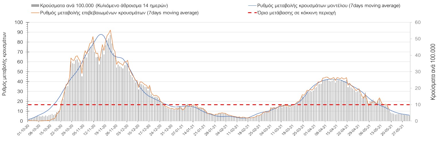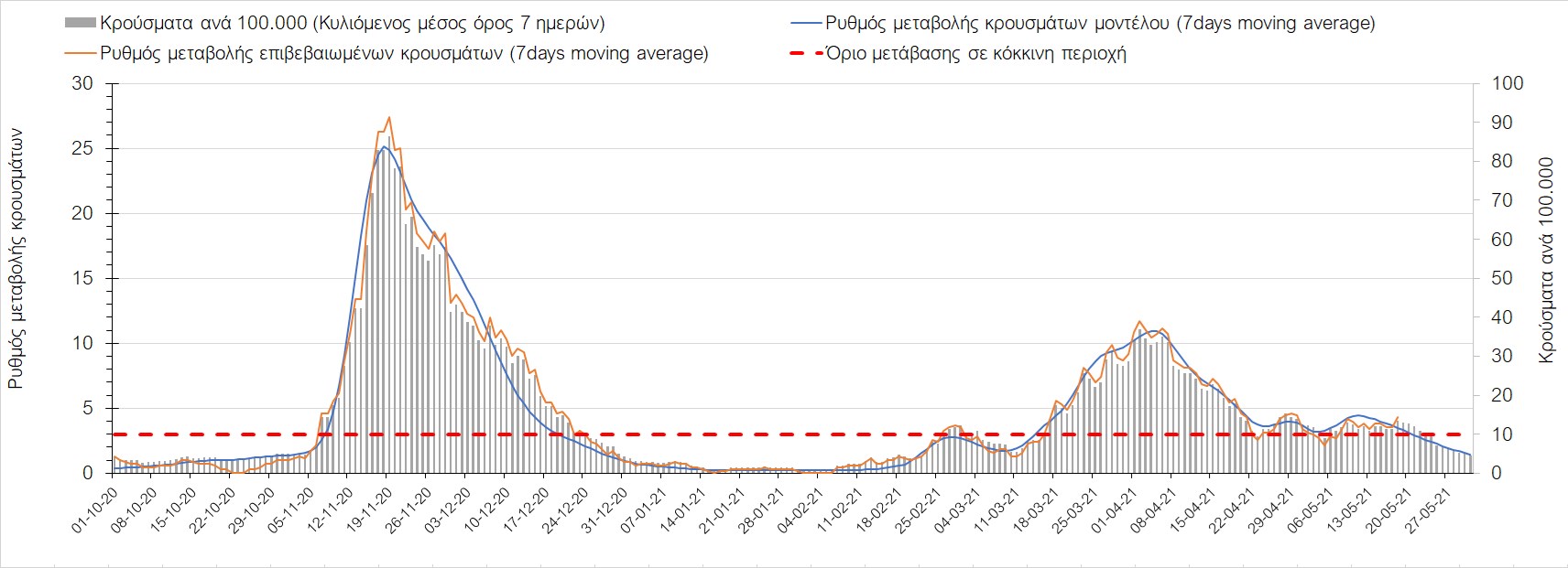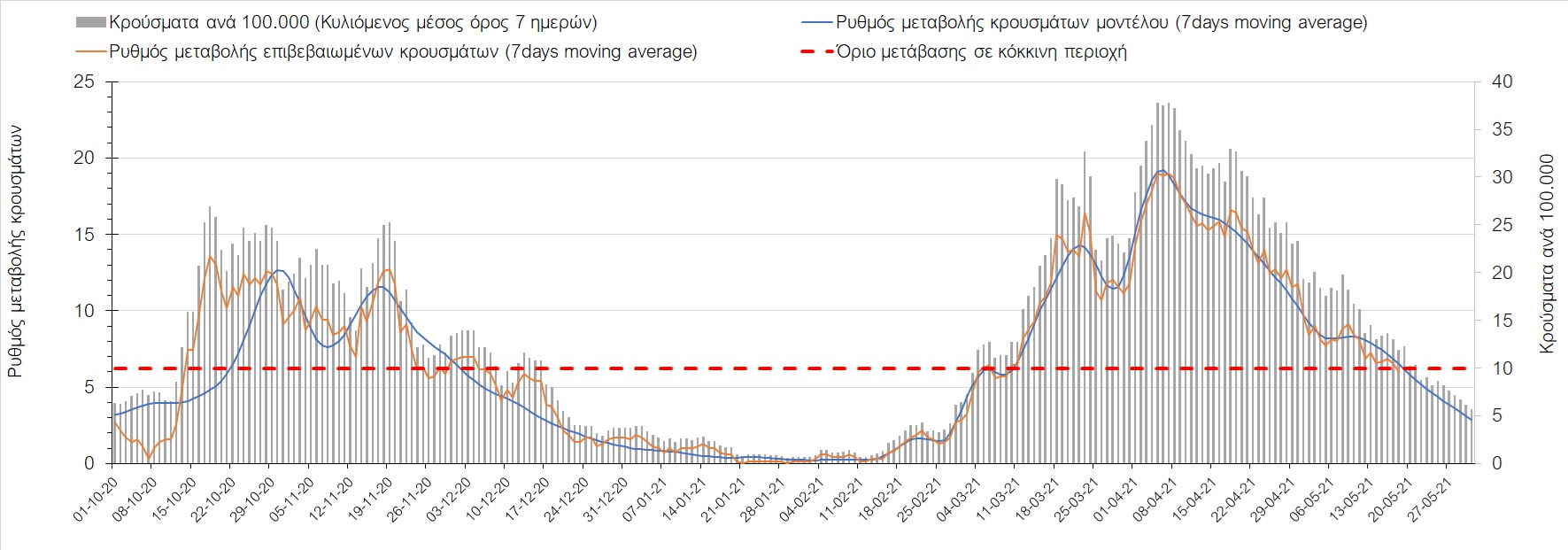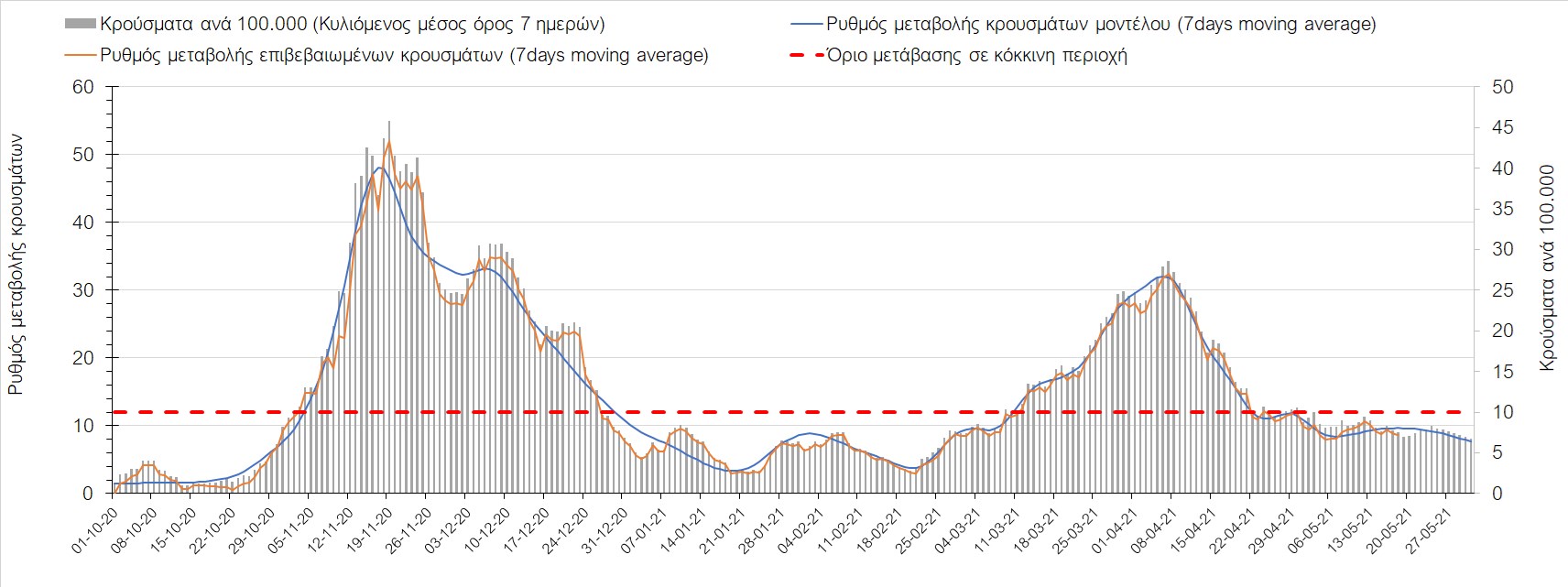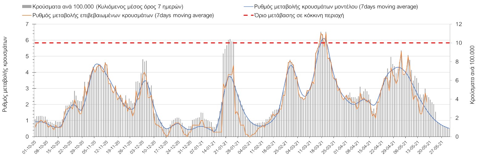 Σχήμα 52. Πορεία του ημερησίου αριθμού των κρουσμάτων (κυλιόμενος μέσος όρος 7 ημερών) στην Θάσο Συμπεράσματα:Με βάση τα αποτελέσματα, είχαμε μείωση των ασθενών σε κρίσιμη κατάσταση (διασωληνωμένοι σε ΜΕΘ) σε σχέση με προχθές, και συνεχίζει η συνολικά αργή αποκλιμάκωση, η οποία εκφράζεται και στον αριθμό των θανάτων. Οι προβλέψεις αυτές συνάδουν με τις προσομοιώσεις του μοντέλου CORE, όπως και ο αριθμός των κρουσμάτων, μετά και τις επικαιροποιημένες προβλέψεις προ 2 μηνών, όπου ελήφθη υπόψιν η μεγαλύτερη διασπορά των μεταλλαγμένων και ταχύτερα μεταδιδόμενων στελεχών. Σε πανελλαδικό επίπεδο ο κυλιόμενος εβδομαδιαίος μέσος όρος του δείκτη θετικότητας διαμορφώθηκε στο 4,2% (η ημερήσια τιμή είναι 3,99%) ενώ ο κυλιόμενος εβδομαδιαίος μέσος όρος του πραγματικού αριθμού αναπαραγωγής Rt (δηλαδή ο αριθμός των ατόμων που ένας φορέας μπορεί να επιμολύνει) διαμορφώθηκε στο 0,96 (τιμές του Rt κάτω από τη μονάδα υποδηλώνουν καθαρή μείωση της διασποράς του ιού στην κοινότητα). Η ταυτόχρονη αύξηση και των δύο δεικτών, που παρατηρήθηκε την εβδομάδα μετά του Πάσχα, υποδηλώνει την συνολικά αυξητική πορεία στο συνολικό αριθμό κρουσμάτων στη χώρα από την Πέμπτη του Πάσχα και έπειτα. Με βάση τα αποτελέσματα, βλέπουμε ότι οι ανοδικές τάσεις διαφόρων περιοχών οι οποίες χρονικά συνάδουν με αύξηση επαφών τις ημέρες του Πάσχα, έχουν περιέλθει σε κάμψη. Παρόλο που την προηγούμενη εβδομάδα παρατηρήθηκε μείωση και των δύο δεικτών, είναι σημαντικό να διατηρηθεί ο υψηλός αριθμός των τεστ ανίχνευσης, έτσι ώστε να μπορούμε να έχουμε καλή εικόνα της διασποράς της πανδημίας στις επόμενες ημέρες, όπου συνδυάζονται με τα πιο πρόσφατα ανοίγματα (εστίαση, άνοιγμα Δημοτικών και Γυμνασίων). Όπως ήδη αναφέρθηκε, αναμένεται στις επόμενες ημέρες μια προσωρινή αύξηση του αριθμού των κρουσμάτων, η οποία θα οδηγήσει σε ένα μέγιστο περί τα 2500 κρούσματα/ημέρα (κυλιόμενος εβδομαδιαίος μέσος όρος) στο τέλος Μαΐου (γύρω στις 26 Μαΐου). Μετά από το χρονικό αυτό σημείο και με δεδομένο τον υψηλό ρυθμό εμβολιασμού και μαζική χρήση self test προβλέπεται μια καθαρή πτώση των κρουσμάτων και αποκλιμάκωση της πανδημίας που θα μας οδηγήσει στα περίπου 1000 κρούσματα/ημέρα (ως κυλιόμενος εβδομαδιαίος Μ.Ο.) γύρω στις 25 Ιουνίου και στα 750 κρούσματα/ημέρα την 1η Ιουλίου.Η ήπια αναχαίτιση του 3ου κύματος που παρατηρούνταν μέχρι και τις ημέρες του Πάσχα, οφείλονταν σε ένα συνδυασμό παραμέτρων, οι οποίες είναι η συνέχιση του lockdown, η χρήση των self-test, η αύξηση του αριθμού των τεστ από τον ΕΟΔΥ, γεγονός που συντελεί στην απομάκρυνση από τις αλυσίδες μετάδοσης των ασυμπτωματικών και προσυμπτωματικών φορέων, η προοδευτική βελτίωση του καιρού και σε μικρότερο βαθμό η πρόοδος των εμβολιασμών, η σημασία των οποίων στον έλεγχο της πανδημίας θα αρχίσει να είναι πιο εμφανής από το τέλος του επόμενου μήνα, ιδιαίτερα λαμβάνοντας υπόψιν τη σημαντική αύξηση του ρυθμού εμβολιασμού, με περίπου 110.000 εμβολιασμούς ημερησίως. Όμως, με δεδομένο το άνοιγμα του λιανικού εμπορίου και όλων των εκπαιδευτικών βαθμίδων πλέον, είναι ακόμα πιο σημαντική η τήρηση των μέτρων, ενώ ύψιστης σημασίας στις επόμενες εβδομάδες θα αποδειχθεί η ορθή και μαζική εφαρμογή των self-test, με ταυτόχρονη αύξηση της ιχνηλασίας των επαφών των ανιχνευθέντων ως θετικοί και καραντίνα 14 ημερών για τους συμπολίτες μας που θα επιβεβαιωθεί ότι είναι θετικοί στην μόλυνση με 