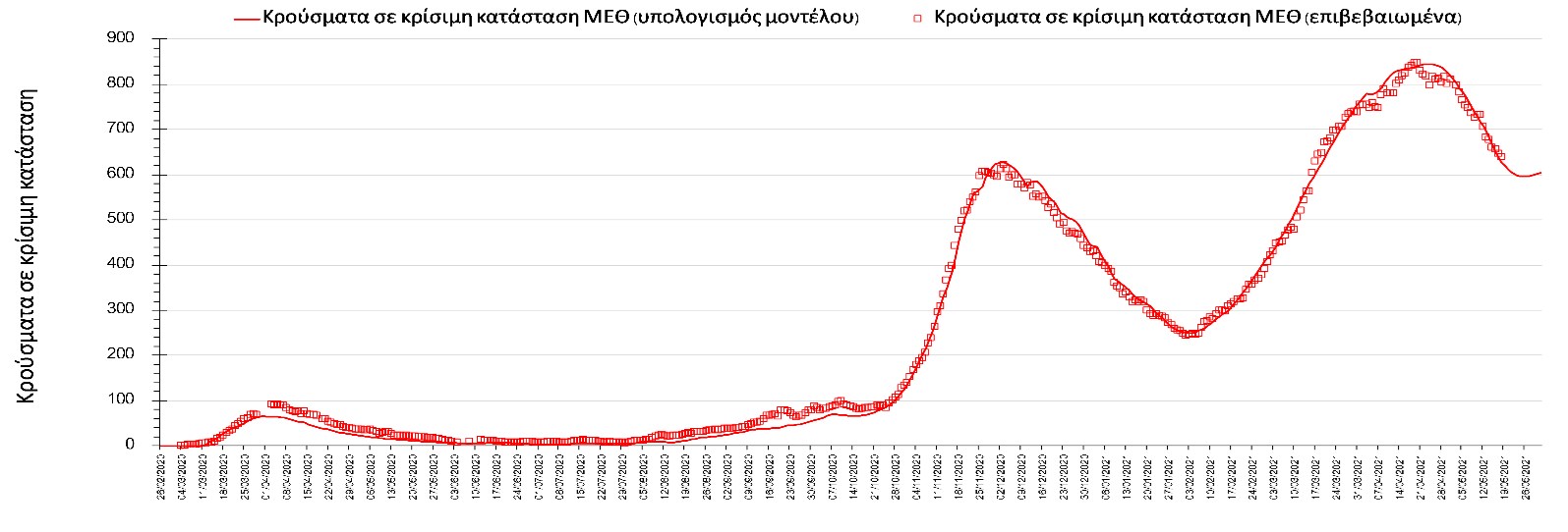 Σχήμα 1. Αριθμός κρουσμάτων σε κρίσιμη κατάσταση (ΜΕΘ) σύμφωνα με τα στοιχεία του ΕΟΔΥ και τις προβλέψεις της υπολογιστικής πλατφόρμας CORE.