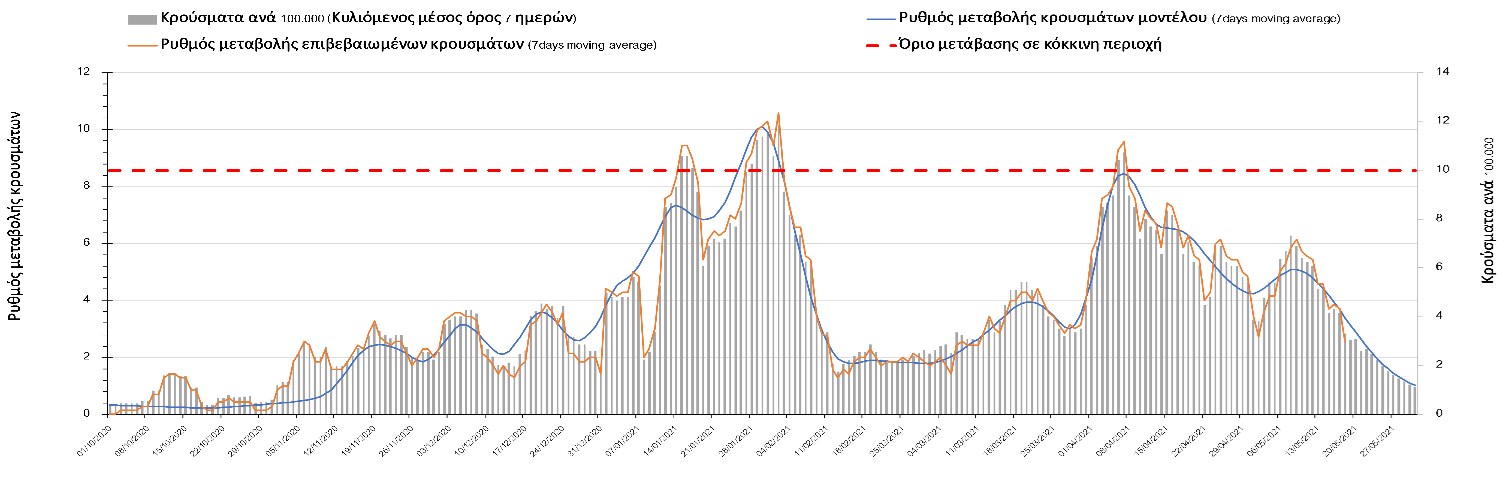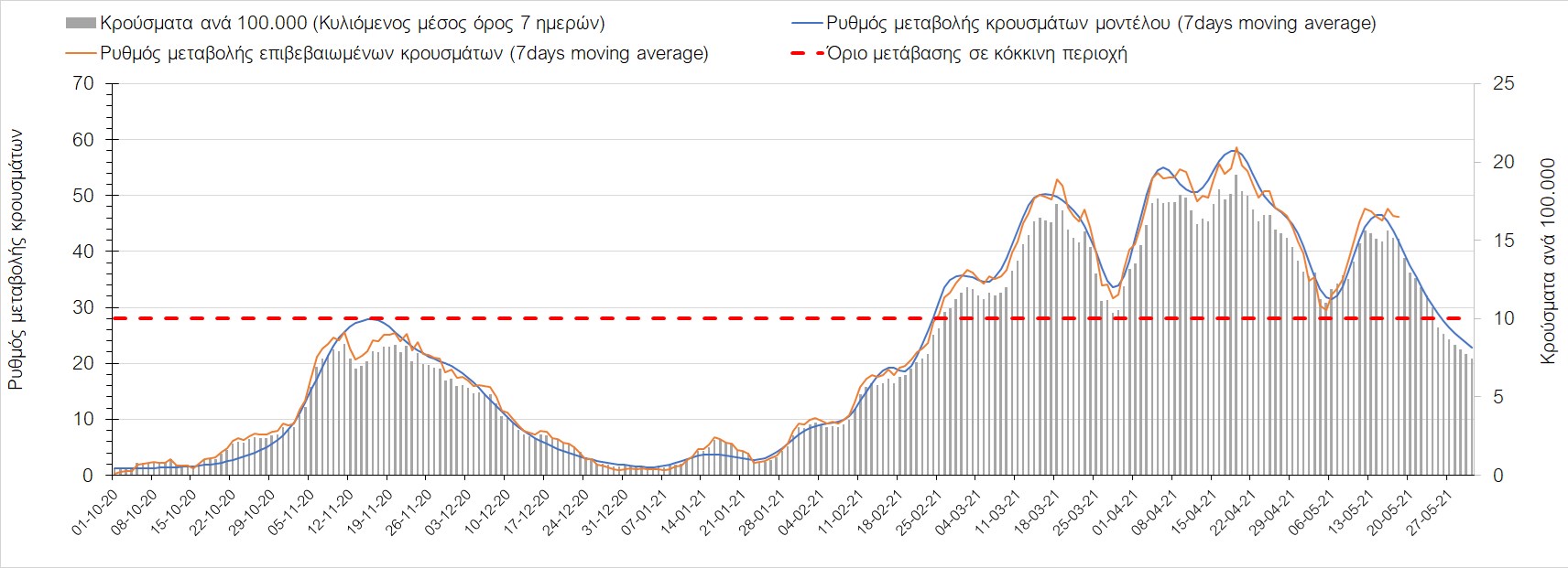 Με δεδομένη την αβεβαιότητα που αφορά κυρίως τις δύο πρώτες παραδοχές, οι προβλέψεις μας θα επαναεπικαιροποιούνται εάν παρατηρήσουμε αποκλίσεις που δε θα επιβεβαιώνουν την αναμενόμενη πορεία.Όπως φαίνεται από το διάγραμμα, από τις 8 Απριλίου, είχε ξεκινήσει αποκλιμάκωση του αριθμού των κρουσμάτων, η οποία επιταχύνθηκε μετά τις 19 Απριλίου, ως αποτέλεσμα του συνδυασμού των self-test, του αυξημένου αριθμού των τεστ ανίχνευσης που πραγματοποιούνται από τον ΕΟΔΥ, την αύξηση της θερμοκρασίας και φυσικά της συνέχισης του lockdown. Όπως ήδη αναφέραμε, λόγω του ανοίγματος δραστηριοτήτων και των συρροών του Πάσχα, παρατηρείται ήδη μια ταχεία ανάσχεση της πτωτικής πορείας, όπως είχε προβλεφθεί από το μοντέλο CORE. Πάντως, αξίζει για άλλη μια φορά να αναφερθεί, ότι για να μπορέσουμε να προχωρήσουμε σε άρση των περιοριστικών μέτρων για οικονομικές, εκπαιδευτικές και πολιτιστικές/αθλητικές δραστηριότητες, θα πρέπει να δημιουργήσουμε την κατάλληλη υποδομή ώστε να μπορέσουμε να αναχαιτίσουμε την υπερμετάδοση των μεταλλαγμένων στελεχών εκεί όπου συμβαίνει κατά το μάλλον, δηλαδή στους τόπους εργασίας και τα μέσα μαζικής μεταφοράς, ενώ πλέον με τα υπάρχοντα και διαφαινόμενα ανοίγματα ιδιαίτερη προσοχή χρειάζεται να δοθεί και στους χώρους εστίασης αλλά και στα σχολεία. Στα συμπεράσματα προτείνονται σχετικές λύσεις.