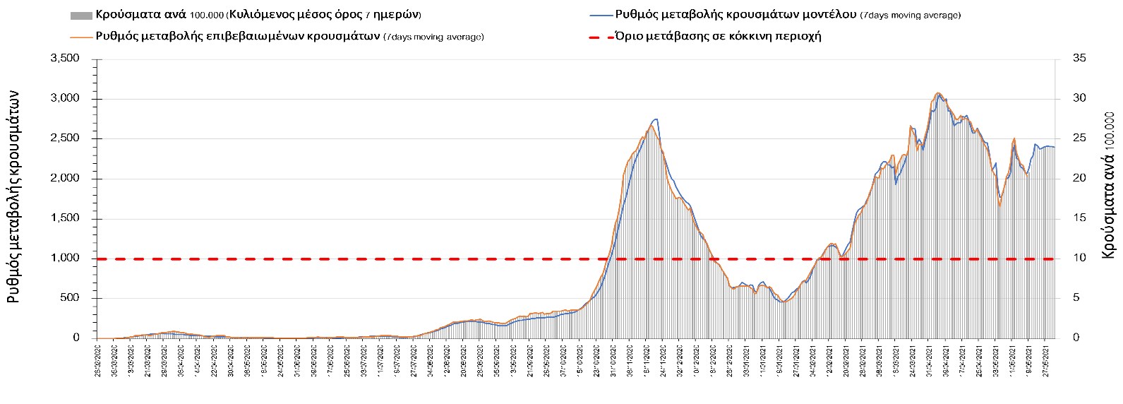 Σχήμα 46. Πορεία του ημερησίου αριθμού των κρουσμάτων (κυλιόμενος μέσος όρος 7