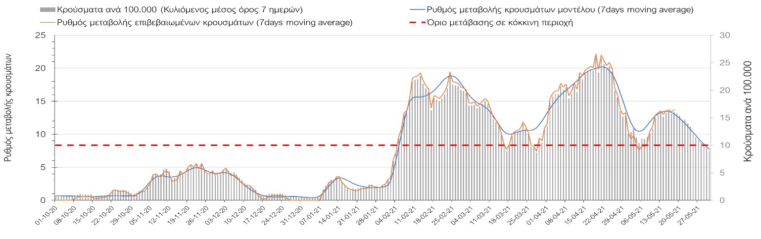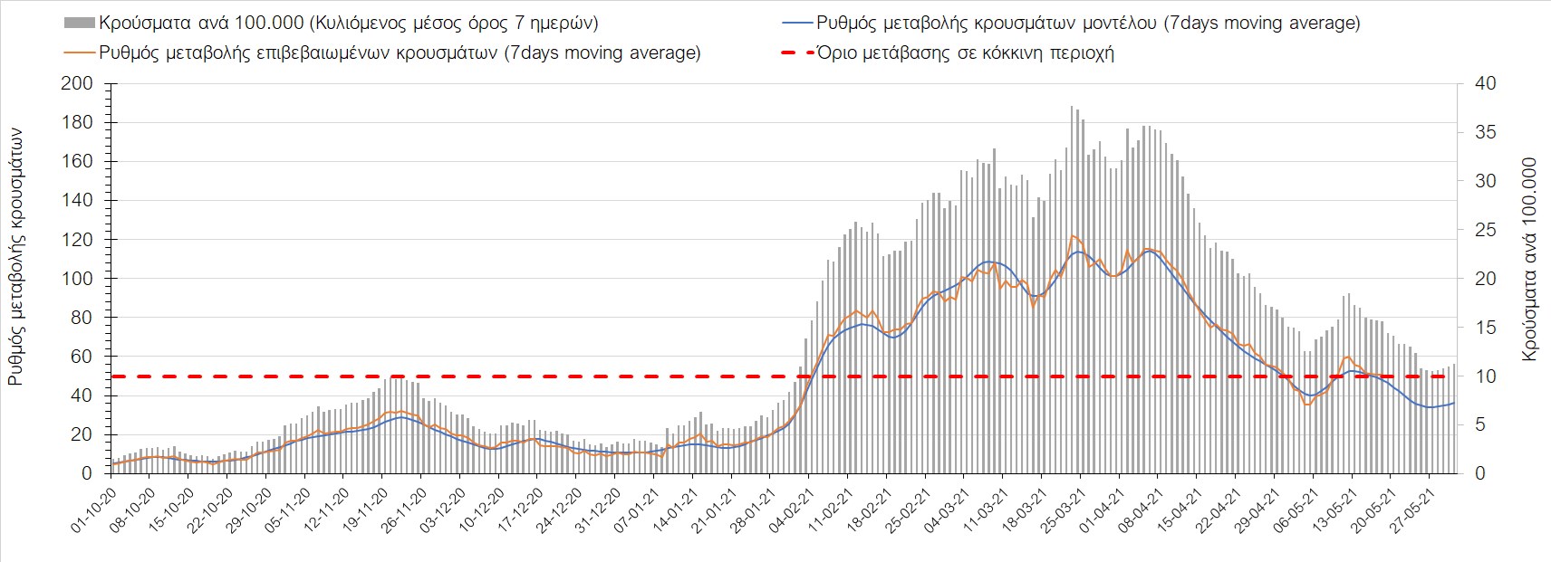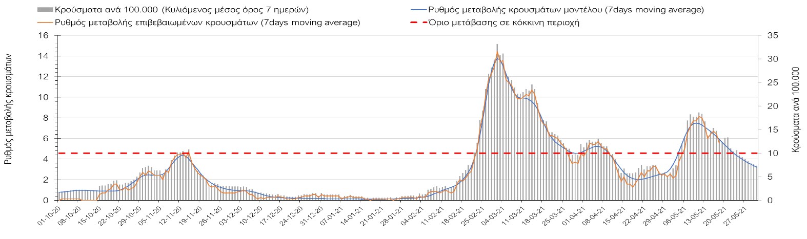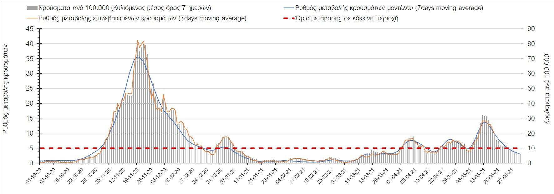 Σχήμα 44. Πορεία του ημερησίου αριθμού των κρουσμάτων (κυλιόμενος μέσος όρος 7 ημερών) στον ΈβροΣτο Ηράκλειο, όπου εντοπίστηκαν 53 κρούσματα παρατηρείται αύξηση σε σχέση με προχθές (Σχήμα 45). Λόγω των έντονων διακυμάνσεων που σημειώθηκαν στην πορεία της πανδημίας ως αποτέλεσμα του πολύ μεγάλου αριθμού φορέων του μεταλλαγμένου στελέχους Β.1.1.7, το Ηράκλειο είχε μεγάλη διασπορά του ιού και αυτή η δυναμική καθυστέρησε τον αποχαρακτηρισμό της περιοχής ως κόκκινη, όμως το επιπλέον ανοδικό κύμα που διαμορφώθηκε τις τελευταίες ημέρες και μάλλον οφείλεται σε αυξημένες συρροές λόγω του Πάσχα, έχει αρχίσει να αποκλιμακώνεται άμεσα, σύμφωνα με τις προβλέψεις. Στα Χανιά με 37 κρούσματα (Σχήμα 46) έχουμε αύξηση σε σχέση με προχθές, και υπάρχουν έντονες διακυμάνσεις (με ένα επιπλέον ανοδικό κύμα που οφείλεται σε συρροές των ημερών του Πάσχα) που δυσχεραίνουν τη συστηματική αποκλιμάκωση. Τα Χανιά θα παραμείνουν ανάμεσα στις κόκκινες περιοχές και μετά τις 20 Μαΐου. Αύξηση κρουσμάτων παρατηρείται στο Ρέθυμνο με 17 κρούσματα, στο οποίο η προ 15 ημερών έντονα ανοδική τάση, είχε περιέλθει σε πορεία ισχυρής αποκλιμάκωσης (Σχήμα 47), όμως η μικρή ανοδική τάση που έχει διαμορφωθεί, έχει φέρει την περιοχή ξανά πάνω από το όριο του χαρακτηρισμού ως κόκκινη. Στο Λασίθι παρατηρείται αύξηση σε σχέση με προχθές, καθώς εντοπίστηκαν 7 κρούσματα και παρατηρούνται έντονες διακυμάνσεις (Σχήμα 48), οι οποίες επανάφεραν την περιφερειακή ενότητα κοντά στο όριο της κόκκινης περιοχής.