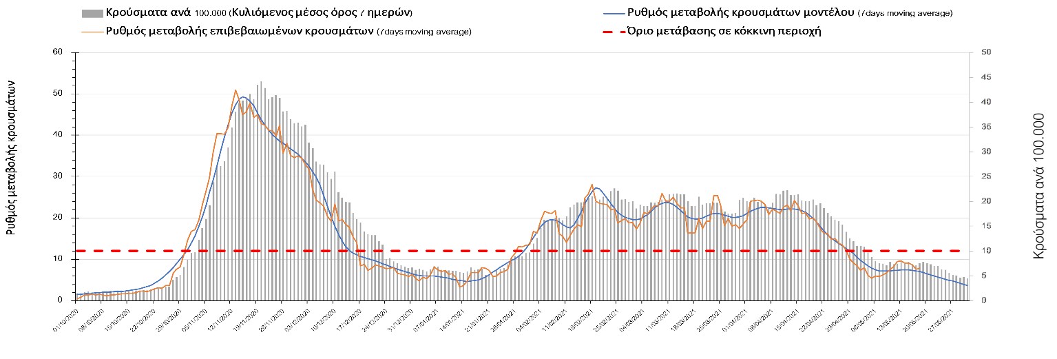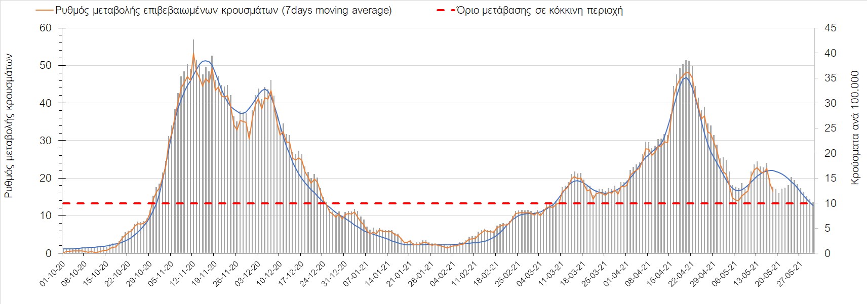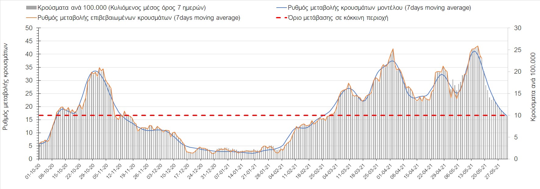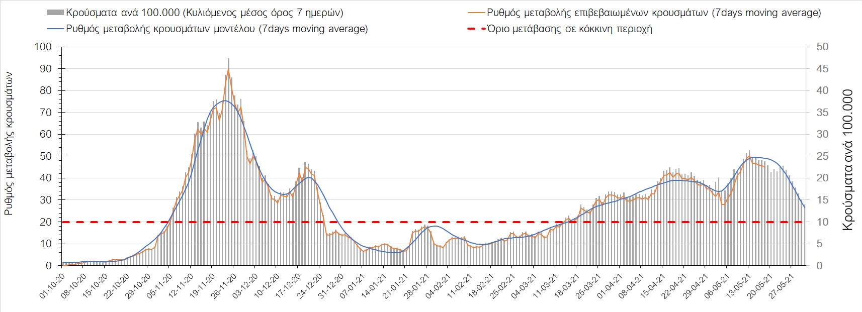 Σχήμα 44. Πορεία του ημερησίου αριθμού των κρουσμάτων (κυλιόμενος μέσος όρος 7 ημερών) στον ΈβροΣτο Ηράκλειο, όπου εντοπίστηκαν 53 κρούσματα παρατηρείται αύξηση σε σχέση με προχθές (Σχήμα 45). Λόγω των έντονων διακυμάνσεων που σημειώθηκαν στην πορεία της πανδημίας ως αποτέλεσμα του πολύ μεγάλου αριθμού φορέων του μεταλλαγμένου στελέχους Β.1.1.7, το Ηράκλειο είχε μεγάλη διασπορά του ιού και αυτή η δυναμική καθυστέρησε τον αποχαρακτηρισμό της περιοχής ως κόκκινη, όμως το επιπλέον ανοδικό κύμα που διαμορφώθηκε τις τελευταίες ημέρες και μάλλον οφείλεται σε αυξημένες συρροές λόγω του Πάσχα, έχει αρχίσει να αποκλιμακώνεται άμεσα, σύμφωνα με τις προβλέψεις. Στα Χανιά με 37 κρούσματα (Σχήμα 46) έχουμε αύξηση σε σχέση με προχθές, και υπάρχουν έντονες διακυμάνσεις (με ένα επιπλέον ανοδικό κύμα που οφείλεται σε συρροές των ημερών του Πάσχα) που δυσχεραίνουν τη συστηματική αποκλιμάκωση. Τα Χανιά θα παραμείνουν ανάμεσα στις κόκκινες περιοχές και μετά τις 20 Μαΐου. Αύξηση κρουσμάτων παρατηρείται στο Ρέθυμνο με 17 κρούσματα, στο οποίο η προ 15 ημερών έντονα ανοδική τάση, είχε περιέλθει σε πορεία ισχυρής αποκλιμάκωσης (Σχήμα 47), όμως η μικρή ανοδική τάση που έχει διαμορφωθεί, έχει φέρει την περιοχή ξανά πάνω από το όριο του χαρακτηρισμού ως κόκκινη. Στο Λασίθι παρατηρείται αύξηση σε σχέση με προχθές, καθώς εντοπίστηκαν 7 κρούσματα και παρατηρούνται έντονες διακυμάνσεις (Σχήμα 48), οι οποίες επανάφεραν την περιφερειακή ενότητα κοντά στο όριο της κόκκινης περιοχής.