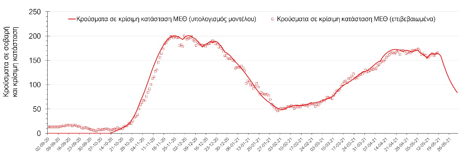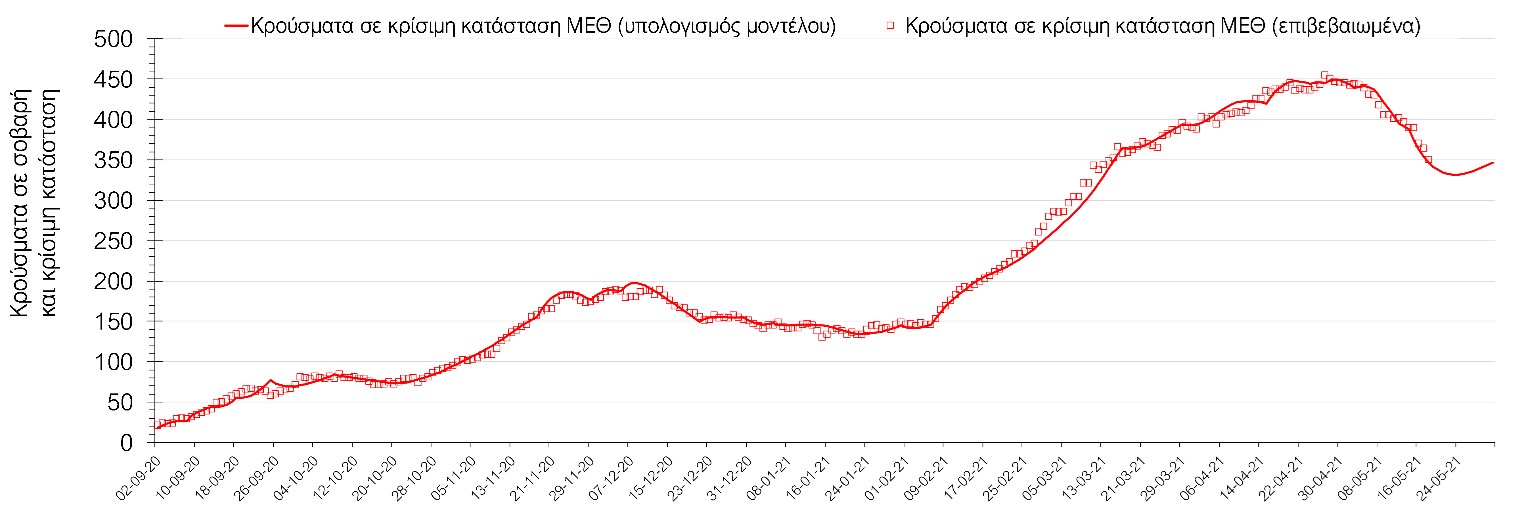 Σχήμα 6. Αριθμός κρουσμάτων σε κρίσιμη κατάσταση (ΜΕΘ) σύμφωνα με τα στοιχεία του ΕΟΔΥ και τις προβλέψεις της υπολογιστικής πλατφόρμας CORE στην ΑθήναΑυτό που προβλημάτιζε ιδιαίτερα μέχρι και την προηγούμενη εβδομάδα στην Αττική ήταν η συνεχής αύξηση του αριθμού των διασωληνωμένων. Πλέον, παρατηρείται πορεία αποκλιμάκωσης των ΜΕΘ, σε ρυθμό που ακολουθεί την προβλεπόμενη από το μοντέλο. Αντίθετα, στη Θεσσαλονίκη, παρατηρείται αυξημένος αριθμός διασωληνωμένων (Σχήμα 8) σε σχέση με τα κρούσματα (Σχήμα 7), και αναμένουμε να ξεκινήσει άμεση πορεία αποκλιμάκωσης των αναγκών σε ΜΕΘ και διασωλήνωση ασθενών όπως προβλέπεται από το μοντέλο. Η πορεία της διασποράς στη Θεσσαλονίκη (Σχήμα 7), αν και στις αρχές Μαρτίου ακολουθούσε τη σχετικά ήπια αύξηση που αναμέναμε, με τα δεδομένα των 395 νέων κρουσμάτων στις 9/3, των 394 στις 17/3 των 535 στις 30/3 μας έχουν οδηγήσει σε αναθεώρηση των προβλέψεων λόγω της επίσης μεγαλύτερη παρουσίας των μεταλλαγμένων στελεχών. Σύμφωνα με τις αναθεωρημένες εκτιμήσεις, αναμένεται να συνεχίσει η αργή αποκλιμάκωση των κρουσμάτων που ξεκίνησε από τις 21 Απριλίου. Η πορεία των κρουσμάτων σε κρίσιμη κατάσταση (διασωληνωμένοι σε ΜΕΘ) στη Θεσσαλονίκη, παρουσιάζονται στο Σχήμα 8.