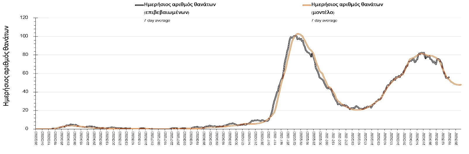 Σχήμα 3. Αριθμός θανάτων (κυλιόμενος μέσος όρος 7 ημερών) σύμφωνα με τα στοιχεία του ΕΟΔΥ και τις προβλέψεις της υπολογιστικής πλατφόρμας CORE.Η πορεία της μέσης εβδομαδιαίας τιμής των κρουσμάτων, καθώς και του κυλιόμενου μέσου όρου 7 ημερών του αριθμού των κρουσμάτων ανά 100.000 πληθυσμού, όπως έχουν καταγραφεί από τον ΕΟΔΥ και η αναμενόμενη πορεία τους όπως προδιαγράφεται από την υπολογιστική πλατφόρμα CORE για την Ελληνική επικράτεια μέχρι τις 31 Μαΐου, αποτυπώνονται στο Σχήμα 4. Με βάση το συνδυασμένο άνοιγμα της εστίασης στις 3 Μαΐου, και των προβλεπόμενων βαθμίδων εκπαίδευσης (Δημοτικά και Γυμνάσια) στις 10 Μαΐου, αναμένουμε την επιβράδυνση της πορεία αποκλιμάκωσης, με σημαντική πιθανότητα να υπάρξει και ένα μικρό ανοδικό κύμα το τελευταίο δεκαήμερο του Μαΐου. Με βάση την επικαιροποιημένη πρόβλεψη που πραγματοποιήσαμε, σύμφωνα με τον αριθμό των κρουσμάτων που παρατηρείται αυτές τις ημέρες, το ύψος του ανοδικού κύματος υπολογίζεται να επαναφέρει τον ημερήσιο αριθμό των κρουσμάτων γύρω στα 2500 πριν την αποκλιμάκωση του. Αυτό θα εξαρτηθεί από το βαθμό συμμόρφωσης στα μέτρα περιορισμού της πανδημίας. Πρέπει επίσης να σημειωθεί, ότι με βάση την επικαιροποιημένη ανάλυση των δεδομένων διασποράς της πανδημίας στη χώρα, παρατηρήθηκε αύξηση των ενεργών επαφών τις τελευταίες ημέρες του Απριλίου. Αυτές μπορούν να οφείλονται στο άνοιγμα των μεγάλων εμπορικών κέντρων (να σημειωθεί ότι έγινε χωρίς την εγκατάσταση συσκευών απολύμανσης του αέρα αν και πρόκειται για εσωτερικούς χώρους με ανάγκη τεχνητού εξαερισμού) και στην κίνηση της αγοράς λόγω του Πάσχα, αλλά και στις αυξημένες κοινωνικές επαφές κατά τη διάρκεια των εορτών του Πάσχα. Αυτή η προβλεπόμενη πορεία, που αφορά τα κρούσματα, τους νοσηλευόμενους σε απλές κλίνες, όσο και σε ΜΕΘ, καθώς επίσης και τους θανάτους, βασίζεται στις ακόλουθες παραδοχές: