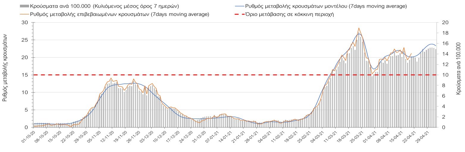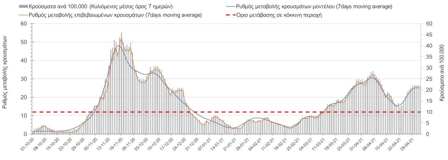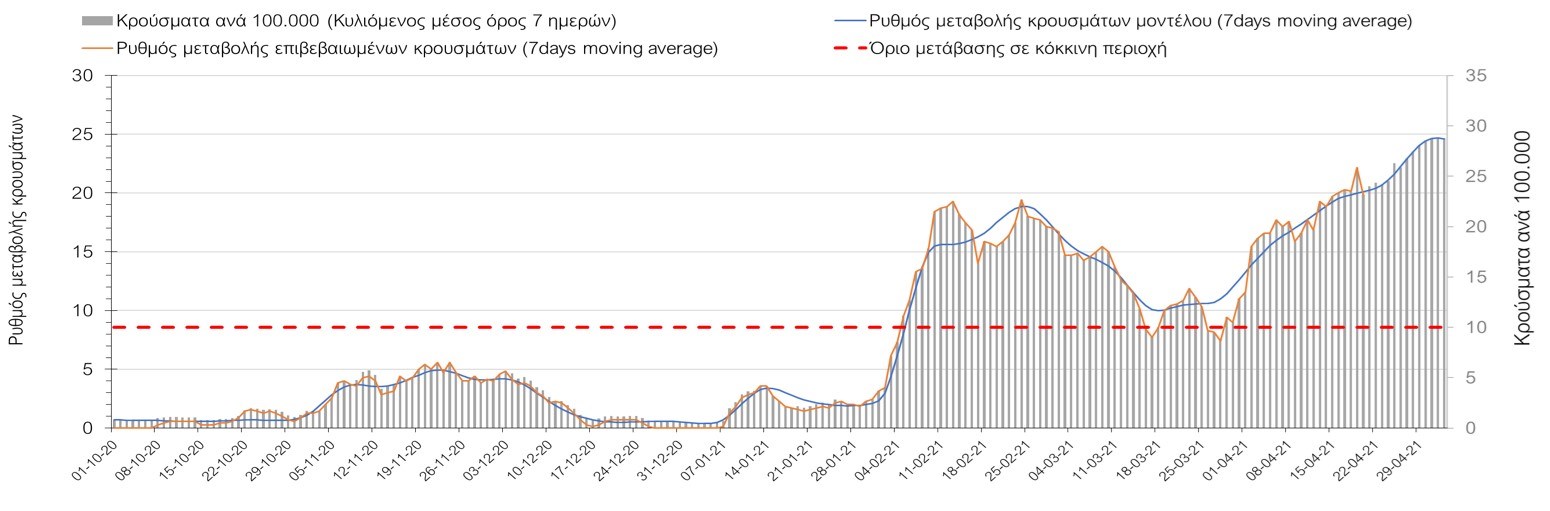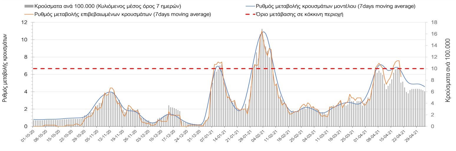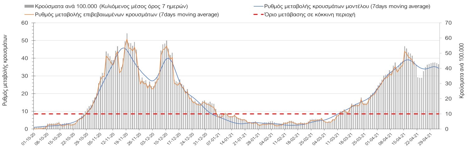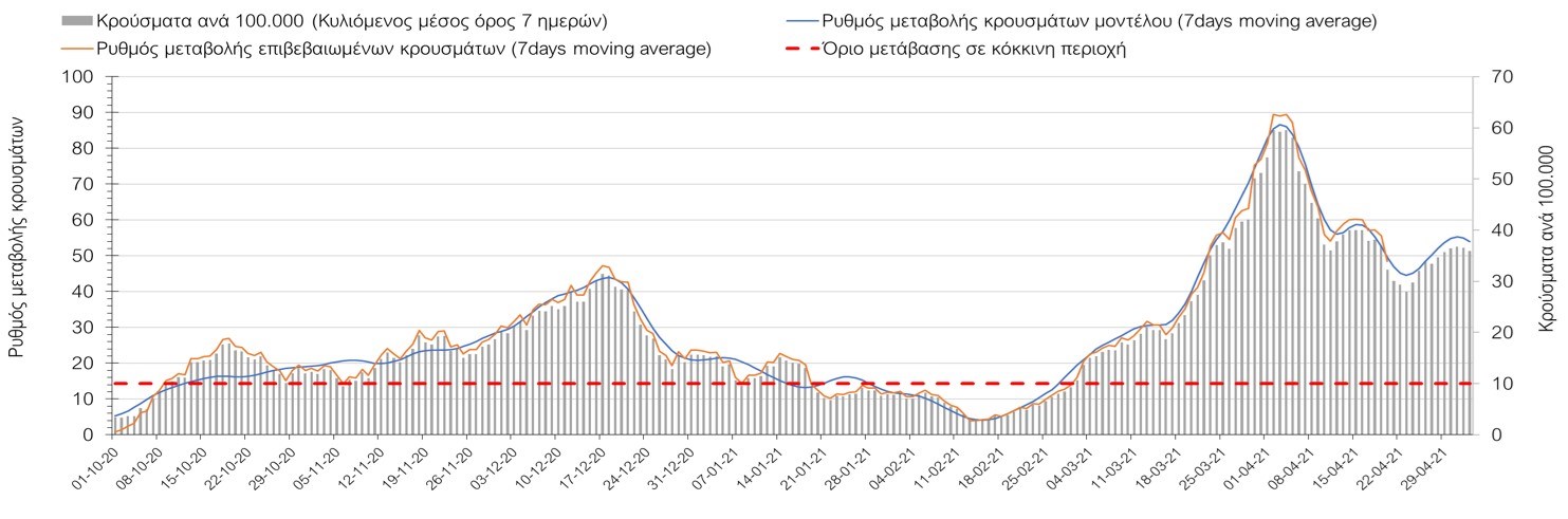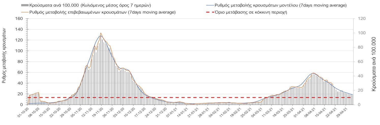 Σχήμα 50. Πορεία του ημερησίου αριθμού των κρουσμάτων (κυλιόμενος μέσος όρος 7 ημερών) στην ΘάσοΣυμπεράσματα:Η αύξηση που παρατηρείται πλέον στον αριθμό των ασθενών σε κρίσιμη κατάσταση (διασωληνωμένοι σε ΜΕΘ), καθώς και ο αριθμός των θανάτων συνάδουν με τις προσομοιώσεις του μοντέλου CORE, όπως και ο αριθμός των κρουσμάτων, μετά και τις επικαιροποιημένες προβλέψεις προ 40 ημερών, όπου ελήφθη υπόψιν η μεγαλύτερη διασπορά των μεταλλαγμένων και ταχύτερα μεταδιδόμενων στελεχών. Σε πανελλαδικό επίπεδο ο κυλιόμενος εβδομαδιαίος μέσος όρος του δείκτη θετικότητας διαμορφώθηκε στο 5,5% (η ημερήσια τιμή την Τρίτη ήταν 4,8%) ενώ ο κυλιόμενος εβδομαδιαίος μέσος όρος του πραγματικού αριθμού αναπαραγωγής Rt (δηλαδή ο αριθμός των ατόμων που ένας φορέας μπορεί να επιμολύνει) διαμορφώθηκε στο 0,96 (τιμές του Rt κάτω από τη μονάδα υποδηλώνουν καθαρή μείωση της διασποράς του ιού στην κοινότητα). Η ταυτόχρονη μείωση και των δύο δεικτών, που παρατηρήθηκε τις προηγούμενες ημέρες, υποδηλώνει κάμψη της ανοδικής τάσης στο σύνολο της χώρας (και κυρίως στην Αθήνα, ενώ αναμένεται να ακολουθήσει και η Θεσσαλονίκη). Όμως, με δεδομένο το άνοιγμα του λιανικού εμπορίου και των Λυκείων, είναι ακόμα πιο σημαντική η τήρηση των μέτρων, ενώ ύψιστης σημασίας στις επόμενες εβδομάδες θα αποδειχθεί η ορθή και μαζική εφαρμογή των self-test, με ταυτόχρονη αύξηση της ιχνηλασίας των επαφών των ανιχνευθέντων ως θετικοί και καραντίνα 14 ημερών για τους συμπολίτες μας που θα επιβεβαιωθεί ότι είναι θετικοί στην μόλυνση με SARS-CoV-2 ακόμη και αν είναι ασυμπτωματικοί. Δεδομένου ότι τελικά ο αριθμός των self-test που πραγματοποιούνται ημερησίως δεν έχει φθάσει στα επιθυμητά νούμερα στα οποία βασίζονται οι προβολές που παρουσιάζονται στην παρούσα τεχνική έκθεση μέχρι το Πάσχα, μόλις έχουμε νεώτερα για τον ακριβή αριθμό τους και τη συχνότητα εκτέλεσης αυτών, θα επαναεπικαιροποιήσουμε τις προβλέψεις μας. Επίσης, αξίει να σημειωθεί ότι στην Αθήα τις τελευταίες ημέρες παρατηρήθηκαν συρροές, οι πιθανές επιπτώσεις των οποίων θα αποτυπωθούν στις επόμενες ημέρες. Παρά την εφαρμογή οριζόντιων μέτρων ανάσχεσης της πανδημίας που εφαρμόσθηκαν από τα τέλη Οκτωβρίου, η πορεία της τελευταίας διαφοροποιείται από περιοχή σε περιοχή. Οι παραπάνω παρατηρήσεις τείνουν στο συμπέρασμα ότι η διαχείριση του υγειονομικού κινδύνου θα πρέπει να συνεχίσει να εξετάζεται σε τοπικό επίπεδο. Πλέον προβληματίζουν πέρα από την Αττική και τη Θεσσαλονίκη, η Αχαΐα, η Αρκαδία, η Ηλεία, η Αργολίδα, η Κορινθία, η Εύβοια, η Βοιωτία, η Φθιώτιδα, η Ευρυτανία, η Λάρισα, η Μαγνησία, η Καρδίτσα, τα Ιωάννινα, η Κοζάνη, η Χαλκιδική, η Καστοριά, η Καβάλα, η Πέλλα, το Κιλκίς, τα Γρεβενά, οι Σέρρες και η Πέλλα, η Ξάνθη, η Χίος, η Θάσος, το Ηράκλειο, τα Χανιά, και το Ρέθυμνο. Ανάγκη αυξημένης επιτήρησης έχουν η Πιερία, η Δράμα, η Φλώρινα, η Ημαθία, η Ροδόπη, ο Έβρος και το Λασίθι, που έχουν διακυμάνσεις κοντά στο όριο της κόκκινης περιοχής.Συνολικά, τα τεστ ανίχνευσης θα πρέπει να φτάσουν τουλάχιστον στα 120.000 και να δίνεται έμφαση στοχευμένα στις περιφερειακές ενότητες στις οποίες η δυναμική της διασποράς φαίνεται να είναι ανησυχητική για 1-2 ημέρες ώστε να ανιχνεύονται οι ασυμπτωματικοί και προσυμπτωματικοί φορείς και να σπάει η αλυσίδα μετάδοσης βάζοντάς τους σε καραντίνα. Λόγω της ανησυχίας που εγείρει η παρουσία στην κοινότητα των μεταλλαγμένων στελέχους 