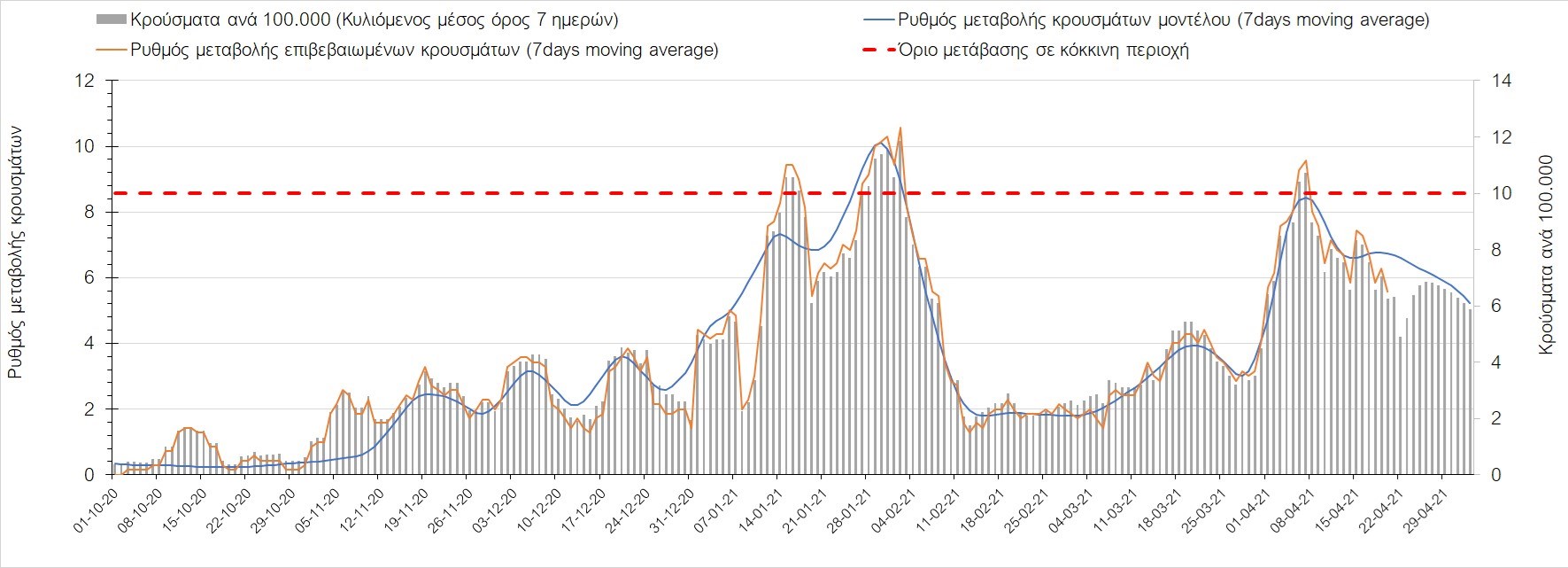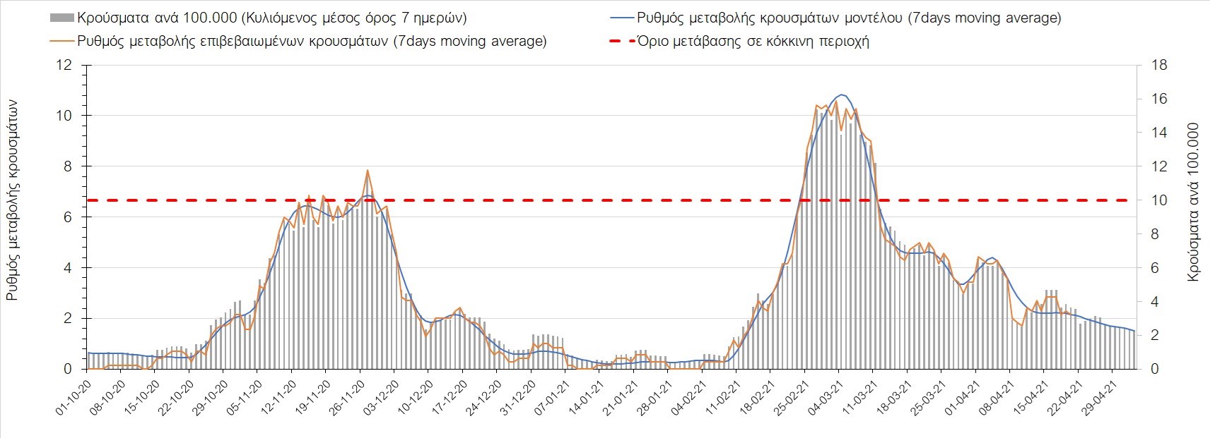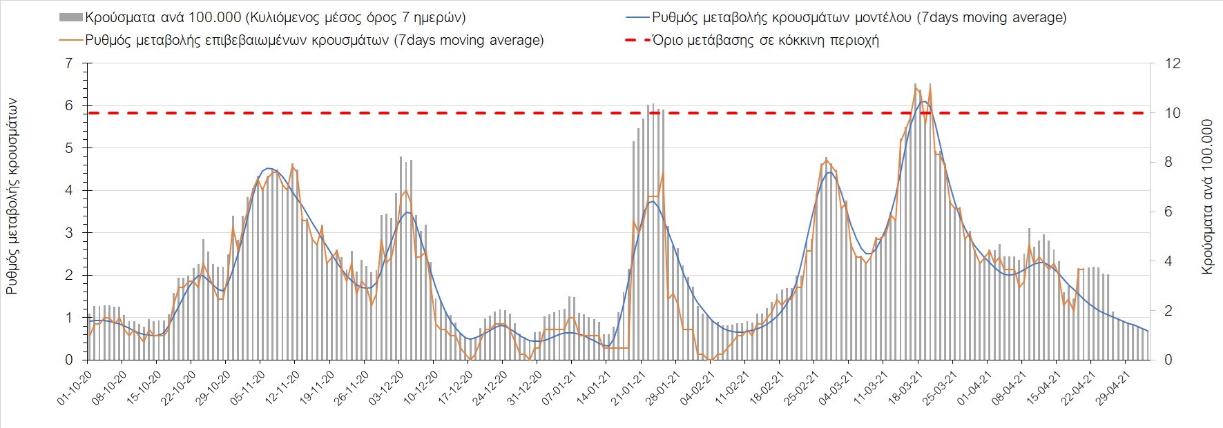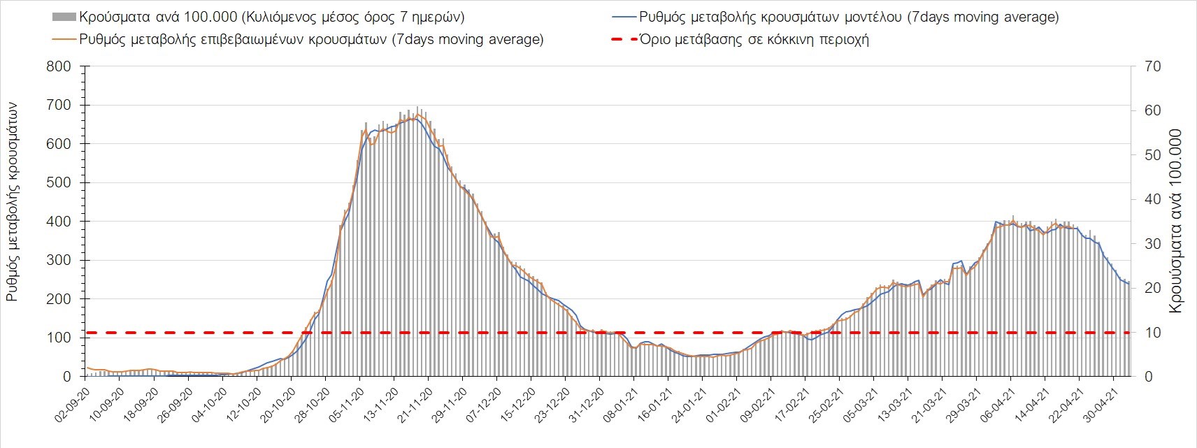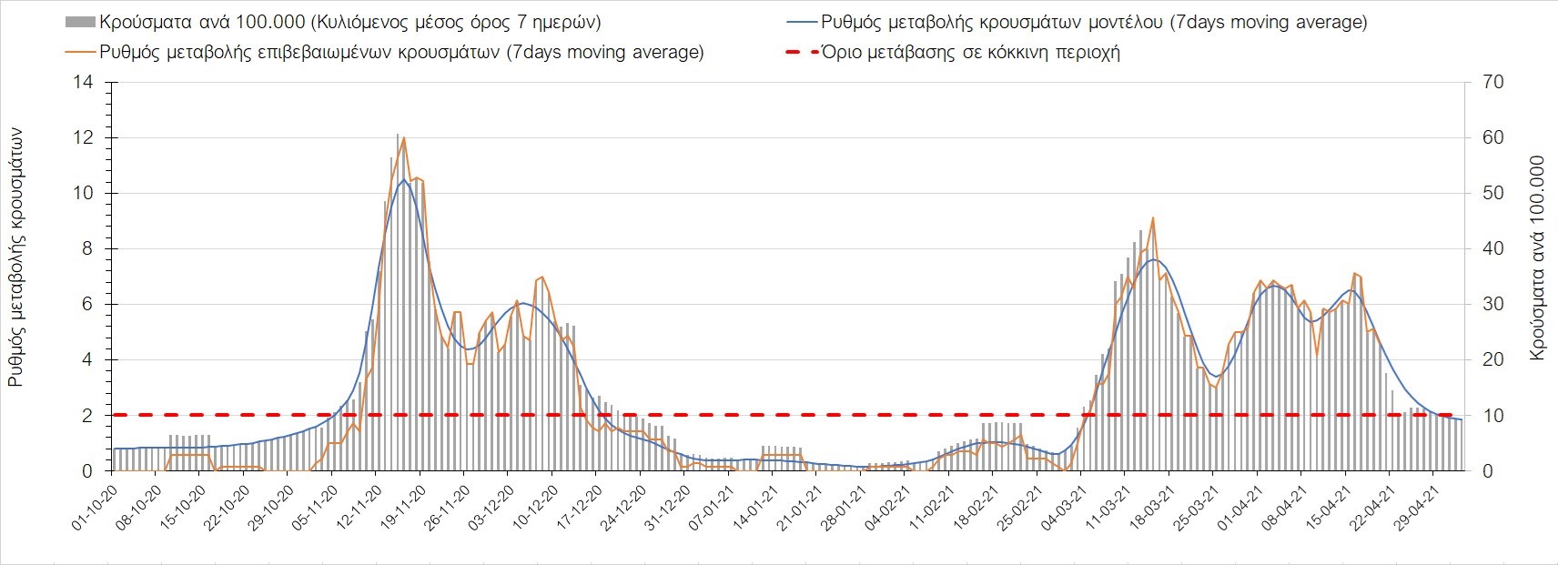 Σχήμα 50. Πορεία του ημερησίου αριθμού των κρουσμάτων (κυλιόμενος μέσος όρος 7 ημερών) στην ΘάσοΣυμπεράσματα:Η αύξηση που παρατηρείται πλέον στον αριθμό των ασθενών σε κρίσιμη κατάσταση (διασωληνωμένοι σε ΜΕΘ), καθώς και ο αριθμός των θανάτων συνάδουν με τις προσομοιώσεις του μοντέλου CORE, όπως και ο αριθμός των κρουσμάτων, μετά και τις επικαιροποιημένες προβλέψεις προ 40 ημερών, όπου ελήφθη υπόψιν η μεγαλύτερη διασπορά των μεταλλαγμένων και ταχύτερα μεταδιδόμενων στελεχών. Σε πανελλαδικό επίπεδο ο κυλιόμενος εβδομαδιαίος μέσος όρος του δείκτη θετικότητας διαμορφώθηκε στο 5,5% (η ημερήσια τιμή την Τρίτη ήταν 4,8%) ενώ ο κυλιόμενος εβδομαδιαίος μέσος όρος του πραγματικού αριθμού αναπαραγωγής Rt (δηλαδή ο αριθμός των ατόμων που ένας φορέας μπορεί να επιμολύνει) διαμορφώθηκε στο 0,96 (τιμές του Rt κάτω από τη μονάδα υποδηλώνουν καθαρή μείωση της διασποράς του ιού στην κοινότητα). Η ταυτόχρονη μείωση και των δύο δεικτών, που παρατηρήθηκε τις προηγούμενες ημέρες, υποδηλώνει κάμψη της ανοδικής τάσης στο σύνολο της χώρας (και κυρίως στην Αθήνα, ενώ αναμένεται να ακολουθήσει και η Θεσσαλονίκη). Όμως, με δεδομένο το άνοιγμα του λιανικού εμπορίου και των Λυκείων, είναι ακόμα πιο σημαντική η τήρηση των μέτρων, ενώ ύψιστης σημασίας στις επόμενες εβδομάδες θα αποδειχθεί η ορθή και μαζική εφαρμογή των self-test, με ταυτόχρονη αύξηση της ιχνηλασίας των επαφών των ανιχνευθέντων ως θετικοί και καραντίνα 14 ημερών για τους συμπολίτες μας που θα επιβεβαιωθεί ότι είναι θετικοί στην μόλυνση με SARS-CoV-2 ακόμη και αν είναι ασυμπτωματικοί. Δεδομένου ότι τελικά ο αριθμός των self-test που πραγματοποιούνται ημερησίως δεν έχει φθάσει στα επιθυμητά νούμερα στα οποία βασίζονται οι προβολές που παρουσιάζονται στην παρούσα τεχνική έκθεση μέχρι το Πάσχα, μόλις έχουμε νεώτερα για τον ακριβή αριθμό τους και τη συχνότητα εκτέλεσης αυτών, θα επαναεπικαιροποιήσουμε τις προβλέψεις μας. Επίσης, αξίει να σημειωθεί ότι στην Αθήα τις τελευταίες ημέρες παρατηρήθηκαν συρροές, οι πιθανές επιπτώσεις των οποίων θα αποτυπωθούν στις επόμενες ημέρες. Παρά την εφαρμογή οριζόντιων μέτρων ανάσχεσης της πανδημίας που εφαρμόσθηκαν από τα τέλη Οκτωβρίου, η πορεία της τελευταίας διαφοροποιείται από περιοχή σε περιοχή. Οι παραπάνω παρατηρήσεις τείνουν στο συμπέρασμα ότι η διαχείριση του υγειονομικού κινδύνου θα πρέπει να συνεχίσει να εξετάζεται σε τοπικό επίπεδο. Πλέον προβληματίζουν πέρα από την Αττική και τη Θεσσαλονίκη, η Αχαΐα, η Αρκαδία, η Ηλεία, η Αργολίδα, η Κορινθία, η Εύβοια, η Βοιωτία, η Φθιώτιδα, η Ευρυτανία, η Λάρισα, η Μαγνησία, η Καρδίτσα, τα Ιωάννινα, η Κοζάνη, η Χαλκιδική, η Καστοριά, η Καβάλα, η Πέλλα, το Κιλκίς, τα Γρεβενά, οι Σέρρες και η Πέλλα, η Ξάνθη, η Χίος, η Θάσος, το Ηράκλειο, τα Χανιά, και το Ρέθυμνο. Ανάγκη αυξημένης επιτήρησης έχουν η Πιερία, η Δράμα, η Φλώρινα, η Ημαθία, η Ροδόπη, ο Έβρος και το Λασίθι, που έχουν διακυμάνσεις κοντά στο όριο της κόκκινης περιοχής.Συνολικά, τα τεστ ανίχνευσης θα πρέπει να φτάσουν τουλάχιστον στα 120.000 και να δίνεται έμφαση στοχευμένα στις περιφερειακές ενότητες στις οποίες η δυναμική της διασποράς φαίνεται να είναι ανησυχητική για 1-2 ημέρες ώστε να ανιχνεύονται οι ασυμπτωματικοί και προσυμπτωματικοί φορείς και να σπάει η αλυσίδα μετάδοσης βάζοντάς τους σε καραντίνα. Λόγω της ανησυχίας που εγείρει η παρουσία στην κοινότητα των μεταλλαγμένων στελέχους 