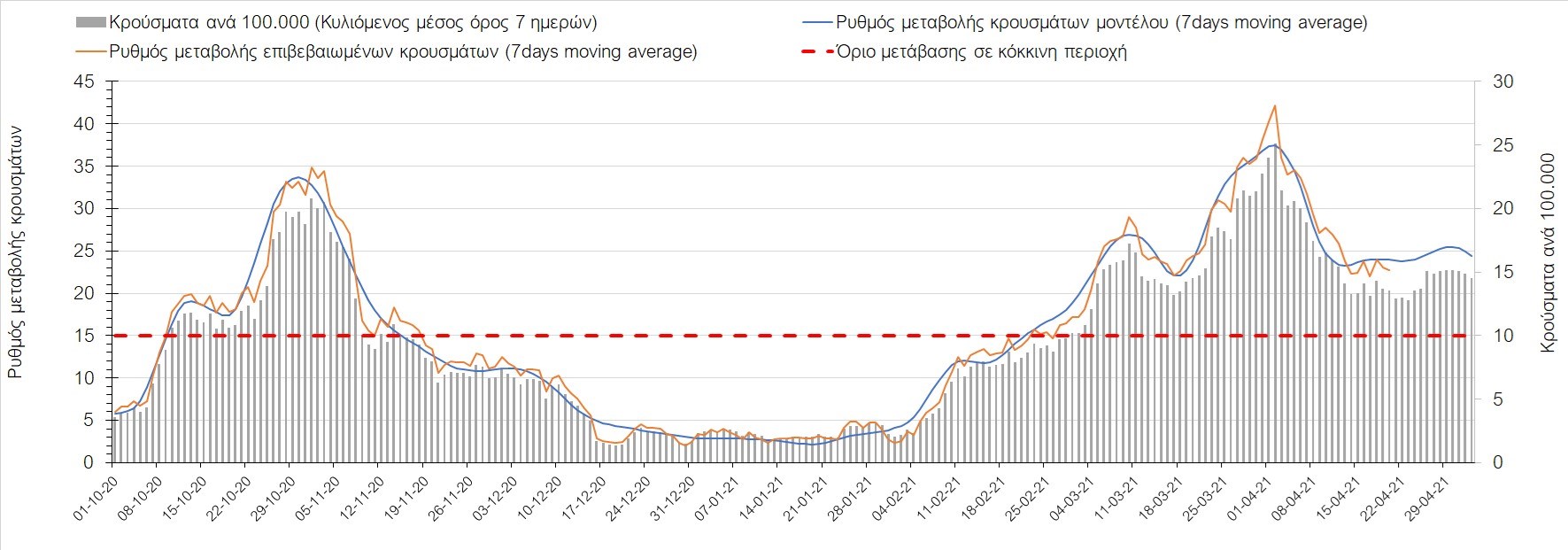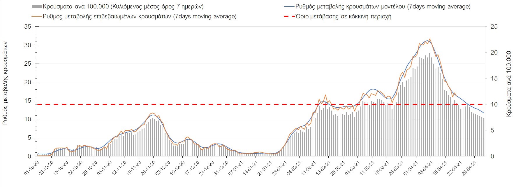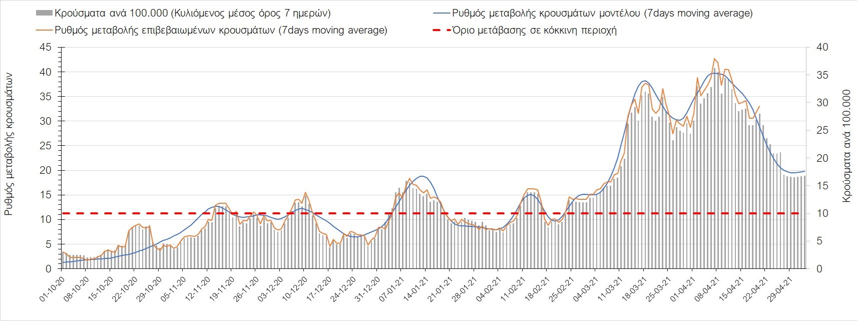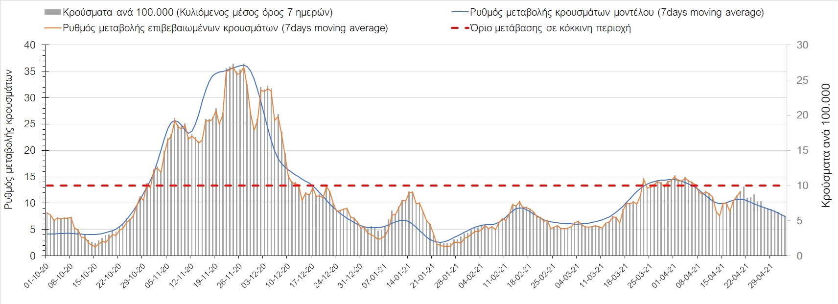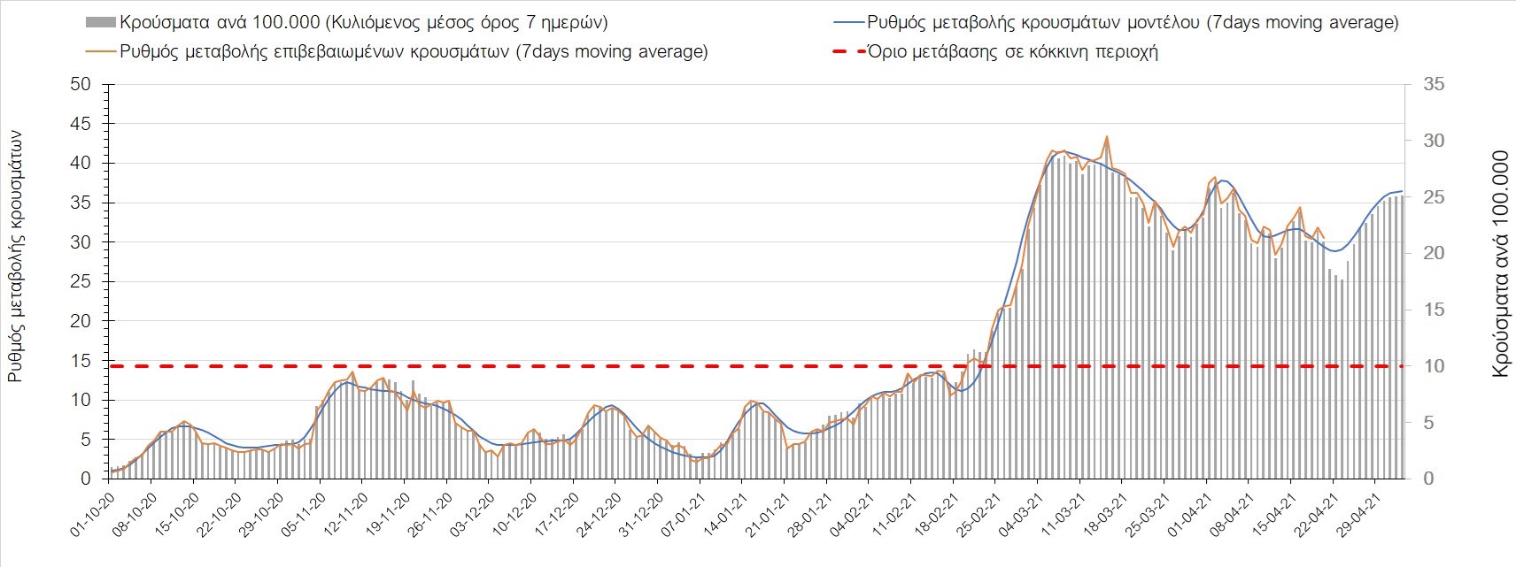 Σχήμα 35. Πορεία του ημερησίου αριθμού των κρουσμάτων (κυλιόμενος μέσος όρος 7 ημερών) στην Πιερία