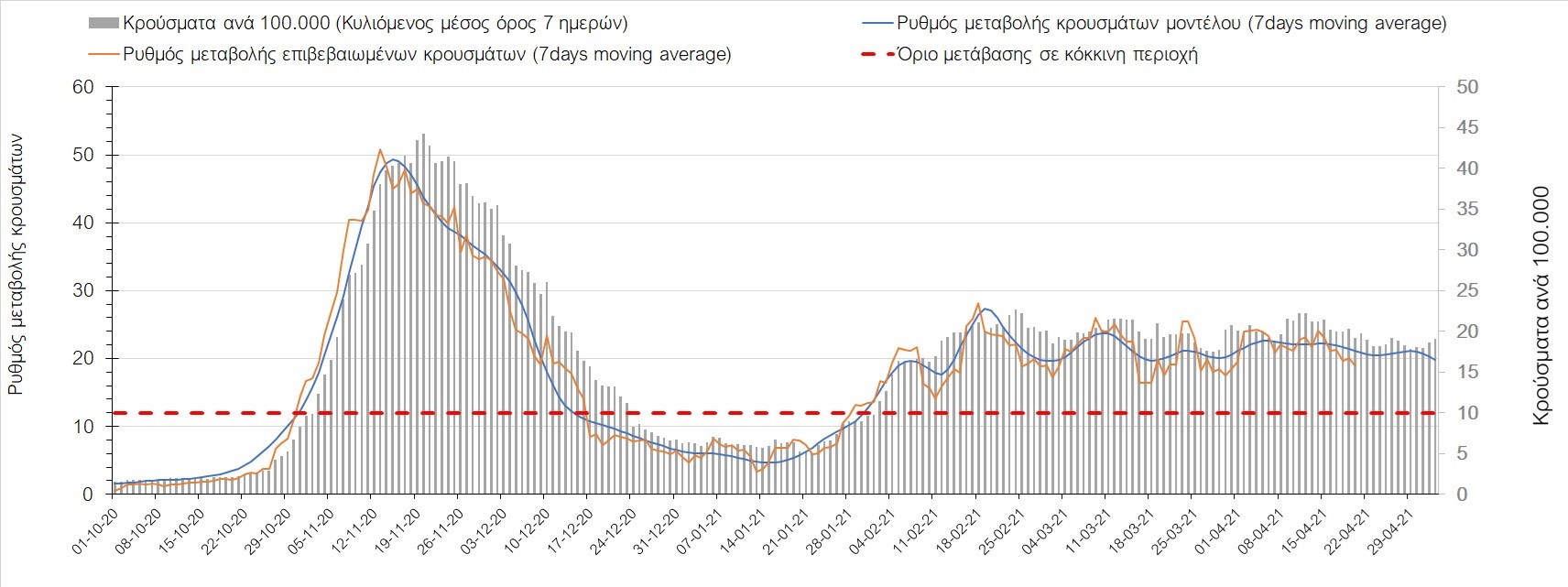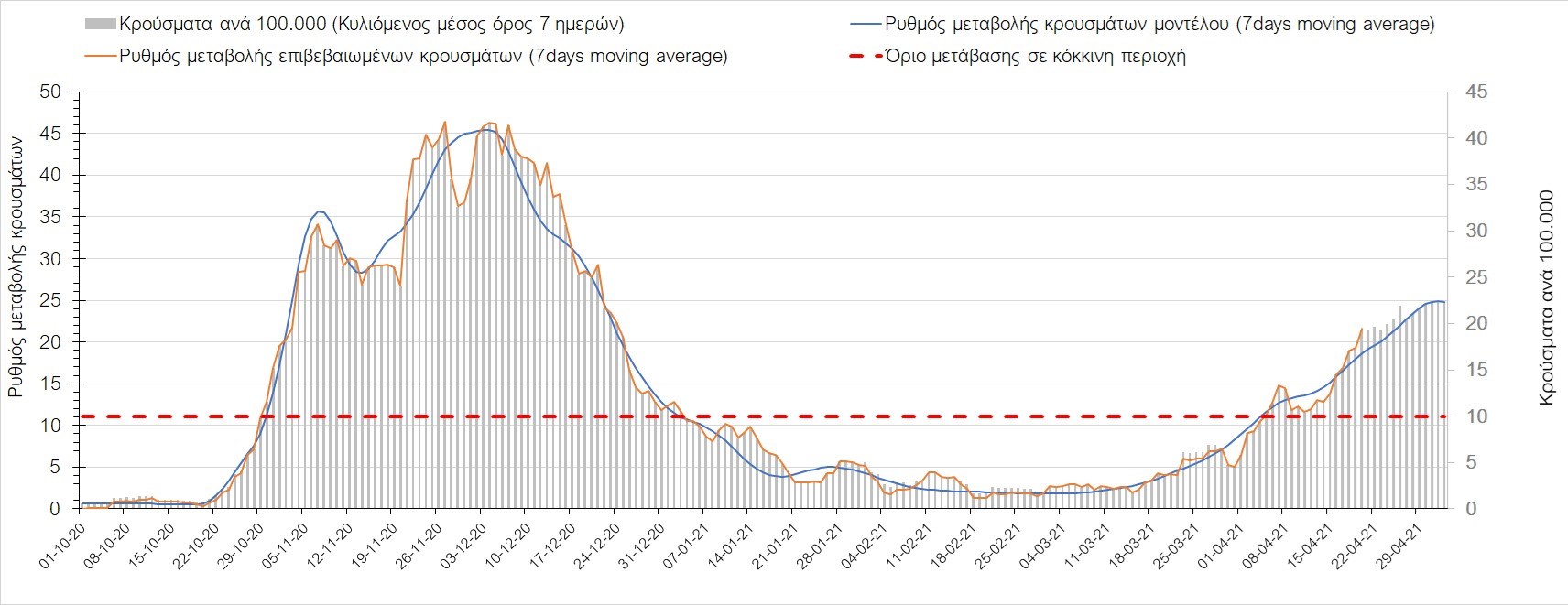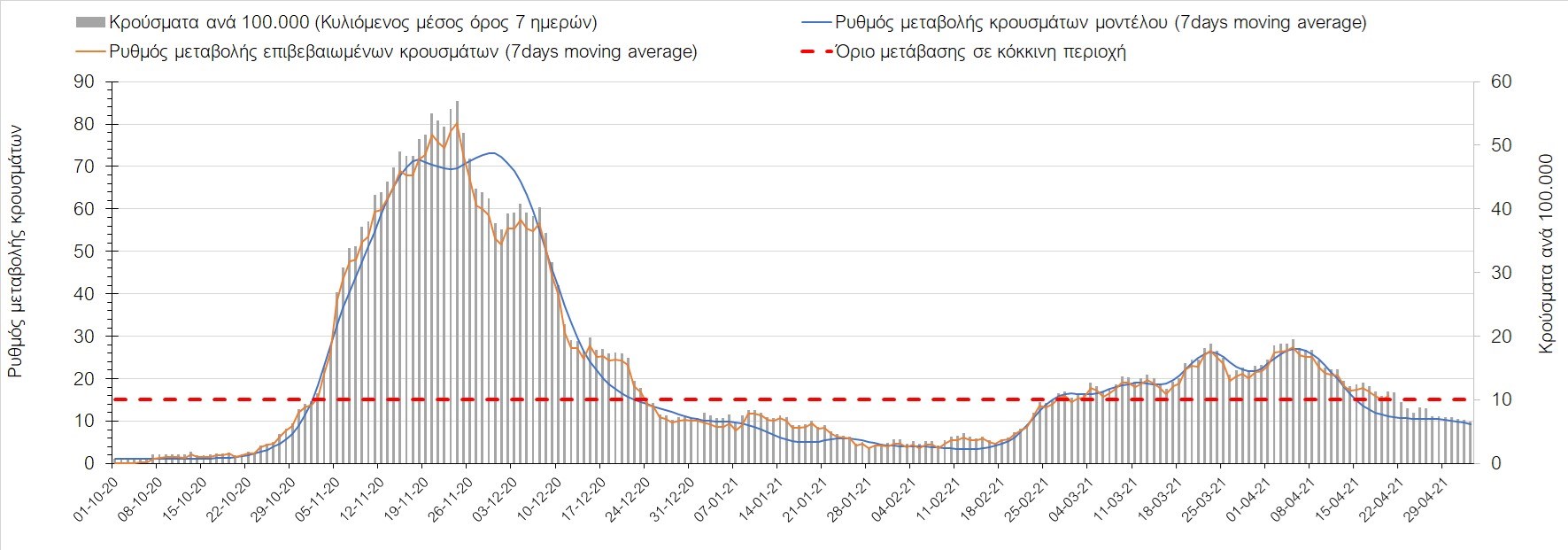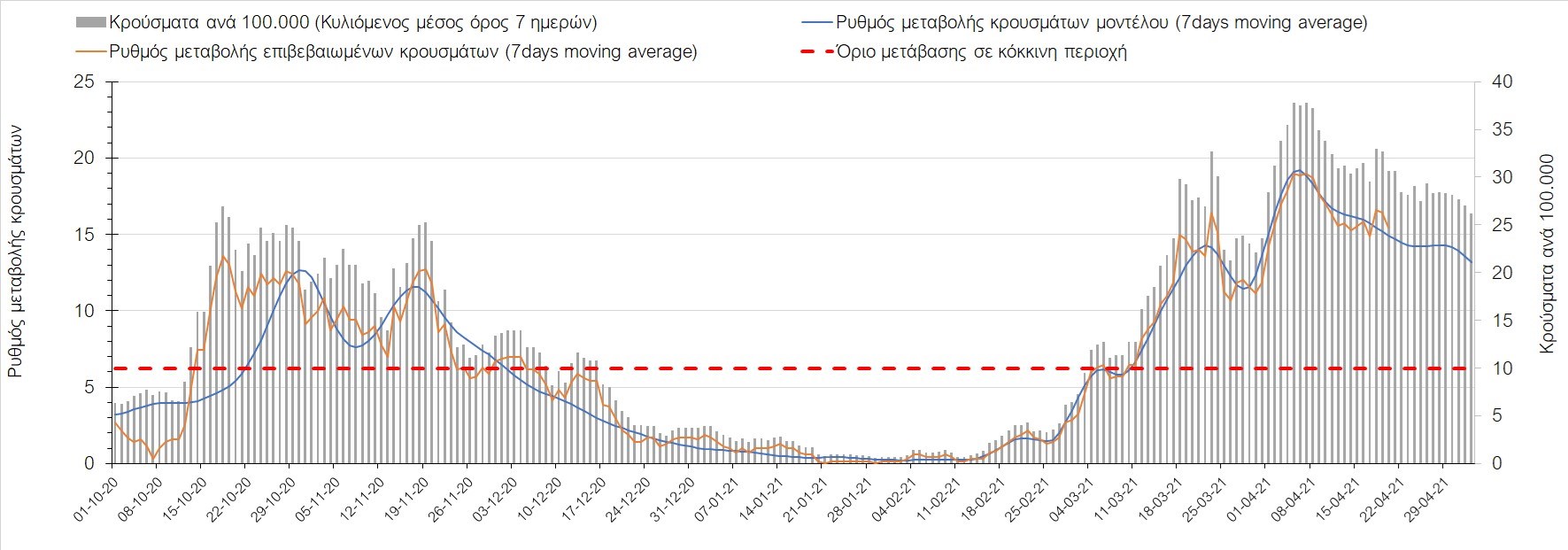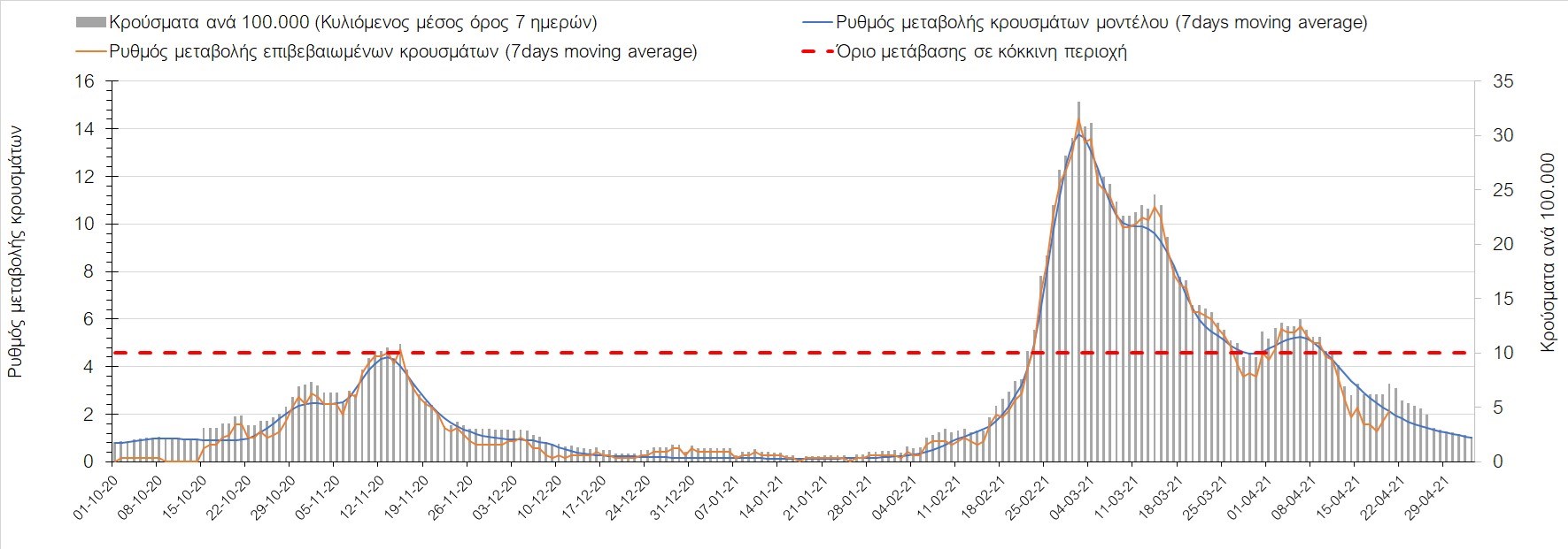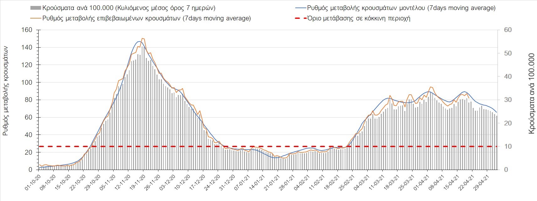 Σχήμα 35. Πορεία του ημερησίου αριθμού των κρουσμάτων (κυλιόμενος μέσος όρος 7 ημερών) στην Πιερία