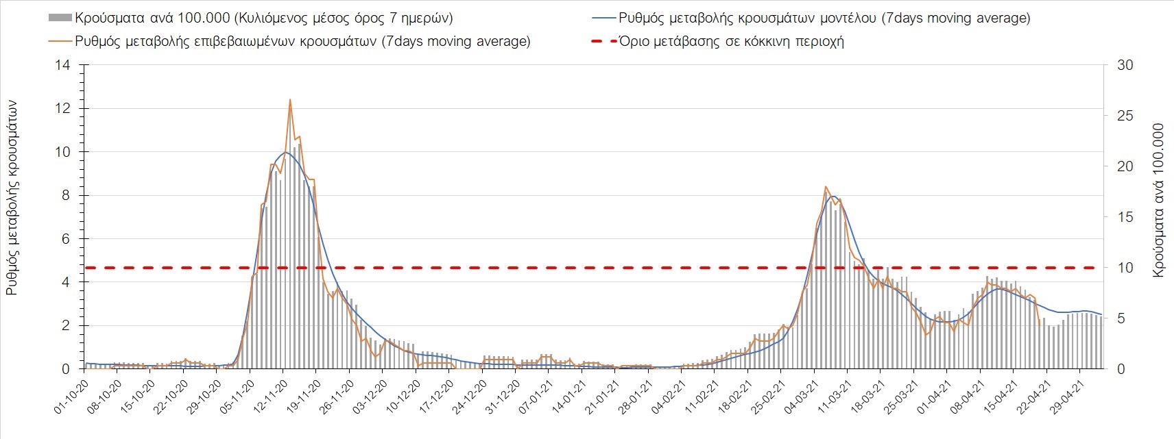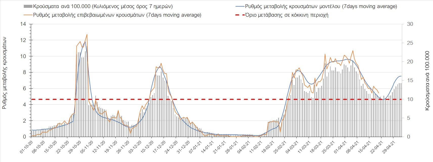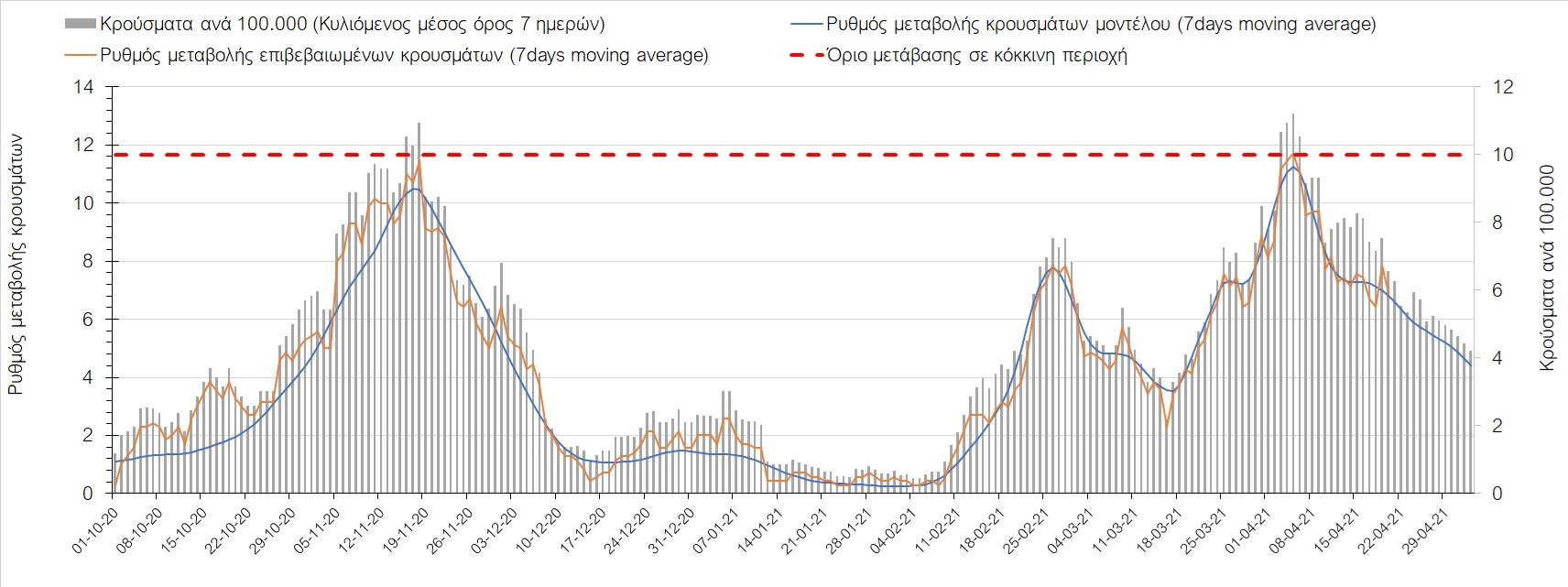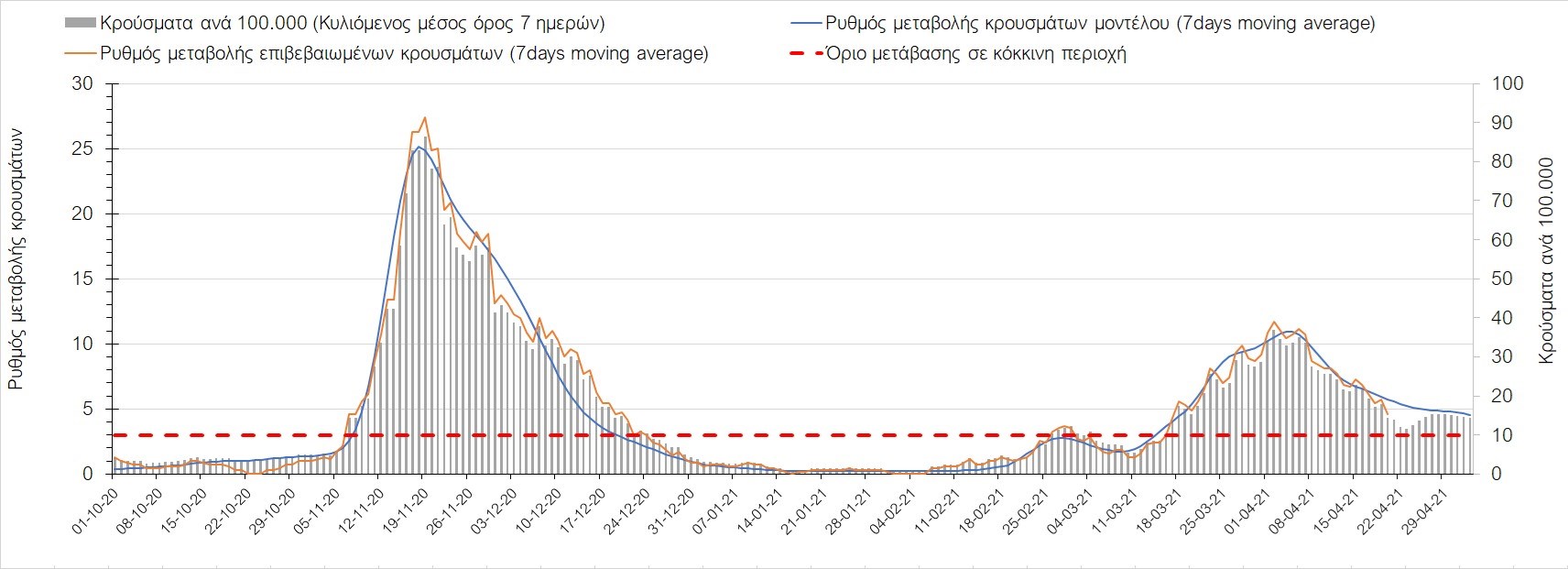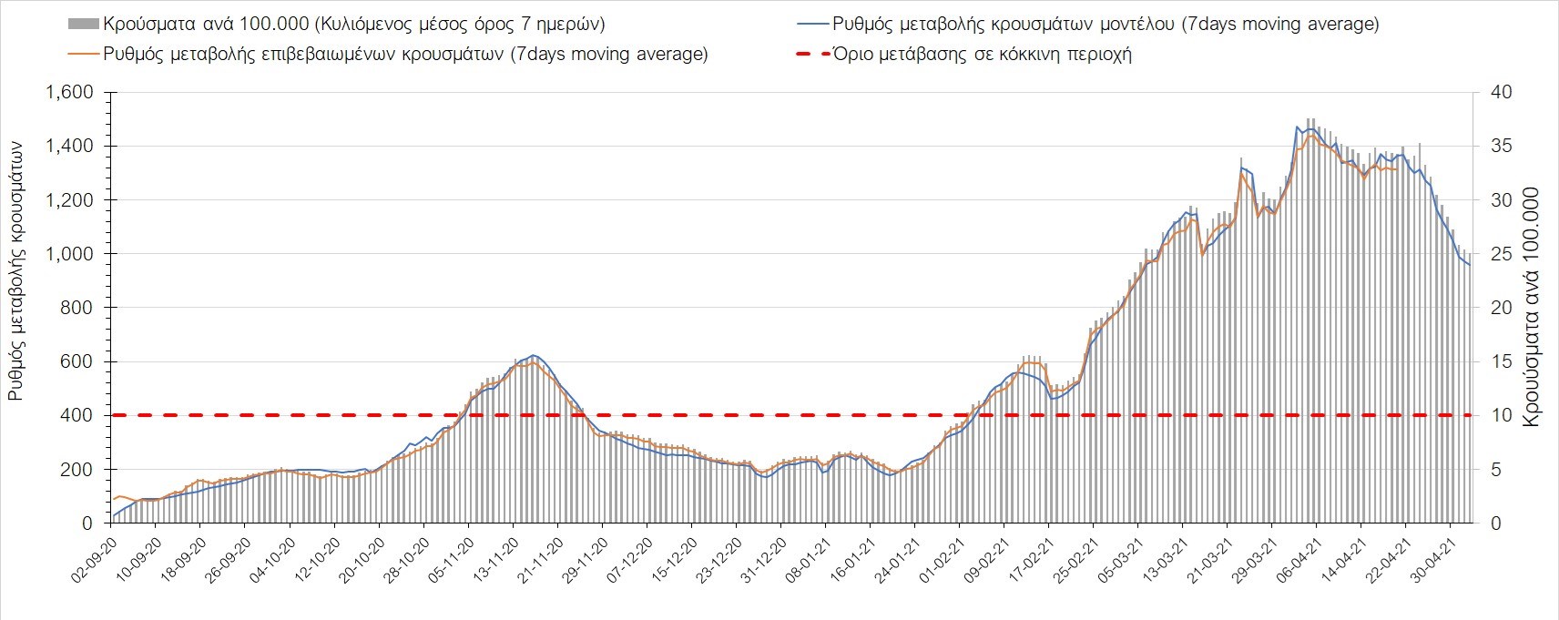 Σχήμα 35. Πορεία του ημερησίου αριθμού των κρουσμάτων (κυλιόμενος μέσος όρος 7 ημερών) στην Πιερία