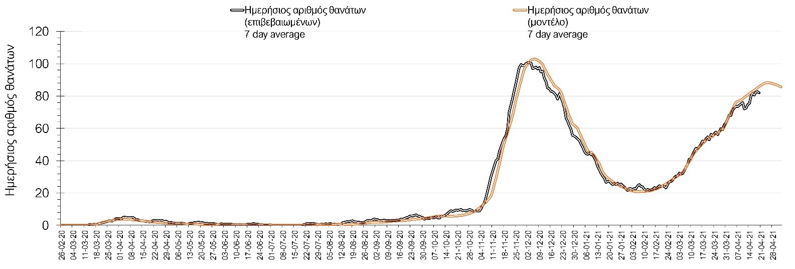 Σχήμα 3. Αριθμός θανάτων (κυλιόμενος μέσος όρος 7 ημερών) σύμφωνα με τα στοιχεία του ΕΟΔΥ και τις προβλέψεις της υπολογιστικής πλατφόρμας CORE.Η πορεία της μέσης εβδομαδιαίας τιμής των κρουσμάτων, καθώς και του κυλιόμενου μέσου όρου 7 ημερών του αριθμού των κρουσμάτων ανά 100.000 πληθυσμού, όπως έχουν καταγραφεί από τον ΕΟΔΥ και η αναμενόμενη πορεία τους όπως προδιαγράφεται από την υπολογιστική πλατφόρμα CORE για την Ελληνική επικράτεια μέχρι το Πάσχα, αποτυπώνονται στο Σχήμα 4. Φαίνεται μια αρχική σταθεροποίηση σε υψηλό αριθμό κορυσμάτων μέχρι το τέλος του μήνα και έπειτα μια μικρή αύξηση με κορύφωση στις 8 Απριλίου. Μετά από αυτήν την ημερομηνία και ανάλογα με τα μέτρα που θα έχουμε εφαρμόσει θα μπορούμε να δούμε σταδιακή αποκλιμάκωση της πανδημίας πανελλαδικά. Αξίζει να σημειωθεί, ότι αυτή η προβλεπόμενη πορεία, που αφορά τόσο τα κρούσματα, όσο και τις ΜΕΘ και τους θανάτους, βασίζεται στις ακόλουθες παραδοχές: