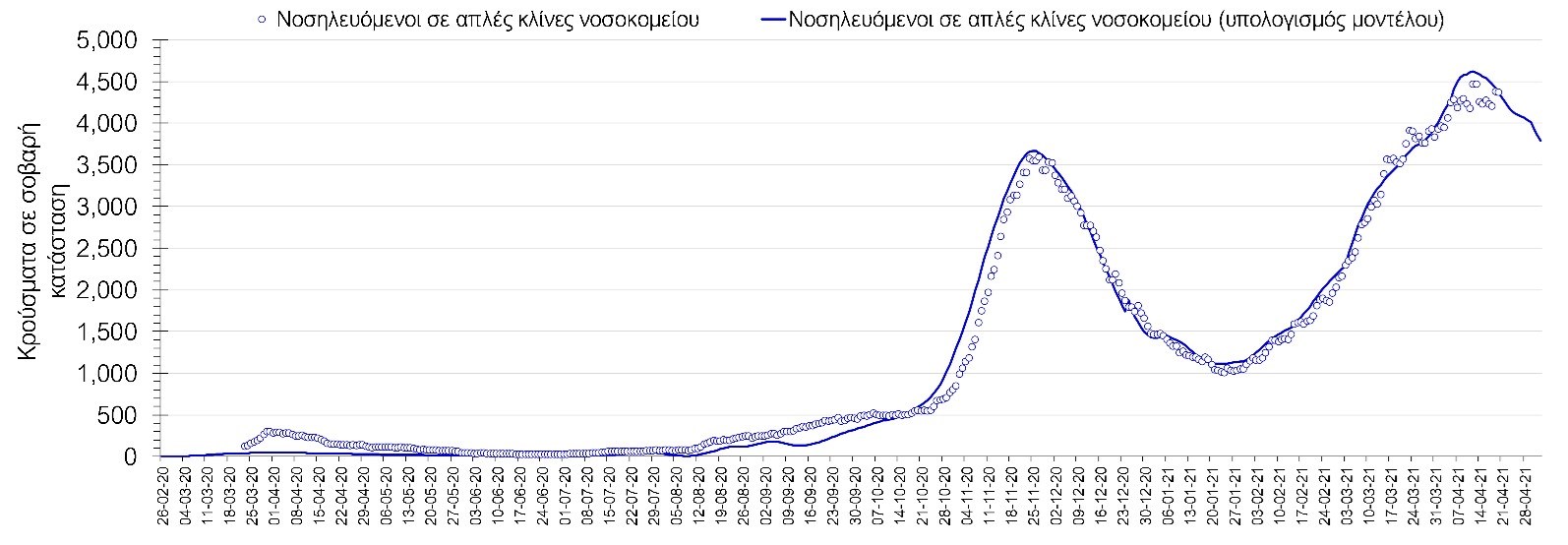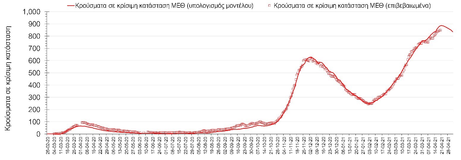 Σύμφωνα με τα στοιχεία του ΕΟΔΥ, ο αριθμός κρουσμάτων την Τρίτη ανήλθε στα 3789 νέα κρούσματα, με τα αποτελέσματα να συνάδουν με τις προβλέψεις της υπολογιστικής πλατφόρμας CORE (n=3880). Ο αριθμός των τεστ που πραγματοποιήθηκαν ήταν 78428 και σε συνδυασμό με τον αριθμό των κρουσμάτων, ο δείκτης θετικότητας διαμορφώθηκε την Τρίτη στο 4,8%. Η πραγματοποίηση αριθμού τεστ σε επίπεδα άνω των 50.000 την ημέρα (όπως και πραγματοποιείται τις τελευταίες ημέρες), συντελεί στο να εξάγουμε πιο ασφαλή συμπεράσματα σχετικά με την πορεία της πανδημίας. Γενικά όμως θα πρέπει να αυξηθεί κι άλλο ο αριθμός των τεστ ανίχνευσης του SARS-CoV-2 χρησιμοποιώντας τα rapid test και τα fast test για να καταπολεμηθεί η δυναμική αύξησης της διασποράς στις περιοχές όπου μια τέτοια αύξηση διαφαίνεται από τα μέχρι τώρα δεδομένα και την υπολογιστική πλατφόρμα CORE.Ο αριθμός ημερήσιων θανάτων (87) είναι αυξημένος σε σχέση με τη Δευτέρα (78) και όπως είχαμε προβλέψει από την προηγούμενη εβδομάδα, ο κυλιόμενος εβδομαδιαίος μέσος όρος που σήμερα είναι 82 αναμένεται να συνεχίσει να αυξάνεται μέχρι τα τέλη της επόμενης εβδομάδας, με δεδομένη την αύξηση του αριθμού των διασωληνωμένων, και παρά τη διαφαινόμενη μέχρι τώρα σταθεροποίηση του αριθμού των κρουσμάτων.Όσον αφορά στους ασθενείς σε κρίσιμη κατάσταση (διασωληνωμένοι σε ΜΕΘ), ο αριθμός τους παρέμεινε σταθερός σε σχέση με τη Δευτέρα (847 από 847), και ίσως φθάσουν τους περίπου 890 στις επόμενες ημέρες, όταν και αναμένεται να αρχίσει η αποκλιμάκωση με βάση την επικαιροποιημένη πρόβλεψη (αυτό βέβαια με την παραδοχή ότι θα συνεχίσουν να τηρούνται τα ισχύοντα μέτρα, συμπεριλαμβανομένων των προβλεπόμενων self–test και δεν θα πραγματοποιηθούν άμεσα και χωρίς την κατάλληλη προετοιμασία ανοίγματα δραστηριοτήτων υψηλού συγχρωτισμού, όπως τα mall και η εστίαση). Αξίζει να σημειωθεί ότι ο αριθμός των ασθενών σε κρίσιμη κατάσταση όπως και των θανάτων είναι αναλογικά χαμηλότερος σε σχέση με τα αντίστοιχα μεγέθη στο δεύτερο κύμα, τόσο λόγω των εμβολιασμών ευπαθών ομάδων, όσο και του υψηλότερου αριθμού τεστ ανίχνευσης, που συντελεί στον εντοπισμό περισσότερων ασυμπτωματικών ή ήπια συμπτωματικών κρουσμάτων. Επίσης, η διασπορά των μεταλλαγμένων στελεχών που έχουν μεγαλύτερη μεταδοτικότητα από το στέλεχος του SARS-CoV-2 που κυριαρχούσε μέχρι το τέλος Φεβρουαρίου και η αυξημένη κινητικότητα του πληθυσμού έχουν μεγαλώσει το ποσοστό των νεότερων ηλικιών που μολύνονται με αποτέλεσμα η μέση ηλικία των μολύνσεων να έχει πέσει σημαντικά. Η καμπύλη εξέλιξης του αριθμού των ασθενών που νοσηλεύονται σε κλίνες ΜΕΘ με βάση τις προσομοιώσεις της πλατφόρμας CORE, όπως αυτή παρουσιάζεται στο Σχήμα 1, των ασθενών που νοσηλεύονται σε απλές κλίνες στο Σχήμα 2, ενώ μια εκτίμηση για την πορεία των θανάτων ανά ημέρα παρουσιάζεται στο Σχήμα 3.