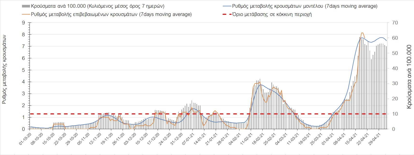 Σχήμα 42. Πορεία του ημερησίου αριθμού των κρουσμάτων (κυλιόμενος μέσος όρος 7 ημερών) στον ΈβροΣτο Ηράκλειο, όπου εντοπίστηκαν 71 κρούσματα την Τρίτη, παρατηρείται αύξηση σε σχέση με τη Δευτέρα (Σχήμα 43). Λόγω των έντονων διακυμάνσεων που σημειώνονται στην πορεία της πανδημίας ως αποτέλεσμα του πολύ μεγάλου αριθμού φορέων του μεταλλαγμένου στελέχους Β.1.1.7, το Ηράκλειο διανύει ένα ακόμη ανοδικό κύμα και αυτή η δυναμική σίγουρα θα καθυστερήσει τον αποχαρακτηρισμό της περιοχής ως κόκκινη και μετά τα τέλη Απριλίου. Στα Χανιά με 30 κρούσματα (Σχήμα 44) έχουμε αύξηση σε σχέση με τη Δευτέρα, αλλά διαφαίνεται ήδη η αποκλιμάκωση που επίσης αναμέναμε, παρά το πιο πρόσφατο ανοδικό κύμα που αναμένουμε να σταθεροποιηθεί στις επόμενες 3-4 ημέρες. Μείωση κρουσμάτων παρατηρείται στο Ρέθυμνο με 20 κρούσματα, στο οποίο έχει διαρφωθεί έντονα ανοδική τάση (Σχήμα 45). Στο Λασίθι παρατηρείται αύξηση σε σχέση με τη Δευτέρα, καθώς εντοπίστηκαν 5 κρούσματα την Τρίτη, και παρατηρούνται πολύ έντονες διακυμάνσεις (Σχήμα 46) περί του ορίου της κόκκινης περιοχής.