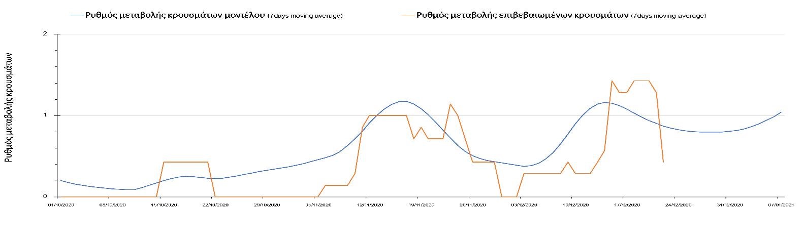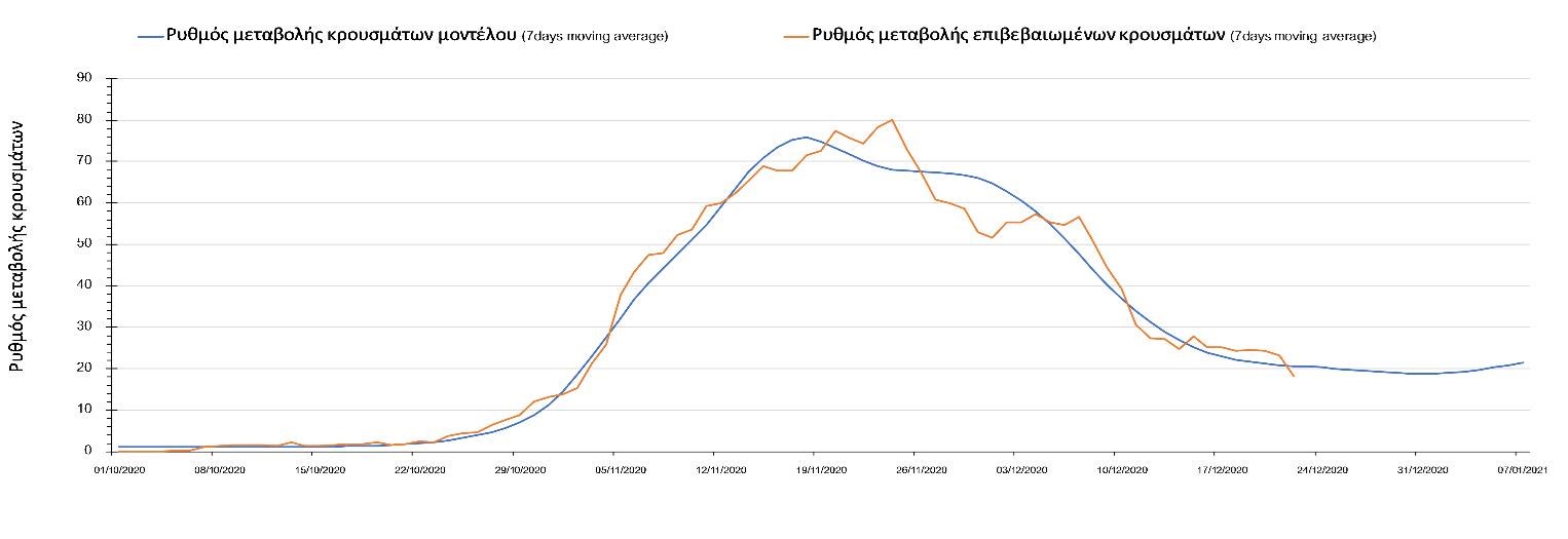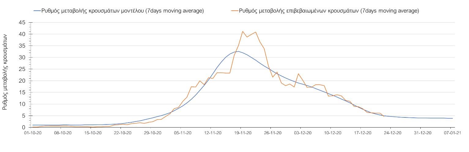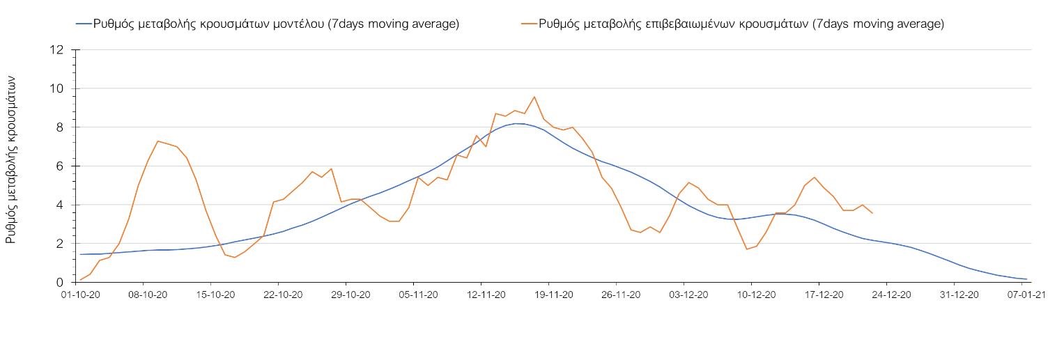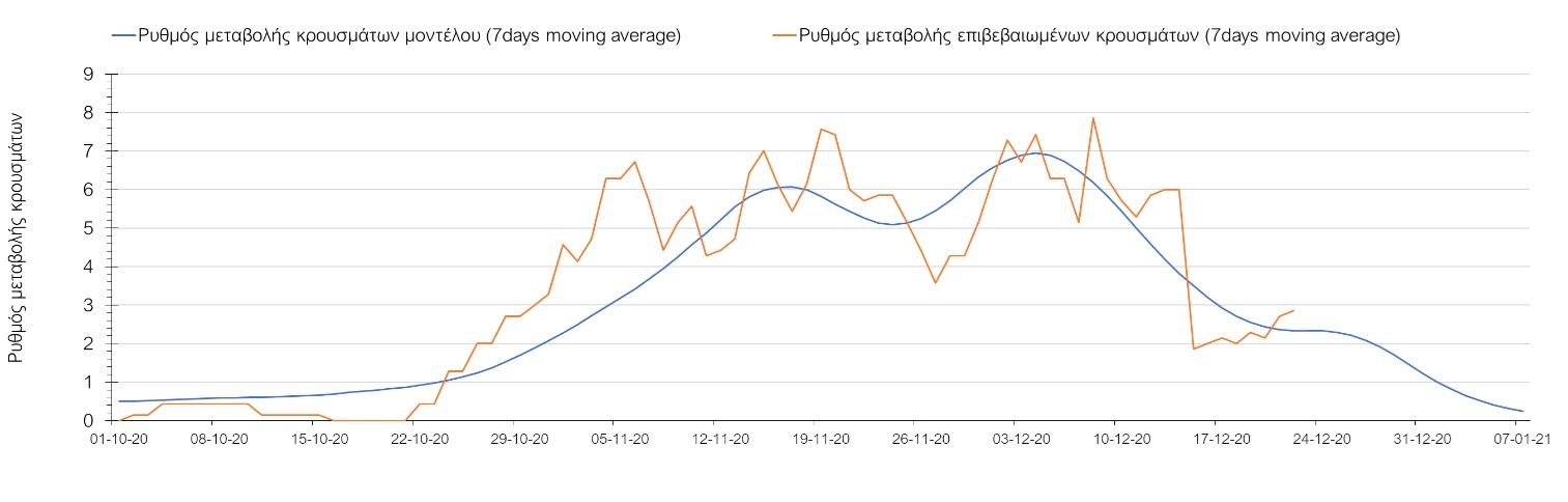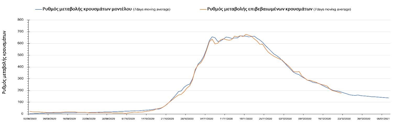 Η πορεία της μέσης εβδομαδιαίας τιμής των κρουσμάτων όπως έχουν καταγραφεί από τον ΕΟΔΥ και η αναμενόμενη πορεία τους μέχρι το τέλος του χρόνου, σύμφωνα με την υπάρχουσα κατάσταση και την απόφαση παράτασης του lockdown μέχρι και τις 7 Ιανουαρίου, όπως προδιαγράφεται από την υπολογιστική πλατφόρμα CORE για την Ελληνική επικράτεια, αποτυπώνονται στο Σχήμα 3.