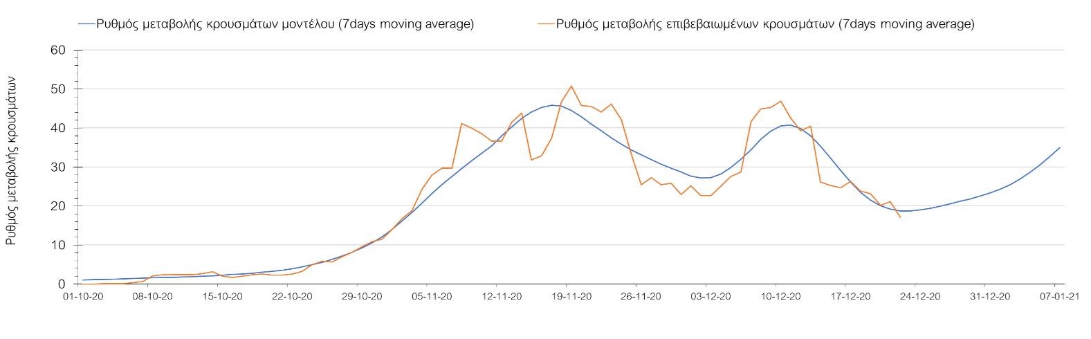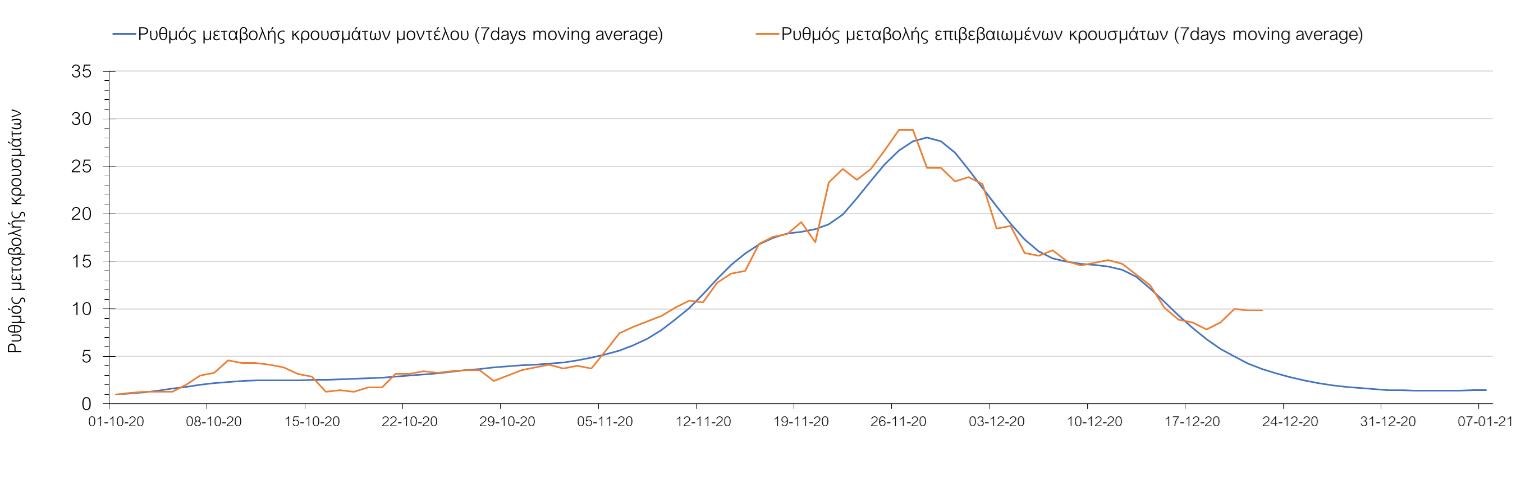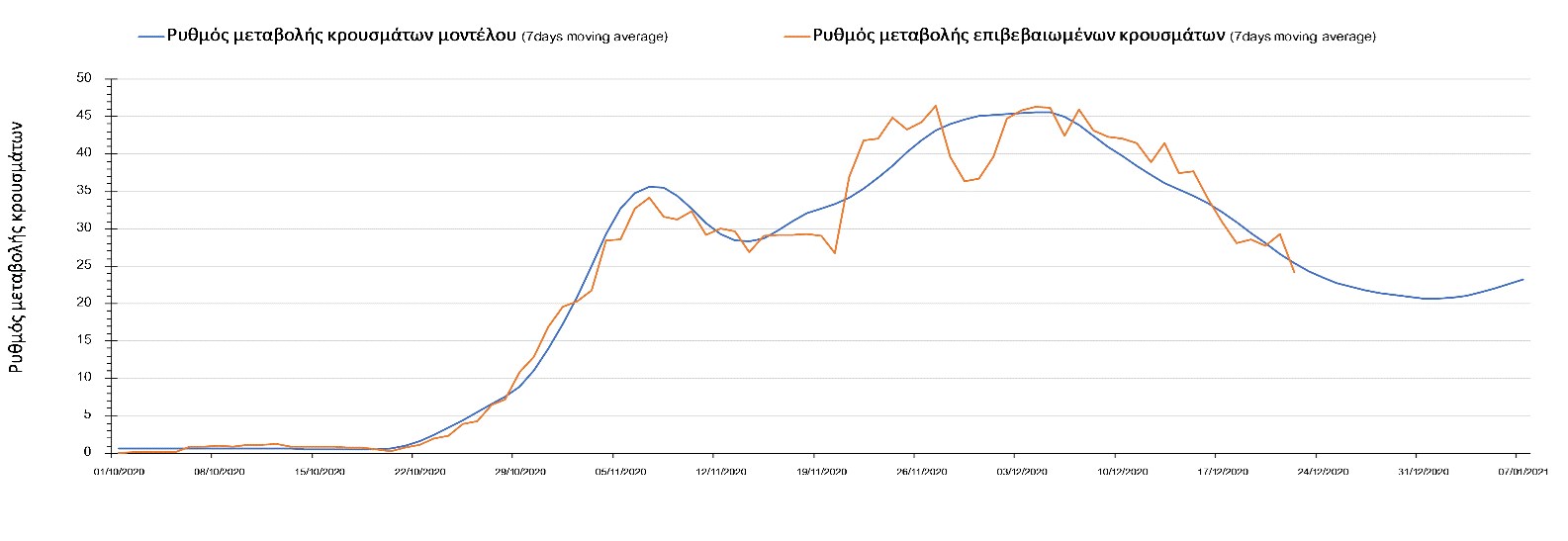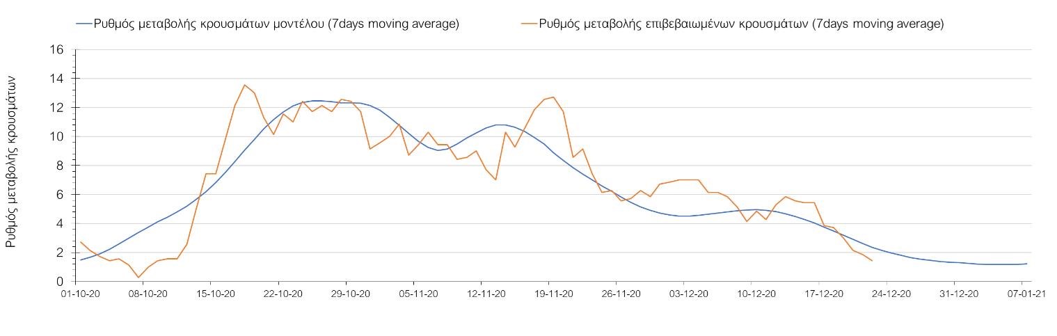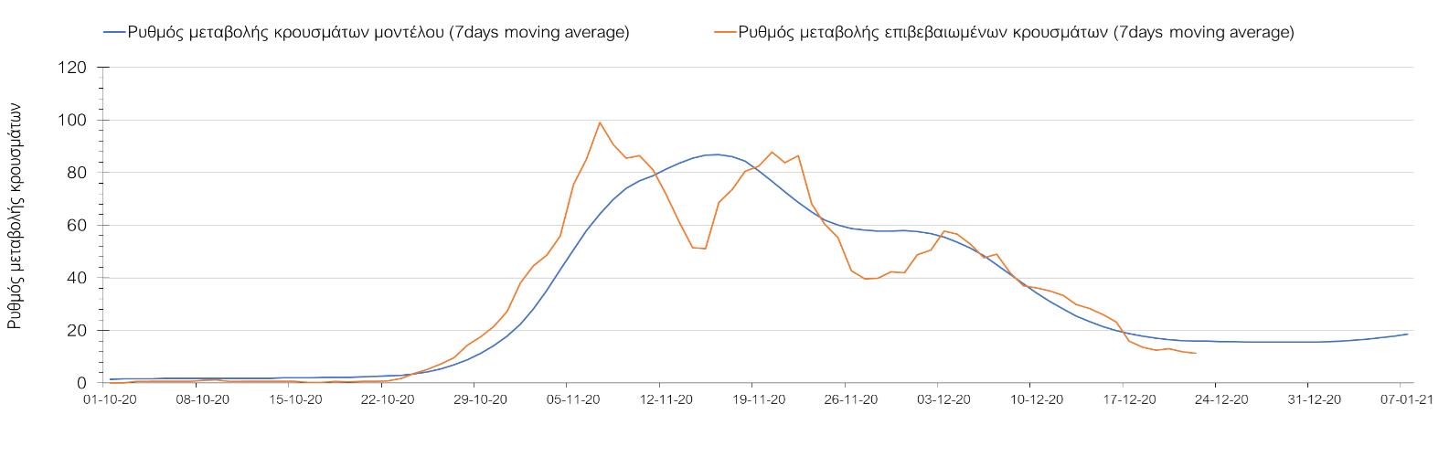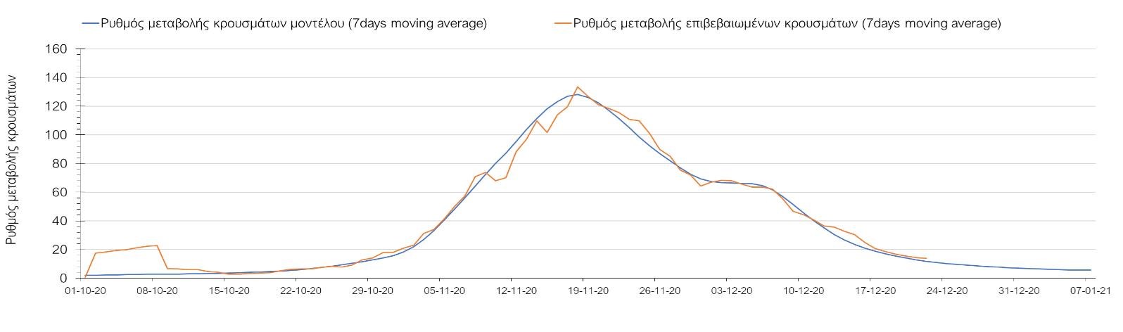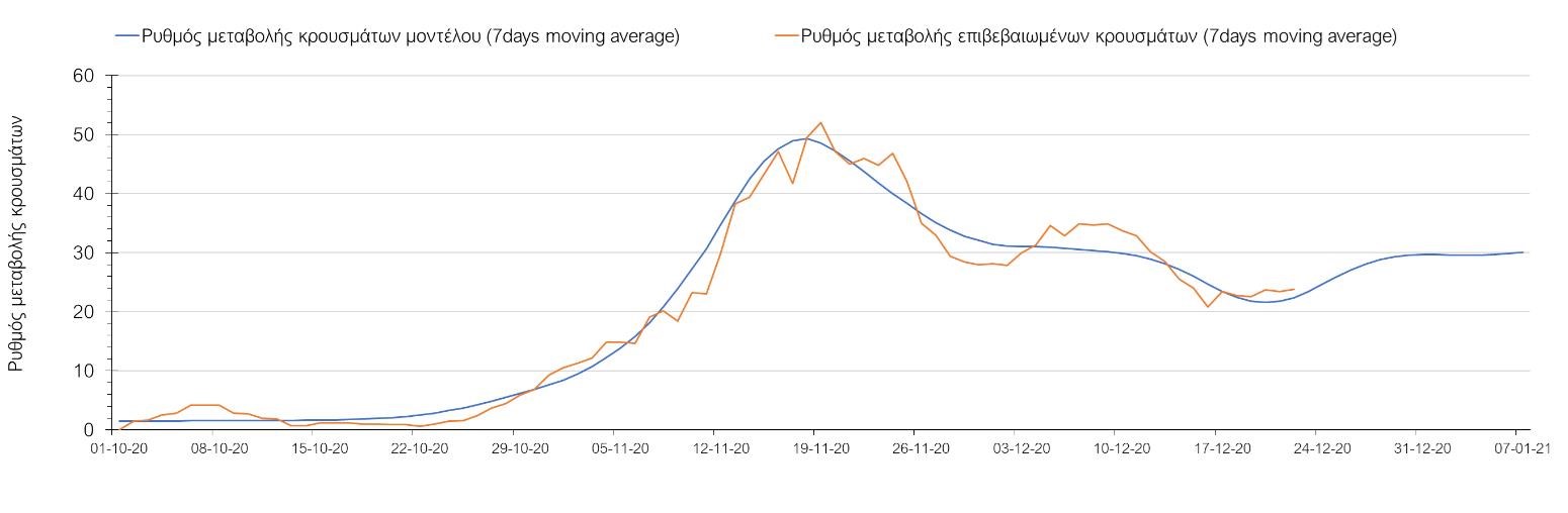 Η πορεία της μέσης εβδομαδιαίας τιμής των κρουσμάτων όπως έχουν καταγραφεί από τον ΕΟΔΥ και η αναμενόμενη πορεία τους μέχρι το τέλος του χρόνου, σύμφωνα με την υπάρχουσα κατάσταση και την απόφαση παράτασης του lockdown μέχρι και τις 7 Ιανουαρίου, όπως προδιαγράφεται από την υπολογιστική πλατφόρμα CORE για την Ελληνική επικράτεια, αποτυπώνονται στο Σχήμα 3.