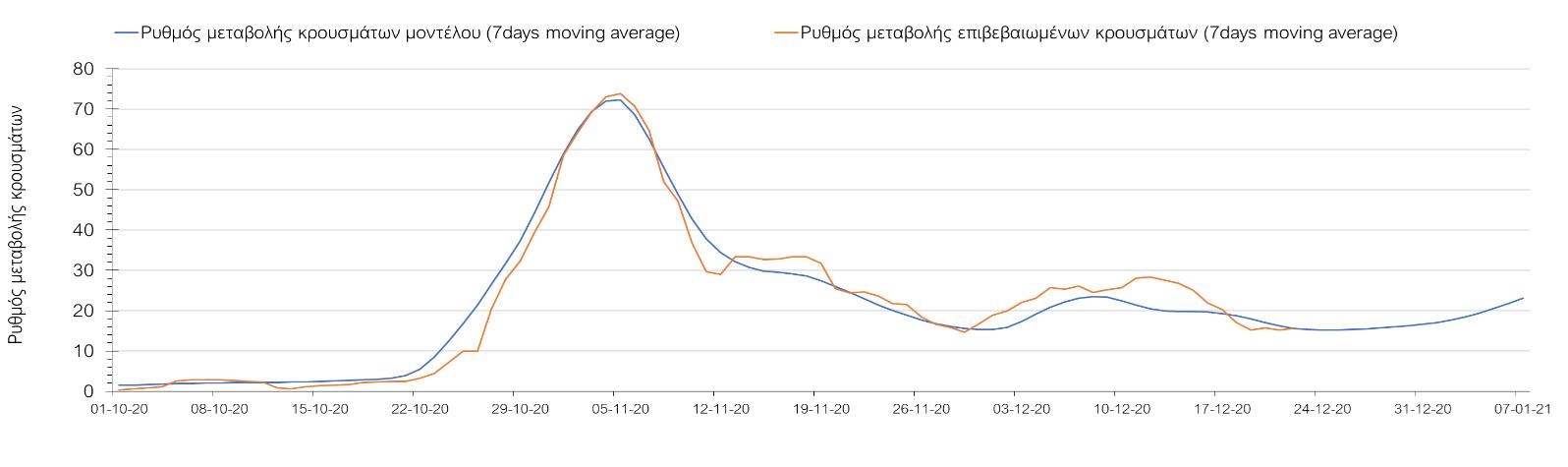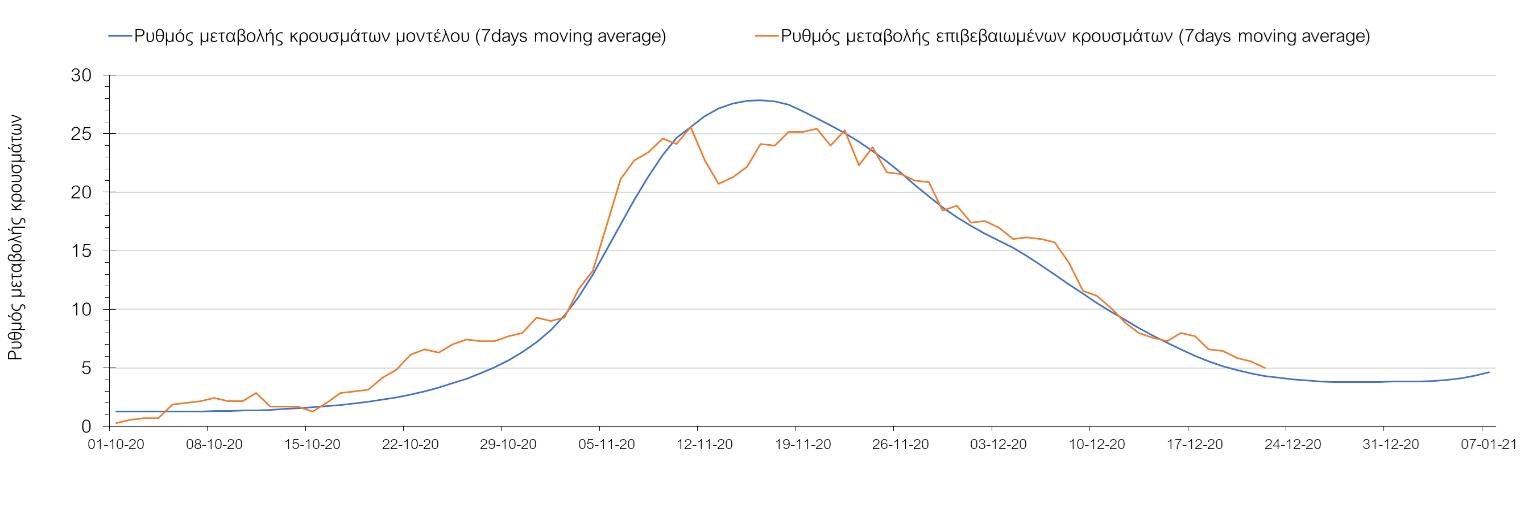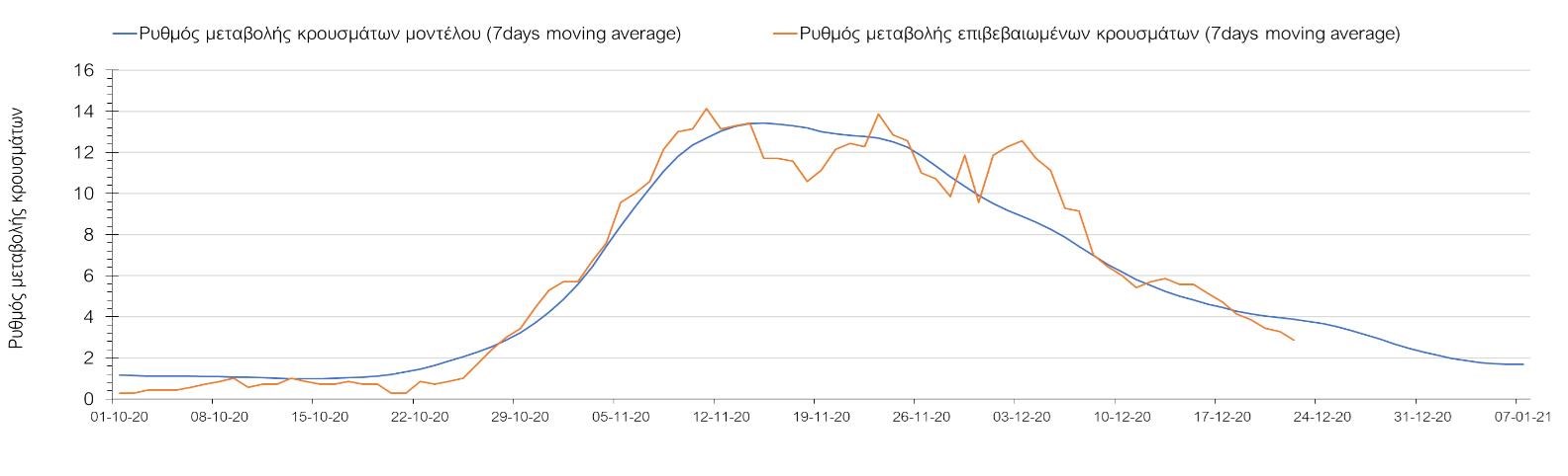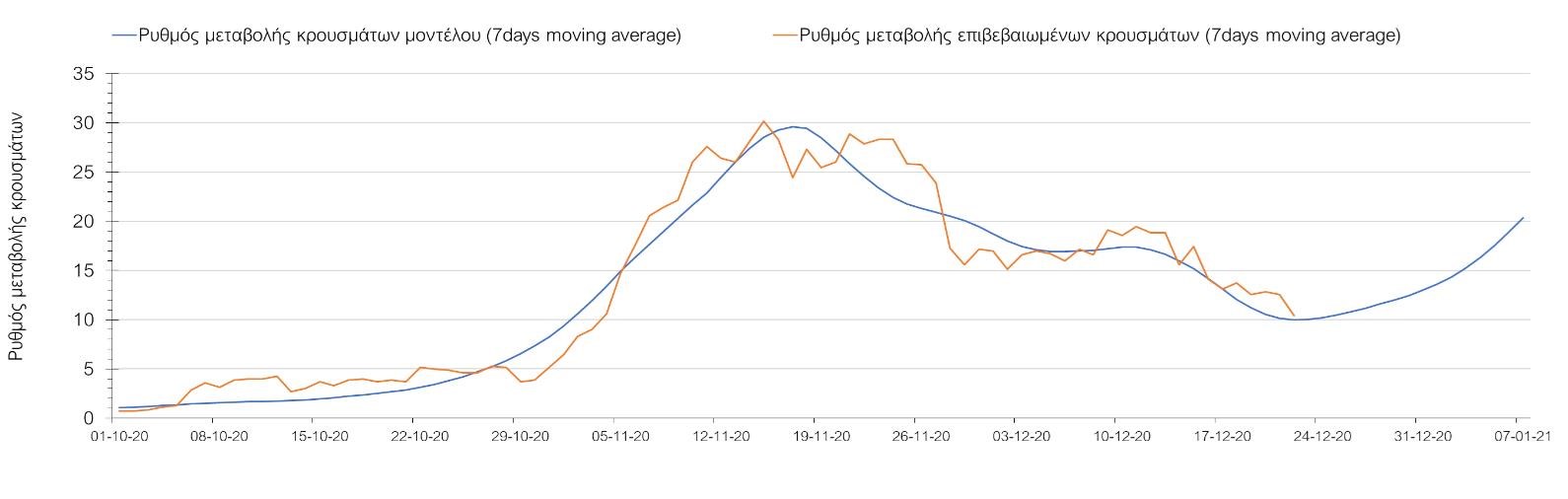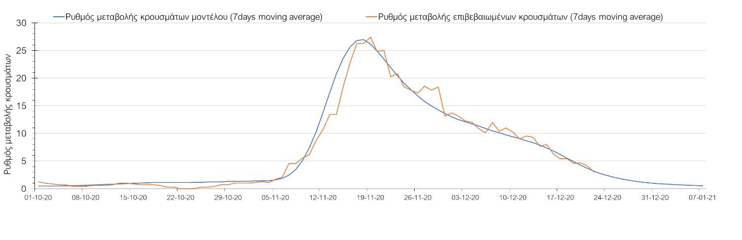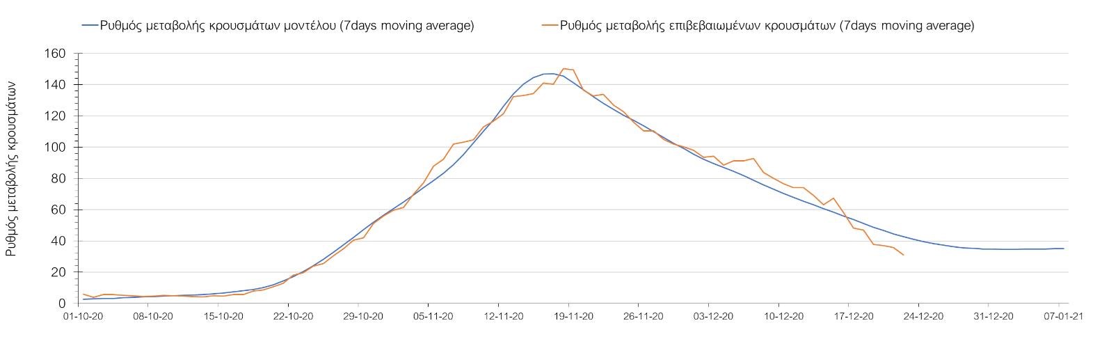 Η πορεία της μέσης εβδομαδιαίας τιμής των κρουσμάτων όπως έχουν καταγραφεί από τον ΕΟΔΥ και η αναμενόμενη πορεία τους μέχρι το τέλος του χρόνου, σύμφωνα με την υπάρχουσα κατάσταση και την απόφαση παράτασης του lockdown μέχρι και τις 7 Ιανουαρίου, όπως προδιαγράφεται από την υπολογιστική πλατφόρμα CORE για την Ελληνική επικράτεια, αποτυπώνονται στο Σχήμα 3.
