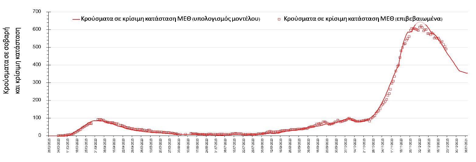 Η συνολική πορεία των κρουσμάτων, αλλά και η αρχή αποκλιμάκωσης που παρατηρείται τις τελευταίες ημέρες στον αριθμό των ασθενών σε κρίσιμη κατάσταση (διασωληνομένοι σε ΜΕΘ), μετά τα χθεσινά αποτελέσματα, συνάδει με τις προσομοιώσεις του μοντέλου CORE για τον επόμενο μήνα. Παρά την εφαρμογή οριζοντίων μέτρων ανάσχεσης της πανδημίας, η πορεία της διαφοροποιείται από περιοχή σε περιοχή, ενώ παραμένουν περιοχές που η κατάσταση δεν εμφανίζει σταθερά σημάδια πτωτικής πορείας. Οι παραπάνω παρατηρήσεις τείνουν στο συμπέρασμα ότι η διαχείριση του υγειονομικού κινδύνου θα πρέπει να εξεταστεί σε τοπικό επίπεδο από τη στιγμή που συνολικά στη χώρα φαίνεται να έχουμε ξεπεράσει την κορύφωση του συγκεκριμένου επιδημικού κύματος του Νοεμβρίου.