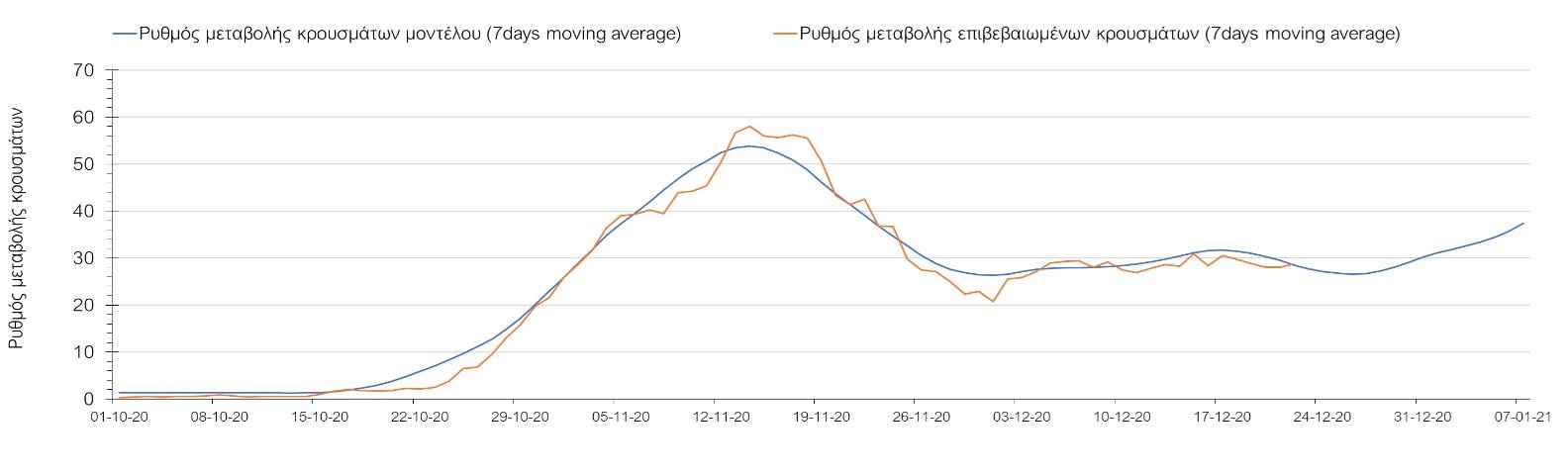 Σχήμα 3. Πορεία του ημερησίου αριθμού των κρουσμάτων (κυλιόμενος μέσος όρος 7 ημερών) στην Ελληνική επικράτεια