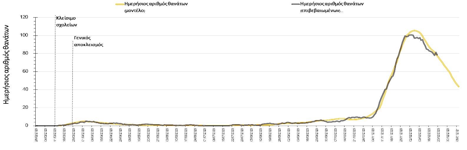 Ο αριθμός θανάτων (83) είναι ελαφρά μειωμένος σε σχέση με τη Δευτέρα (85), και ακολουθεί με υστέρηση δύο εβδομάδων την καμπύλη αποκλιμάκωσης σε ό,τι αφορά στα επιβεβαιωμένα κρούσματα. Ο γενικά υψηλός αριθμός των θανάτων που καταγράφεται ακόμα και αυτή την εβδομάδα σε συνδυασμό με την παρατηρούμενη μείωση των επιβεβαιωμένων κρουσμάτων σε σχέση με την προηγούμενη εβδομάδα μπορεί να ερμηνευθεί από το γεγονός ότι έγινε πιο συνεπής εφαρμογή του lockdown μετά τις 17-18 Νοεμβρίου, περίπου 10 μέρες μετά την ανακοίνωση του.