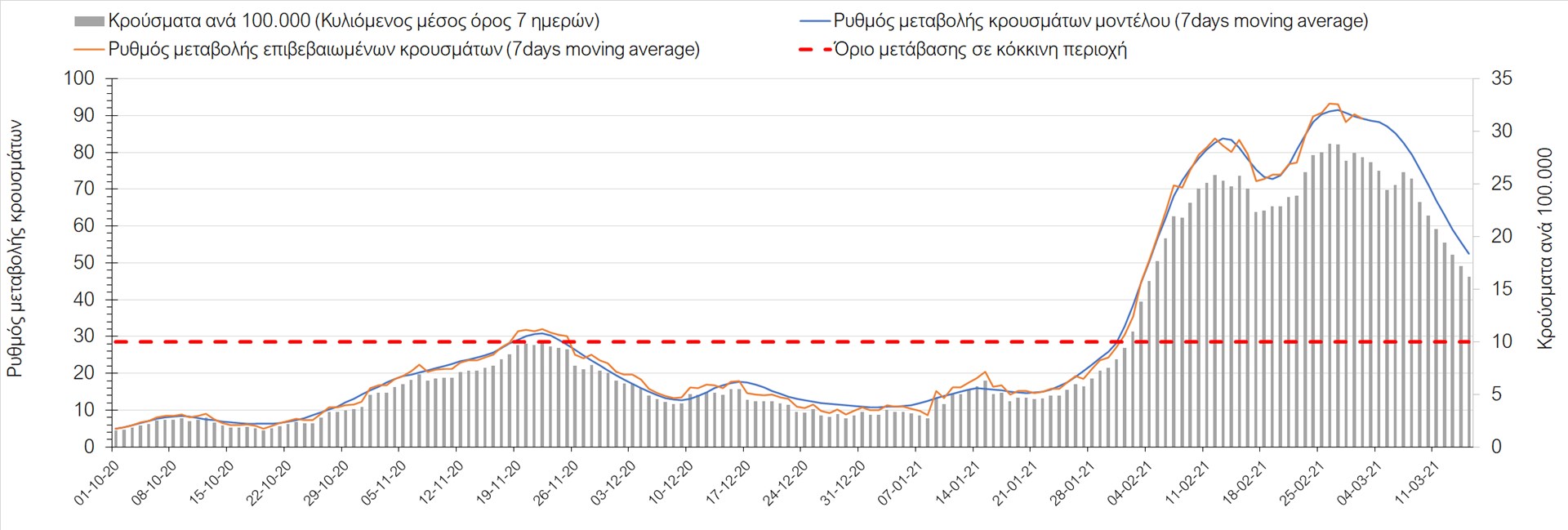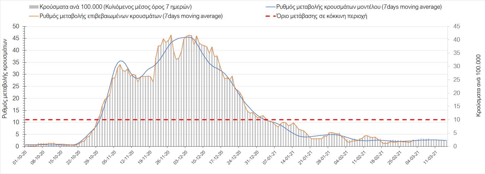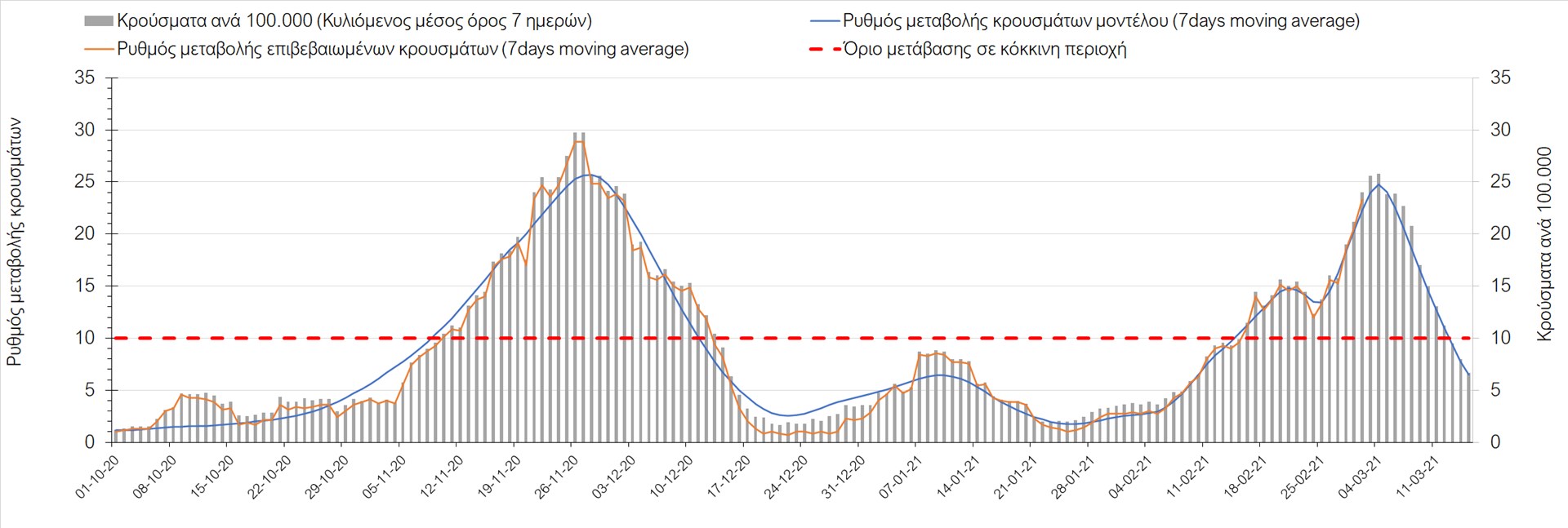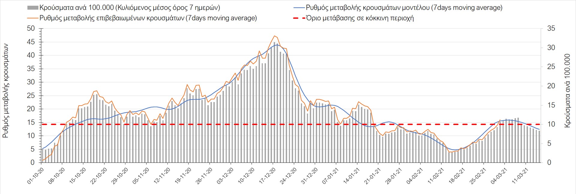 Σχήμα 27. Πορεία του ημερησίου αριθμού των κρουσμάτων (κυλιόμενος μέσος όρος 7 ημερών) στην Πιερία