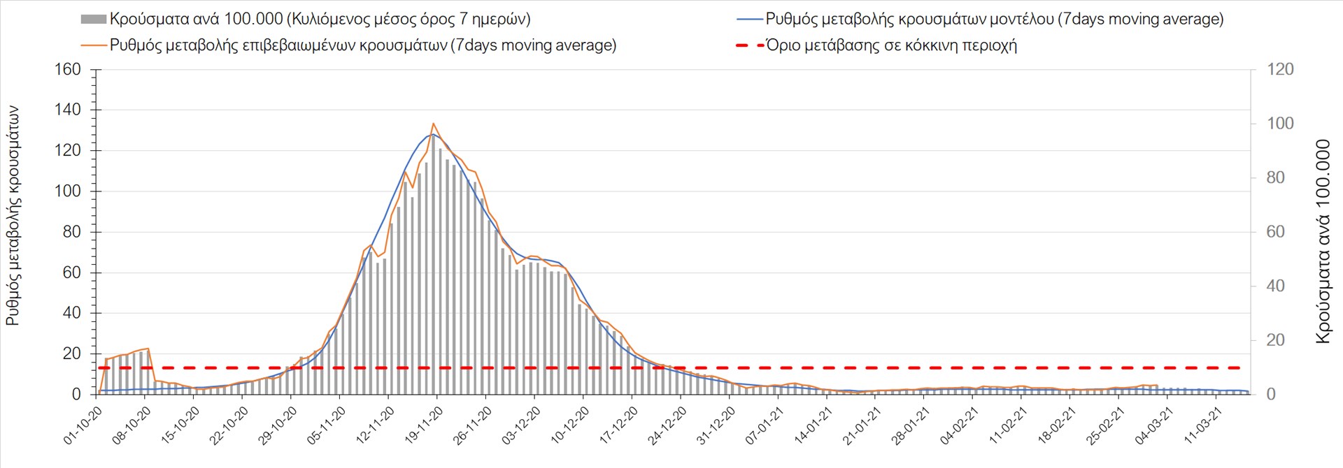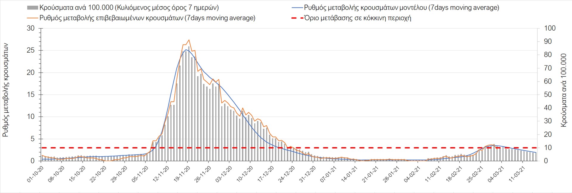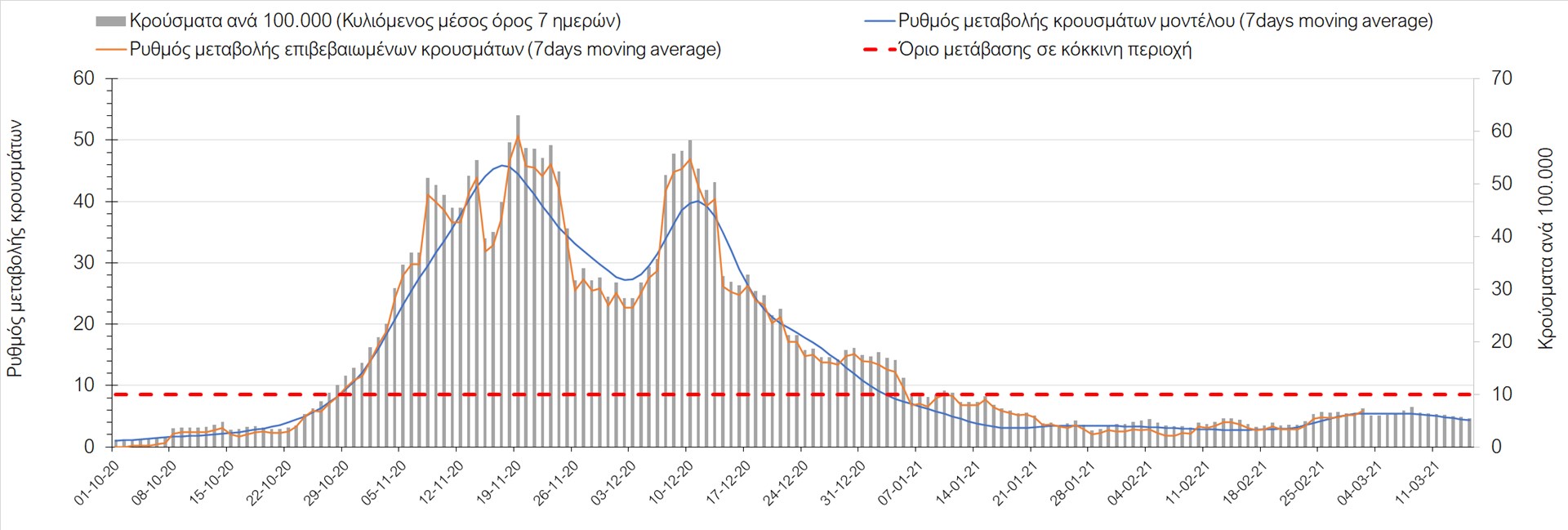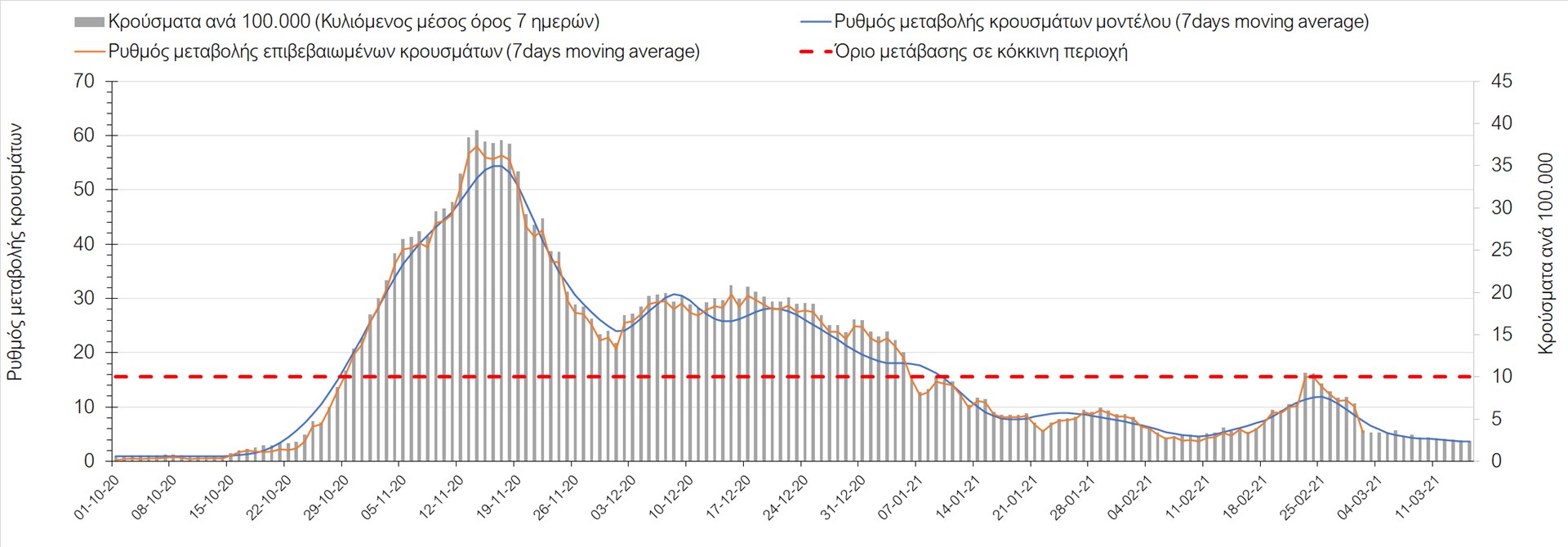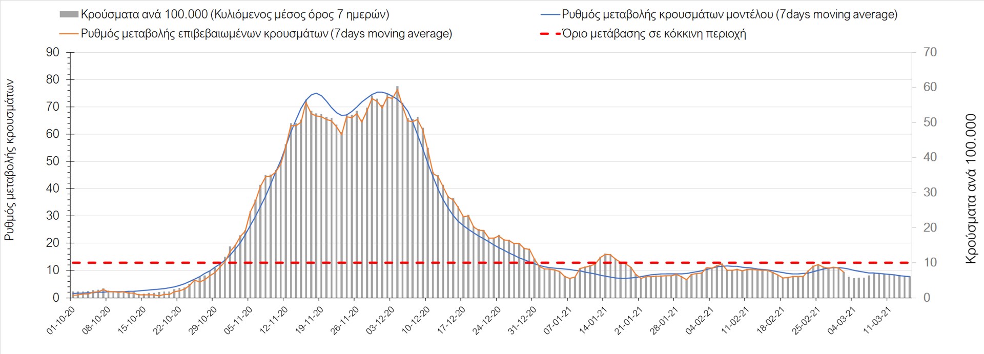 Σχήμα 27. Πορεία του ημερησίου αριθμού των κρουσμάτων (κυλιόμενος μέσος όρος 7 ημερών) στην Πιερία