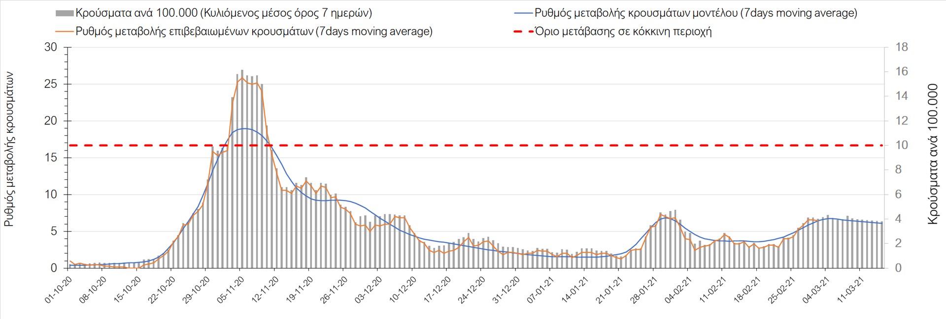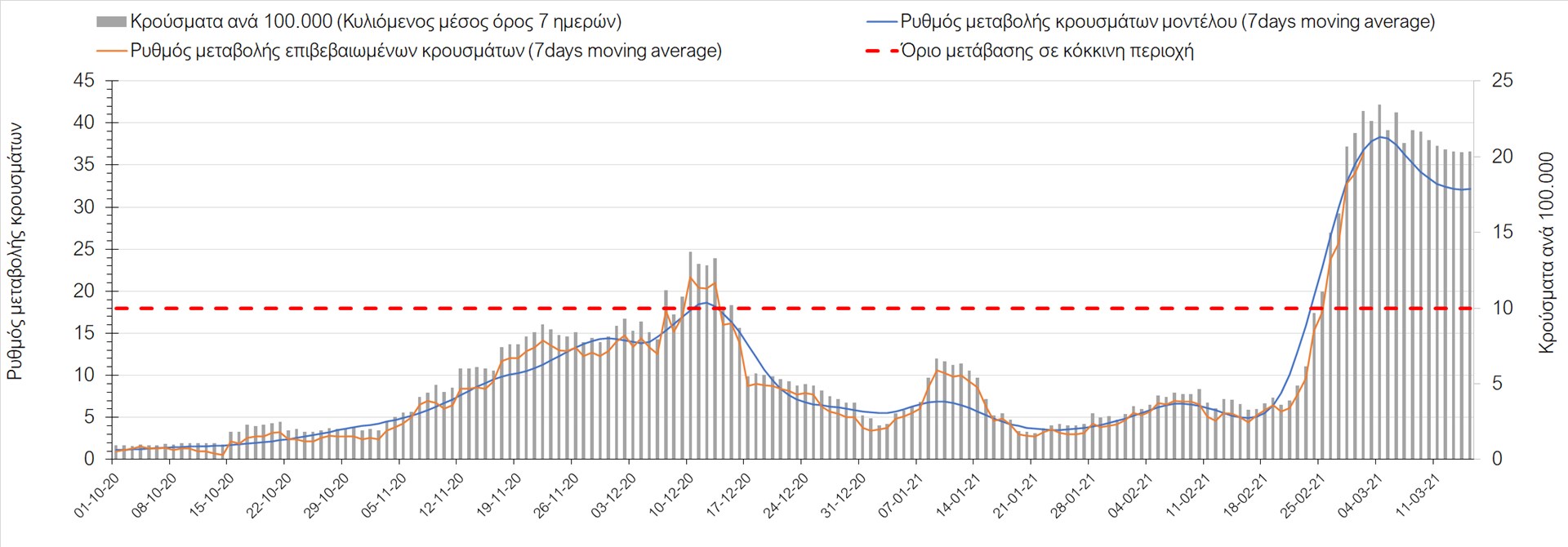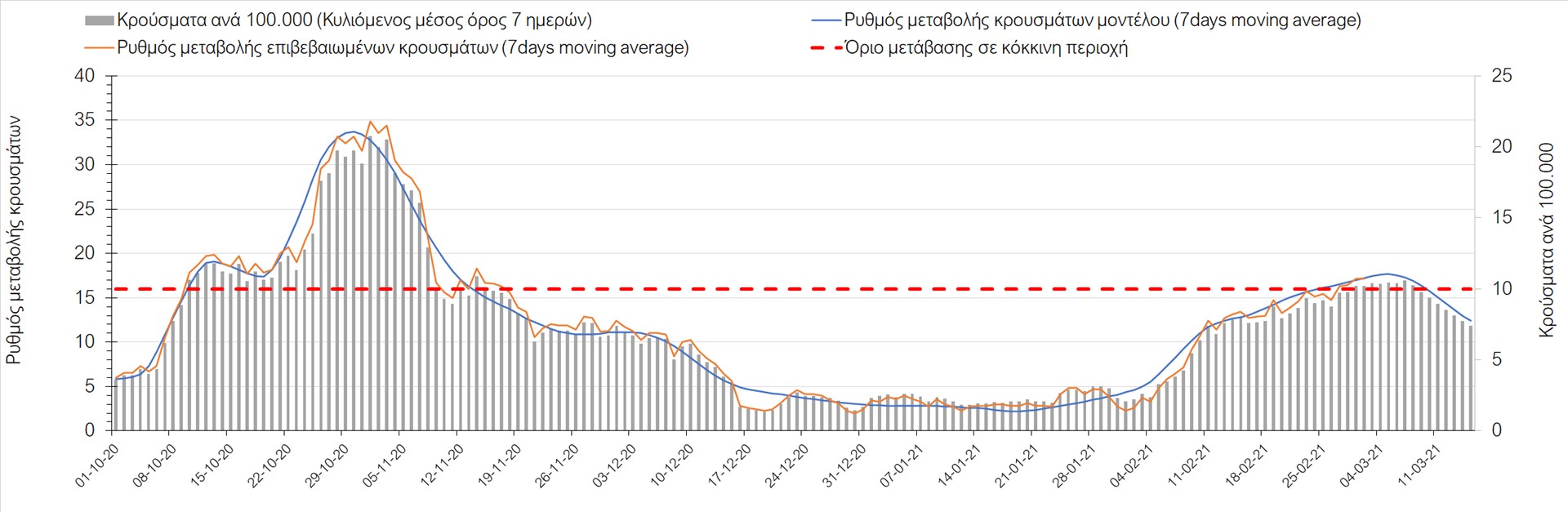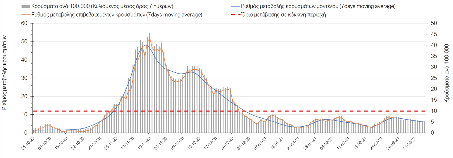 Σχήμα 27. Πορεία του ημερησίου αριθμού των κρουσμάτων (κυλιόμενος μέσος όρος 7 ημερών) στην Πιερία
