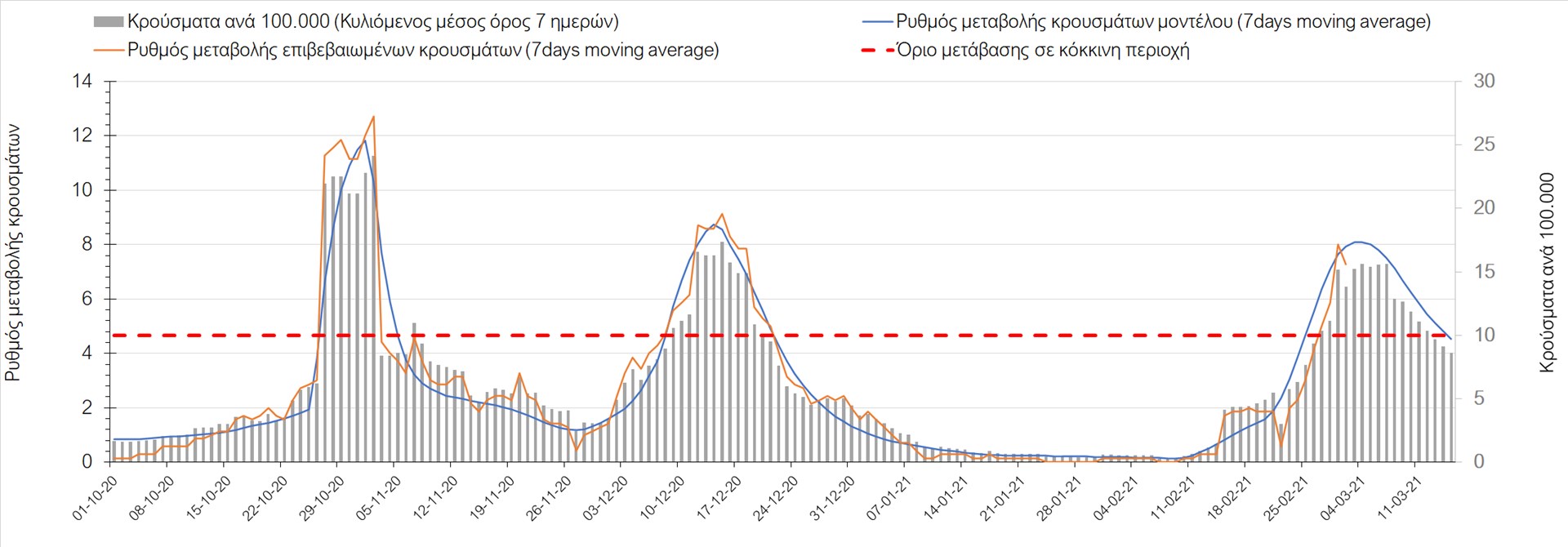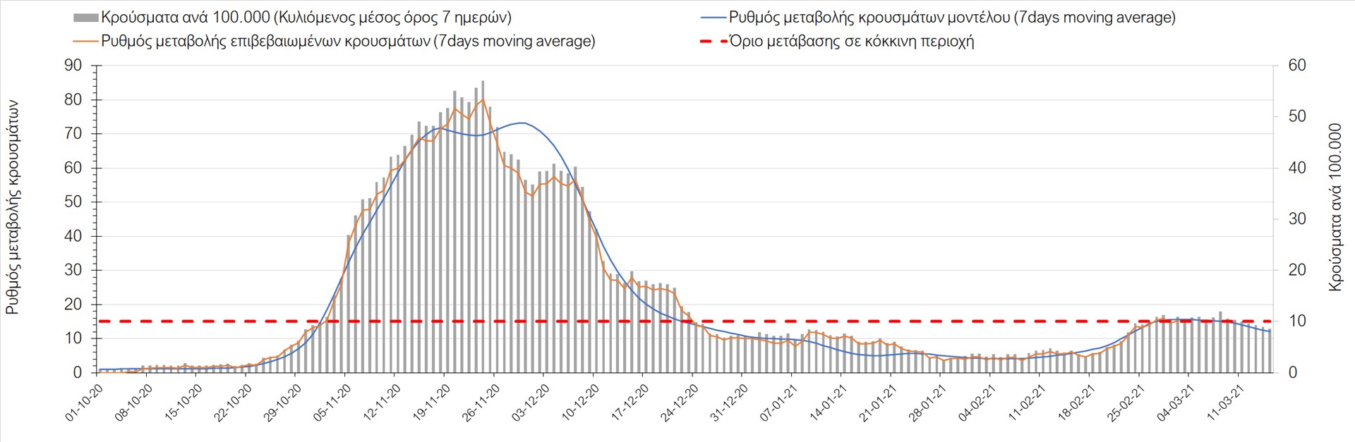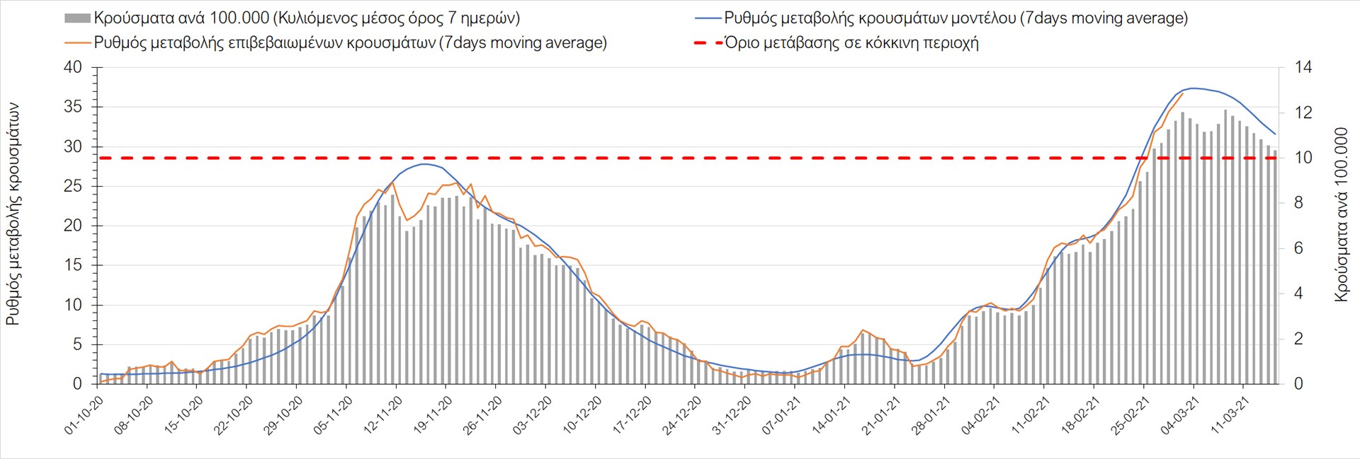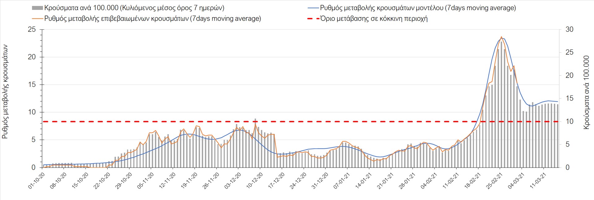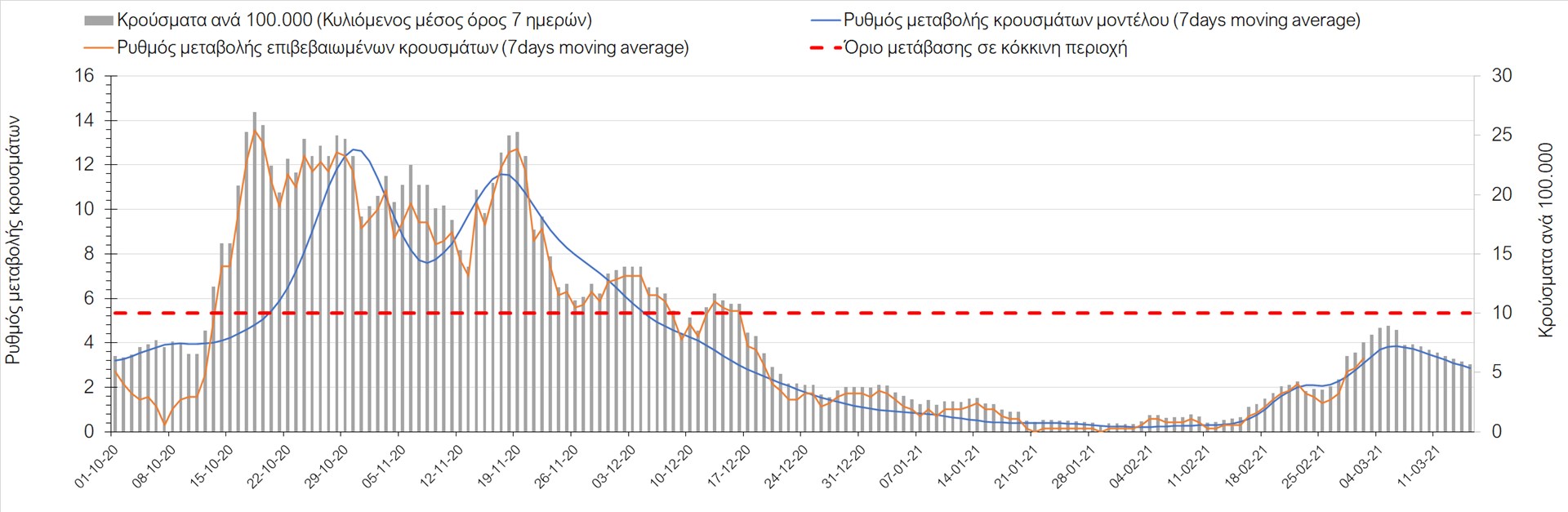 Σχήμα 27. Πορεία του ημερησίου αριθμού των κρουσμάτων (κυλιόμενος μέσος όρος 7 ημερών) στην Πιερία