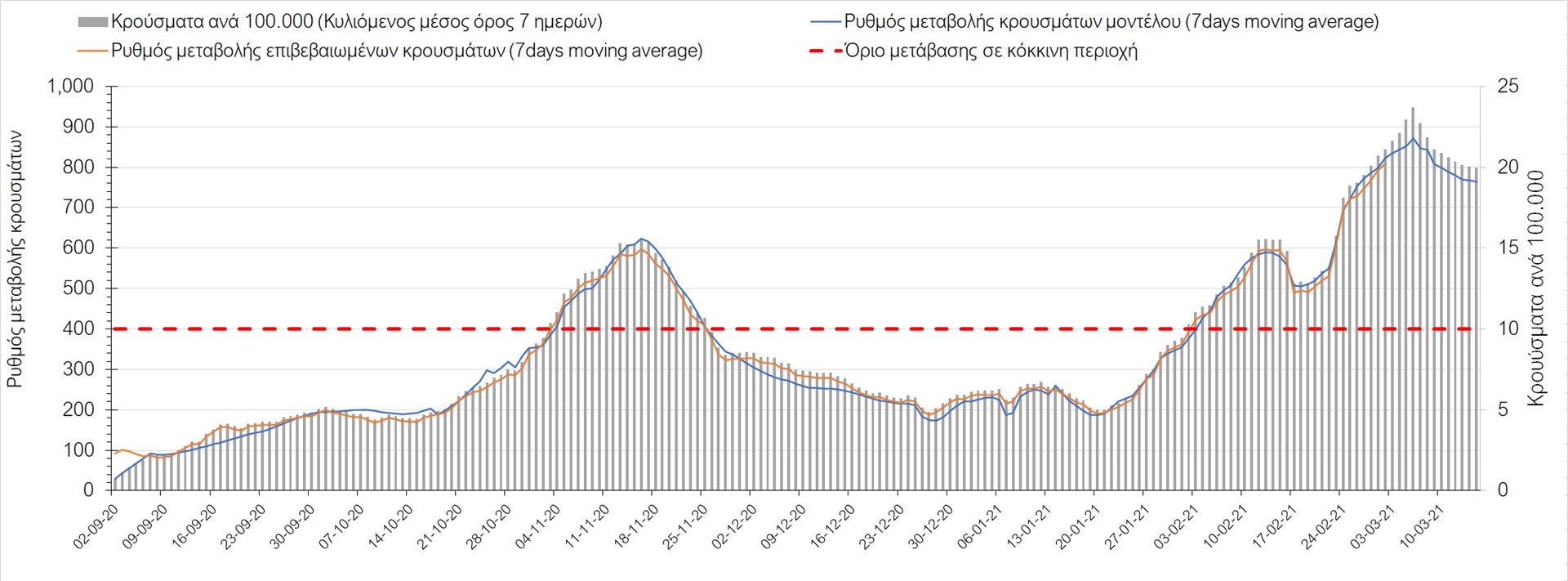 Σχήμα 3. Πορεία του ημερησίου αριθμού των κρουσμάτων (κυλιόμενος μέσος όρος 7 ημερών) στην Ελληνική επικράτειαΤο ίδιο σενάριο μέτρων, έχει ληφθεί υπόψη στα αποτελέσματα του μοντέλου που παρουσιάζονται σε επιμέρους περιοχές της επικράτειας.