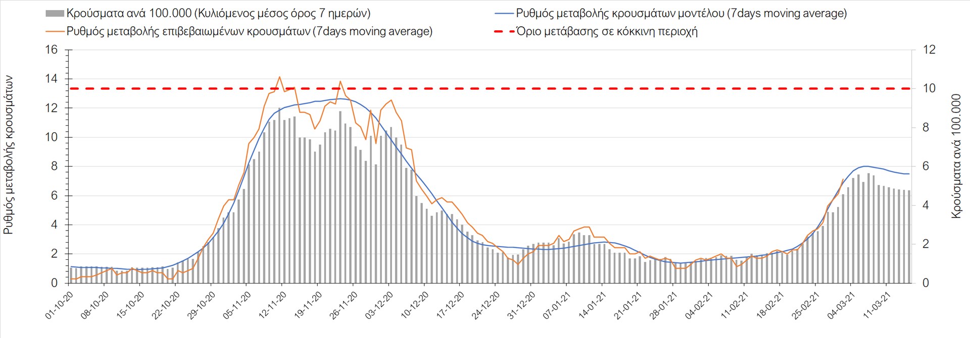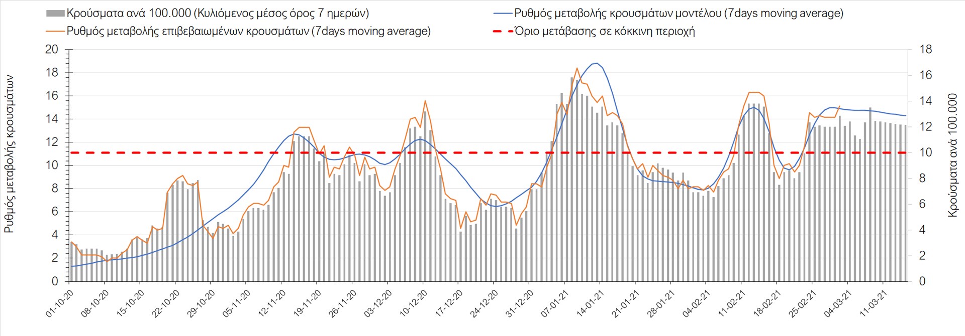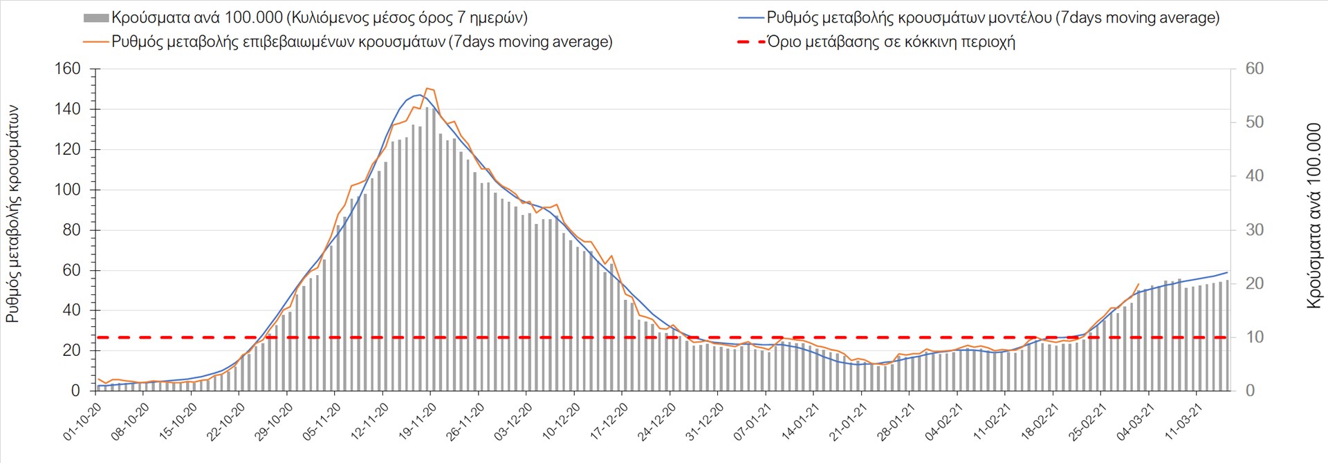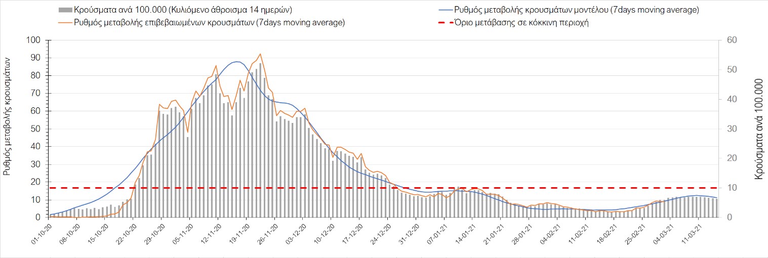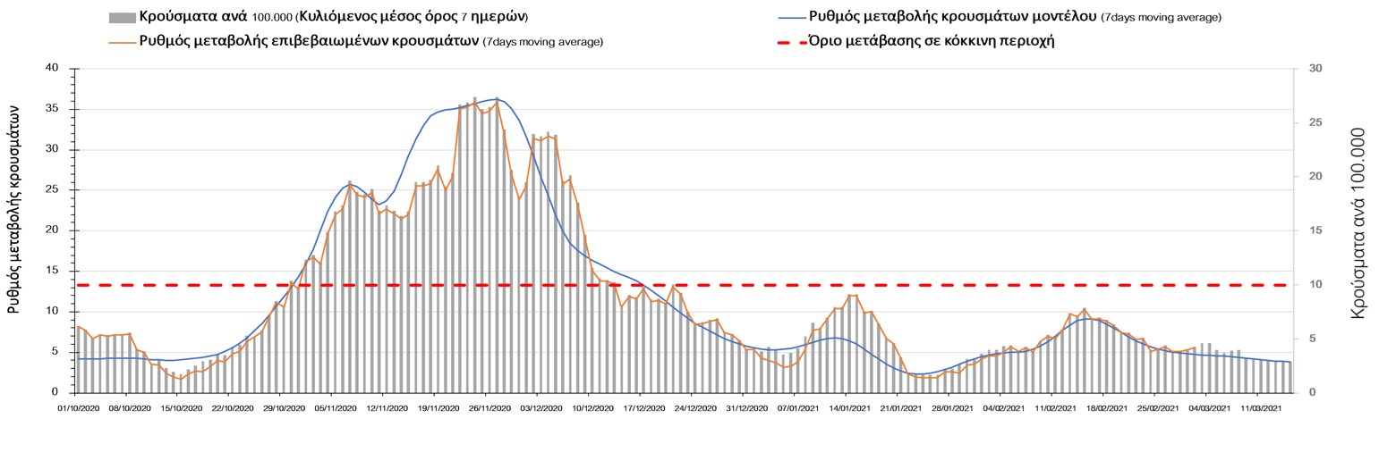 Όπως φαίνεται από το διάγραμμα, από τις 8 Ιανουαρίου έχουμε μια αύξηση κρουσμάτων μέχρι τις 11 Ιανουαρίου η οποία οφείλεται στη μείωση της περιστολής που σημειώθηκε στις γιορτές. Από τις 11 μέχρι τις 18 Ιανουαρίου προβλεπόταν μια μείωση κρουσμάτων λόγω της εφαρμογής του lockdown και η οποία όντως παρατηρήθηκε. Εντούτοις, όπως είχαμε προβλέψει, από τις 23 Ιανουαρίου και έπειτα διαφαίνεται αύξηση στον κυλιόμενο μέσο όρο των κρουσμάτων. Η εφαρμογή των περιοριστικών μέτρων, σε συνδυασμό με την επικρατούσα μετεωρολογία πρόκειται να επιφέρει μια σταθεροποίηση ή και ελαφρά μείωση των κρουσμάτων τις επόμενες ημέρες. Παρ’ολ’αυτά, μετά από τις 17/2 σημειώνεται μια αύξηση των κρουσμάτων, η οποία αναμένουμε να συνεχιστεί.