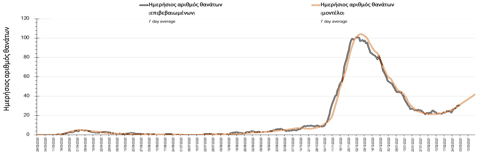Σχήμα 2. Αριθμός θανάτων (κυλιόμενος μέσος όρος 7 ημερών) σύμφωνα με τα στοιχεία του ΕΟΔΥ και τις προβλέψεις της υπολογιστικής πλατφόρμας CORE.Η πορεία της μέσης εβδομαδιαίας τιμής των κρουσμάτων, καθώς και του κυλιόμενου μέσου όρου 7 ημερών του αριθμού των κρουσμάτων ανά 100.000 πληθυσμού, όπως έχουν καταγραφεί από τον ΕΟΔΥ και η αναμενόμενη πορεία τους όπως προδιαγράφεται από την υπολογιστική πλατφόρμα CORE για την Ελληνική επικράτεια μέχρι το τέλος του Ιανουαρίου, αποτυπώνονται στο Σχήμα 3. Η ανάλυσή μας έχει επικαιροποιηθεί με βάση την απόφαση εφαρμογής αυστηρού lockdown από την Κυριακή 3 Ιανουαρίου μέχρι και τις 17 Ιανουαρίου. Στις 11 Ιανουαρίου λάβαμε υπόψη το άνοιγμα της πρωτοβάθμιας εκπαίδευσης, ενώ το άνοιγμα των βιβλιοπωλείων, κομμωτηρίων, λιανικού εμπορίου και των εμπορικών καταστημάτων από τη Δευτέρα 18/1, ενώ επιπλέον, έχει ληφθεί υπόψη το άνοιγμα τις δευτεροβάθμιας εκπαίδευσης από τη Δευτέρα 1 Φεβρουαρίου στις κίτρινες περιοχές. Στις κόκκινες περιοχές, από τη Δευτέρα 1 Φεβρουαρίου έχει γίνει άνοιγμα μόνο των Γυμνασίων (και συνεχίζεται το καθεστώς τηλε-εκπαίδευση για τα Λύκεια), στις οποίες επίσης, η λειτουργία του λιανεμπορίου θα πραγματοποιείται με τη μέθοδο click away, και η λειτουργία καταστημάτων ένδυσης, υπόδησης, βιβλιοπωλείων, κομμωτηρίων και καταστημάτων προσωπικής περιποίησης με προκαθορισμένο ραντεβού (click-in-a-shop) και με 1 άτομο ανά 25 τ.μ. Από την Τρίτη έχουν ληφθεί υπόψιν τα περιοριστικά μέτρα που ανακοινώθηκαν στις 5 Φεβρουαρίου) για Αθήνα, Θεσσαλονίκη, Πάτρα, Χαλκίδα και Χαλκιδική και που τέθηκαν σε ισχύ από το Σάββατο 6 Φεβρουαρίου και μέχρι τη Δευτέρα 15 Φεβρουαρίου, ενώ επιπλέον για την Αθήνα και στο βαθμό που αυτή επηρεάζει όλη την υπόλοιπη Ελλάδα, το αυστηρό lock down, με εφαρμογή από την Πέμπτη 11/2 έως και τις 15/3.