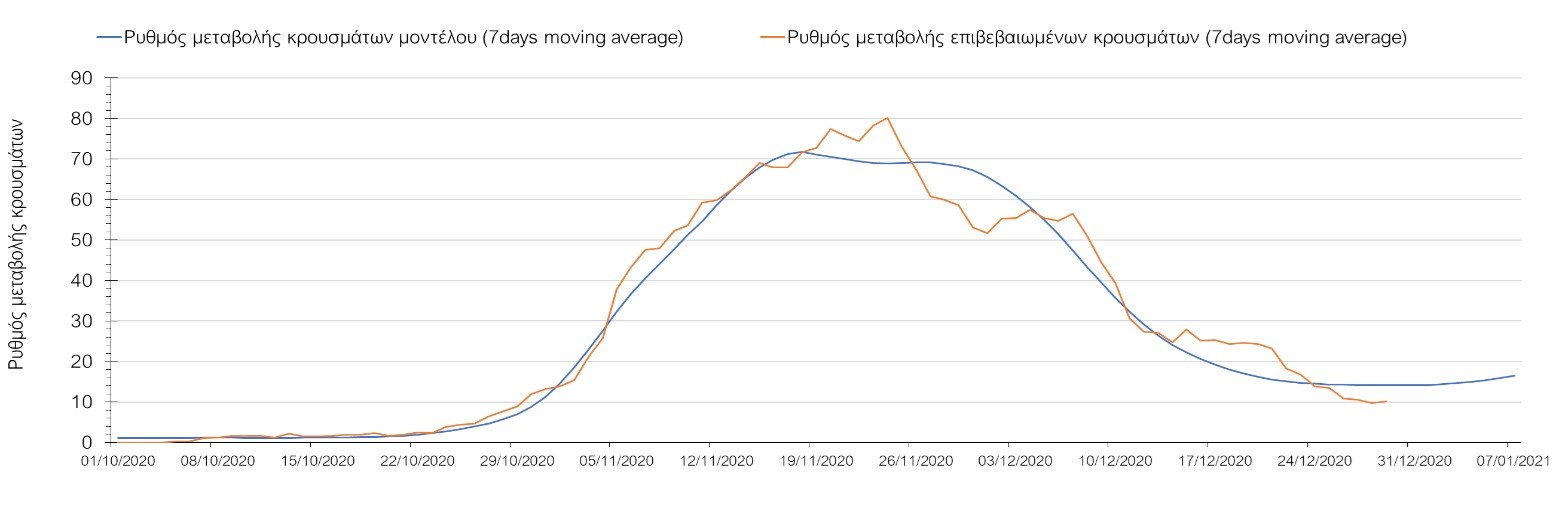 Και στις δύο περιπτώσεις φαίνεται ότι βρισκόμαστε περίπου στο 48% της αποκλιμάκωσης όπως είχαμε προβλέψει (δες σχήματα 1 και 2). Περιμένουμε ότι αυτή η αποκλιμάκωση θα συνεχιστεί αλλά με χαμηλότερο ρυθμό στις επόμενες ημέρες και σε ό,τι αφορά στον αριθμό των ασθενών που είναι διασωληνωμένοι σε ΜΕΘ και στους θανάτους από COVID-19.Η πορεία της μέσης εβδομαδιαίας τιμής των κρουσμάτων όπως έχουν καταγραφεί από τον ΕΟΔΥ και η αναμενόμενη πορεία τους μέχρι το τέλος του χρόνου, σύμφωνα με την την απόφαση παράτασης του lockdown μέχρι και τις 7 Ιανουαρίου, όπως προδιαγράφεται από την υπολογιστική πλατφόρμα CORE για την Ελληνική επικράτεια, αποτυπώνονται στο Σχήμα 3.