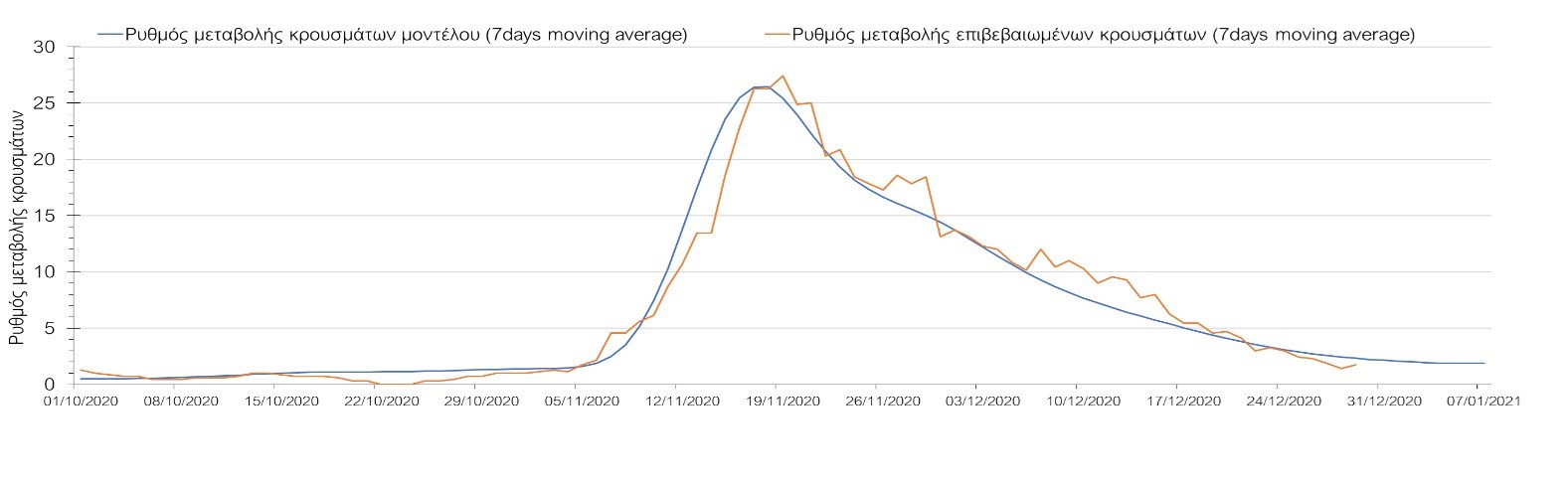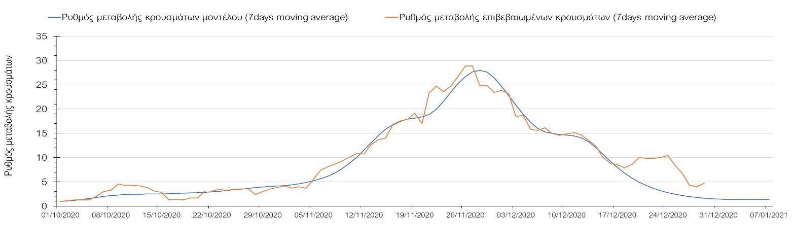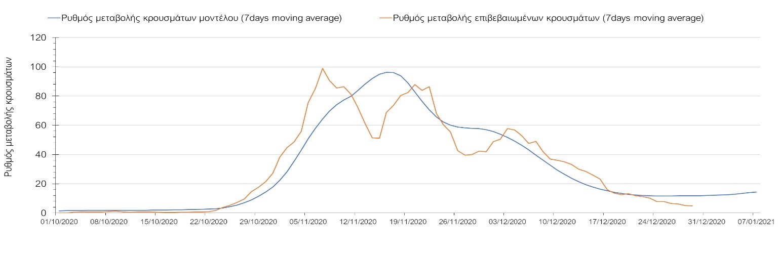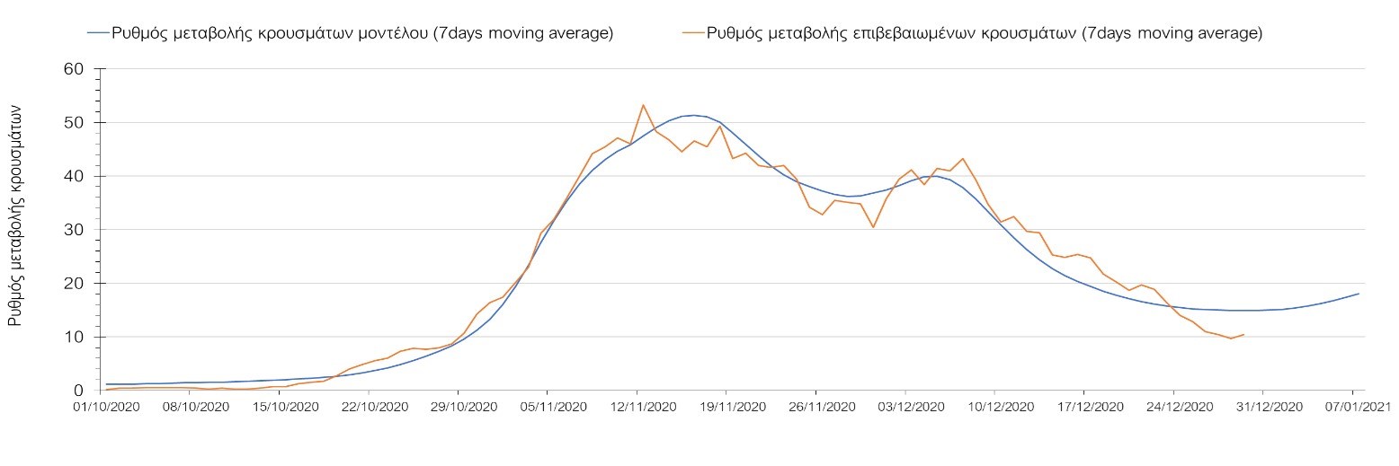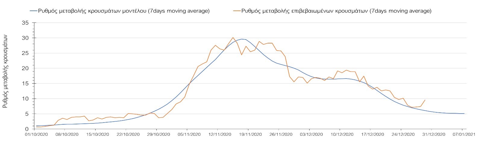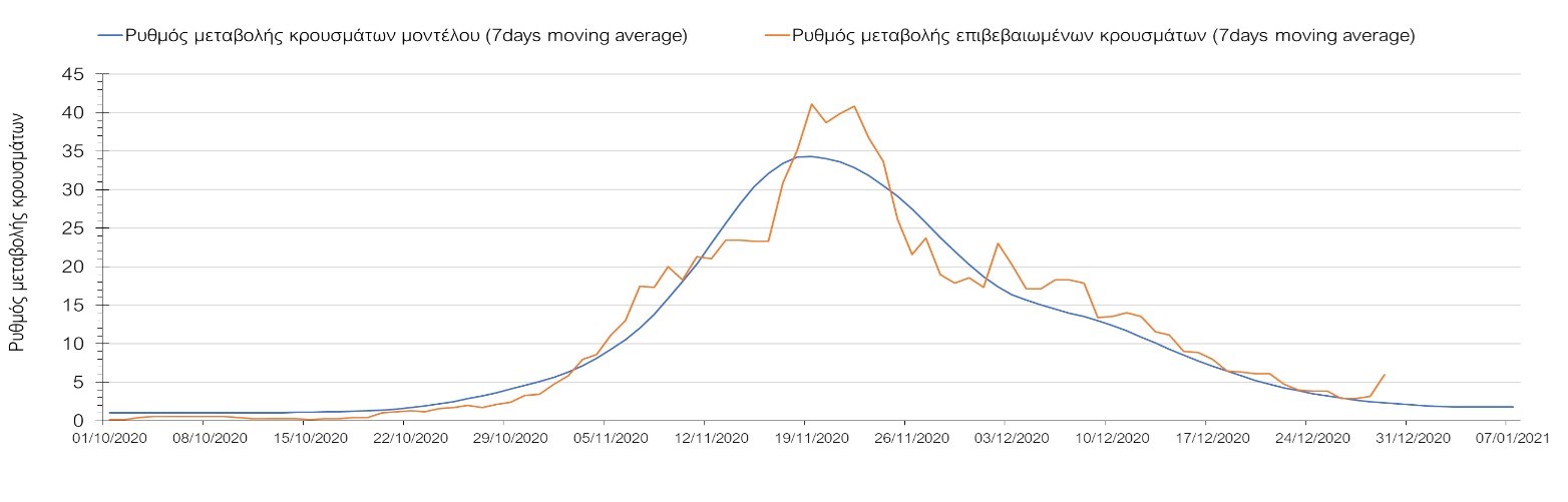 Και στις δύο περιπτώσεις φαίνεται ότι βρισκόμαστε περίπου στο 48% της αποκλιμάκωσης όπως είχαμε προβλέψει (δες σχήματα 1 και 2). Περιμένουμε ότι αυτή η αποκλιμάκωση θα συνεχιστεί αλλά με χαμηλότερο ρυθμό στις επόμενες ημέρες και σε ό,τι αφορά στον αριθμό των ασθενών που είναι διασωληνωμένοι σε ΜΕΘ και στους θανάτους από COVID-19.Η πορεία της μέσης εβδομαδιαίας τιμής των κρουσμάτων όπως έχουν καταγραφεί από τον ΕΟΔΥ και η αναμενόμενη πορεία τους μέχρι το τέλος του χρόνου, σύμφωνα με την την απόφαση παράτασης του lockdown μέχρι και τις 7 Ιανουαρίου, όπως προδιαγράφεται από την υπολογιστική πλατφόρμα CORE για την Ελληνική επικράτεια, αποτυπώνονται στο Σχήμα 3.