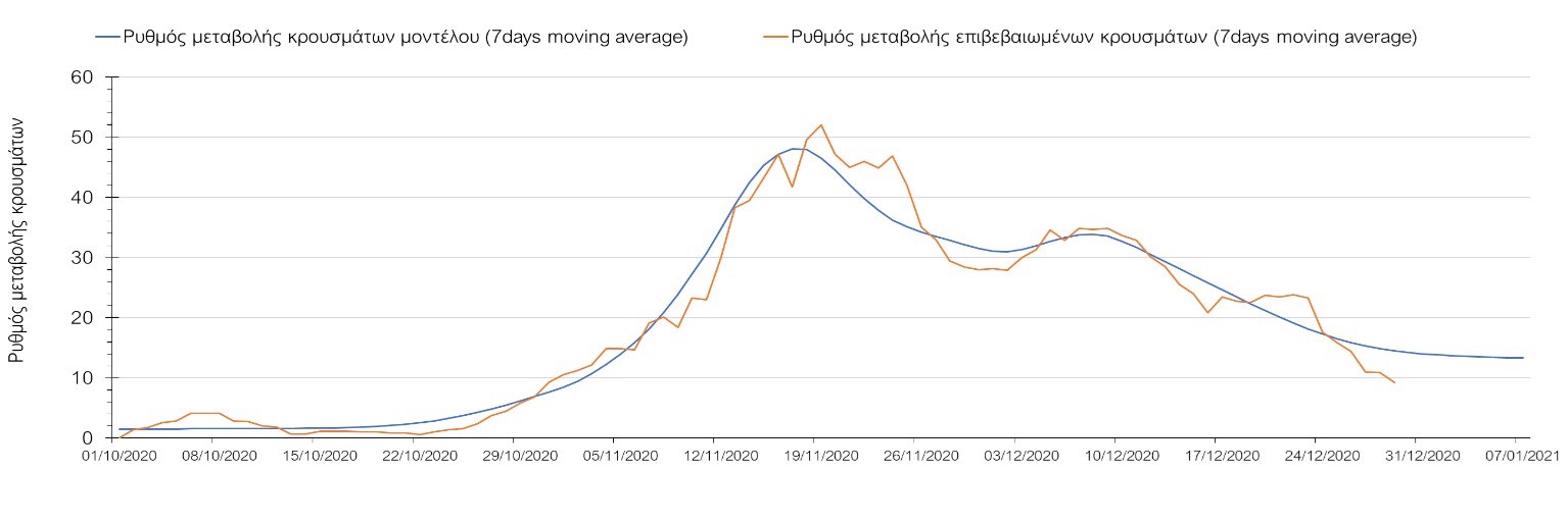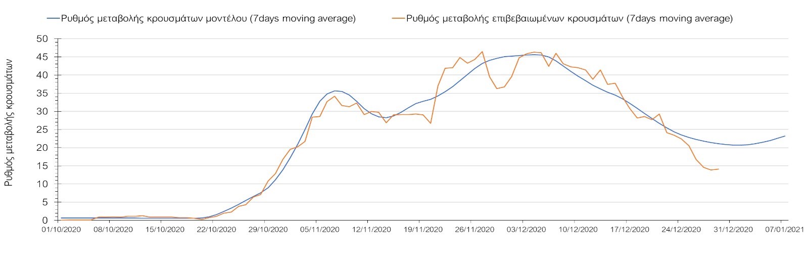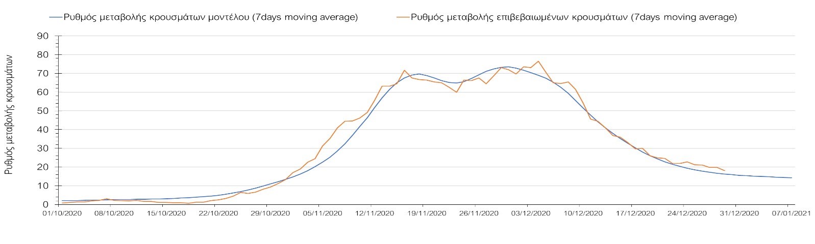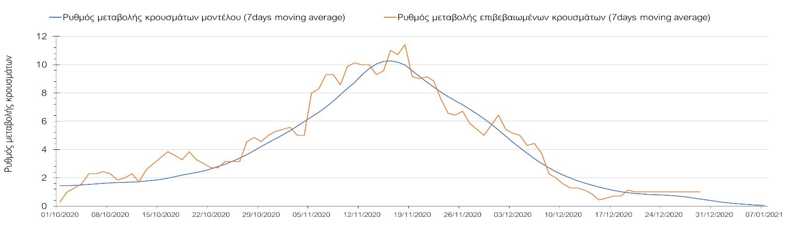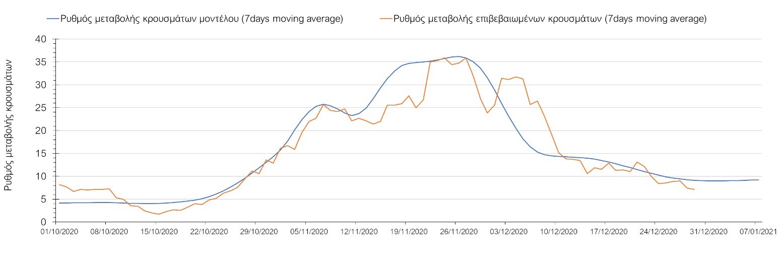 Και στις δύο περιπτώσεις φαίνεται ότι βρισκόμαστε περίπου στο 48% της αποκλιμάκωσης όπως είχαμε προβλέψει (δες σχήματα 1 και 2). Περιμένουμε ότι αυτή η αποκλιμάκωση θα συνεχιστεί αλλά με χαμηλότερο ρυθμό στις επόμενες ημέρες και σε ό,τι αφορά στον αριθμό των ασθενών που είναι διασωληνωμένοι σε ΜΕΘ και στους θανάτους από COVID-19.Η πορεία της μέσης εβδομαδιαίας τιμής των κρουσμάτων όπως έχουν καταγραφεί από τον ΕΟΔΥ και η αναμενόμενη πορεία τους μέχρι το τέλος του χρόνου, σύμφωνα με την την απόφαση παράτασης του lockdown μέχρι και τις 7 Ιανουαρίου, όπως προδιαγράφεται από την υπολογιστική πλατφόρμα CORE για την Ελληνική επικράτεια, αποτυπώνονται στο Σχήμα 3.