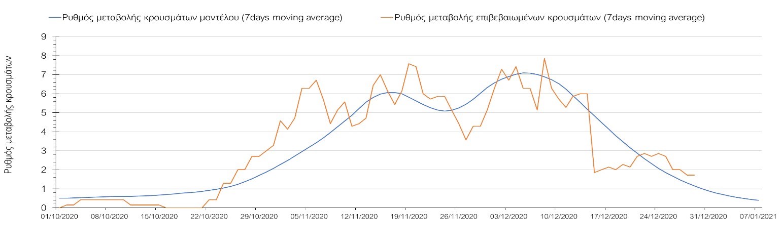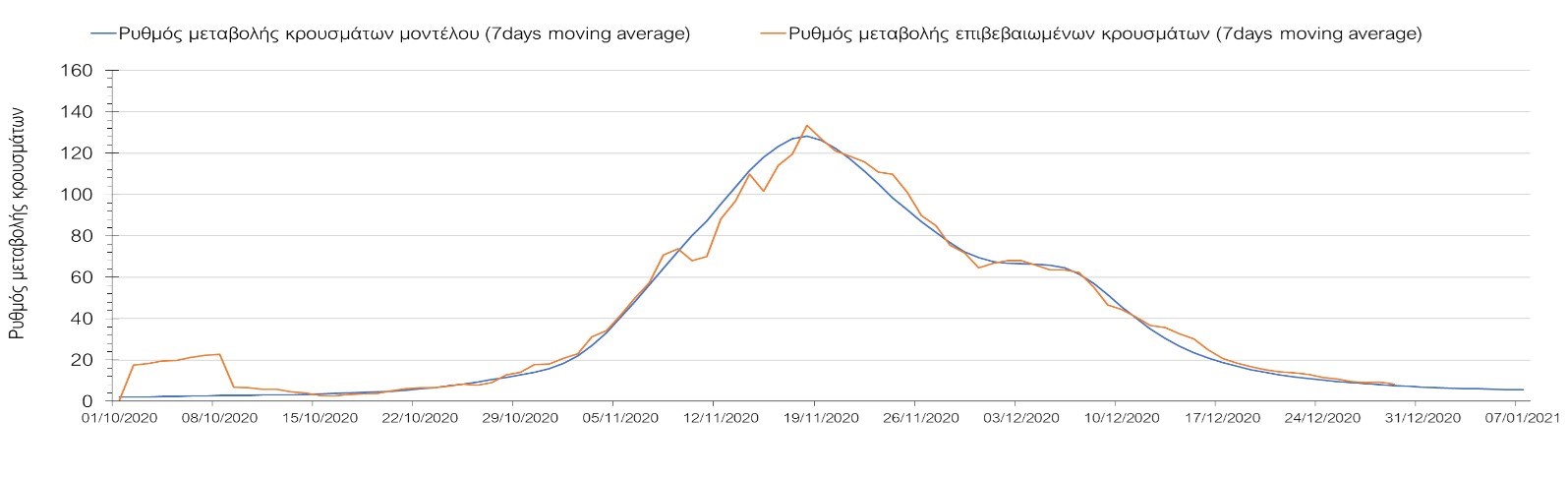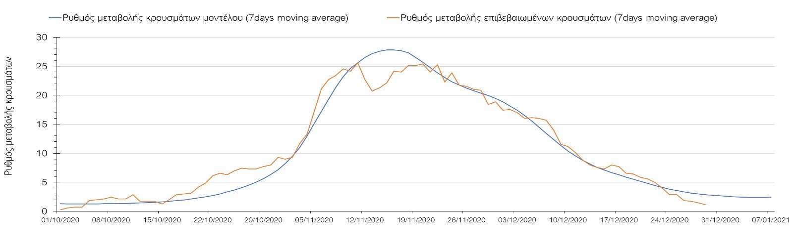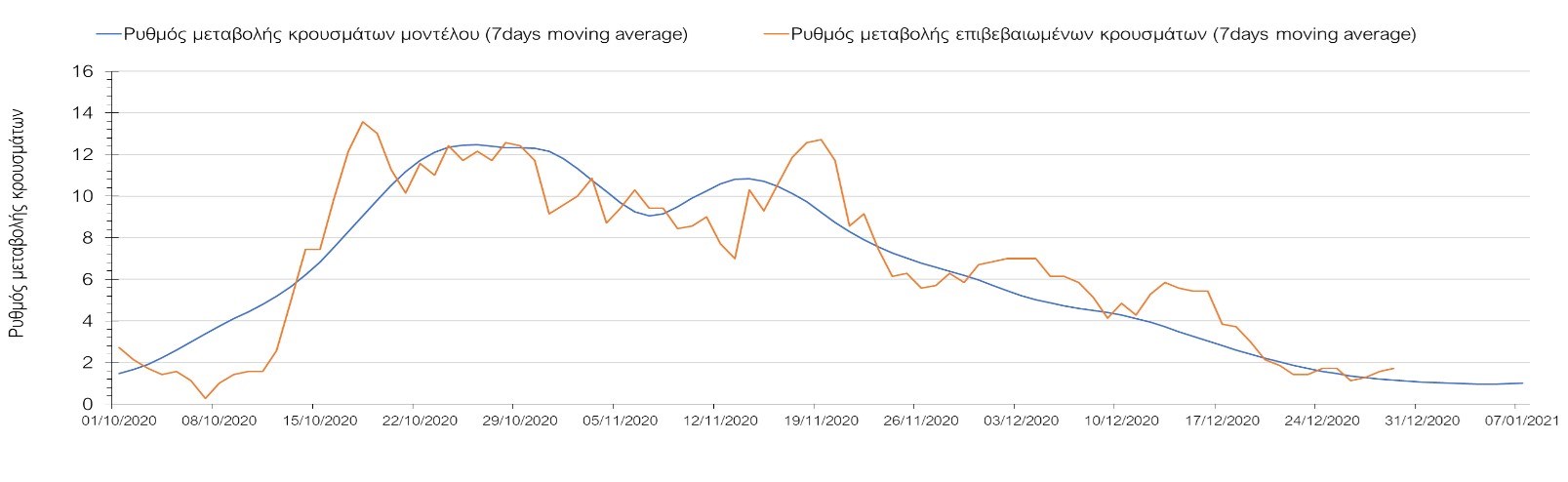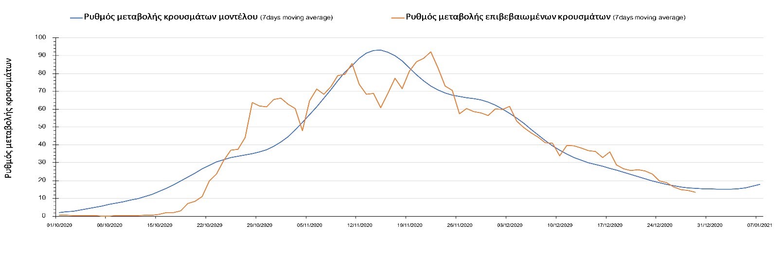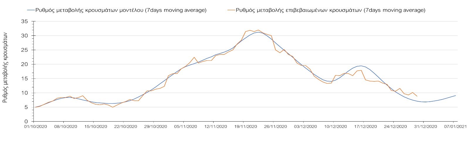 Και στις δύο περιπτώσεις φαίνεται ότι βρισκόμαστε περίπου στο 48% της αποκλιμάκωσης όπως είχαμε προβλέψει (δες σχήματα 1 και 2). Περιμένουμε ότι αυτή η αποκλιμάκωση θα συνεχιστεί αλλά με χαμηλότερο ρυθμό στις επόμενες ημέρες και σε ό,τι αφορά στον αριθμό των ασθενών που είναι διασωληνωμένοι σε ΜΕΘ και στους θανάτους από COVID-19.Η πορεία της μέσης εβδομαδιαίας τιμής των κρουσμάτων όπως έχουν καταγραφεί από τον ΕΟΔΥ και η αναμενόμενη πορεία τους μέχρι το τέλος του χρόνου, σύμφωνα με την την απόφαση παράτασης του lockdown μέχρι και τις 7 Ιανουαρίου, όπως προδιαγράφεται από την υπολογιστική πλατφόρμα CORE για την Ελληνική επικράτεια, αποτυπώνονται στο Σχήμα 3.