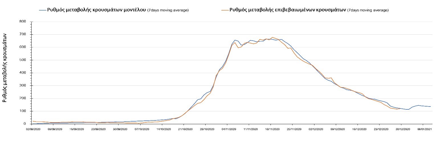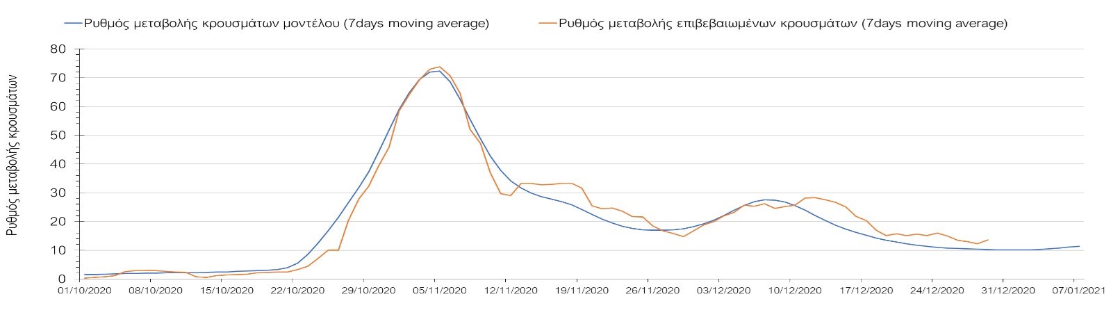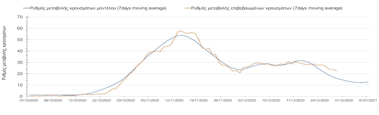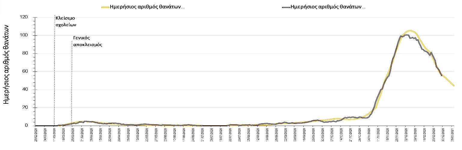 Ο αριθμός θανάτων (58) είναι μειωμένος σε σχέση με τη Δευτέρα (66), και είναι ιδιαίτερα θετικό το γεγονός ότι για έβδομη συνεχόμενη ημέρα παρέμεινε σε πτωτική πορεία, αν και ακολουθεί με υστέρηση δύο εβδομάδων την καμπύλη αποκλιμάκωσης σε ό,τι αφορά στα επιβεβαιωμένα κρούσματα. Ο γενικά υψηλός αριθμός των θανάτων που καταγράφεται ακόμα και αυτή την εβδομάδα σε συνδυασμό με την παρατηρούμενη μείωση των επιβεβαιωμένων κρουσμάτων σε σχέση με την προηγούμενη εβδομάδα μπορεί να ερμηνευθεί από το γεγονός ότι έγινε πιο συνεπής εφαρμογή του lockdown μετά τις 17-18 Νοεμβρίου, περίπου 10 μέρες μετά την ανακοίνωση του.
