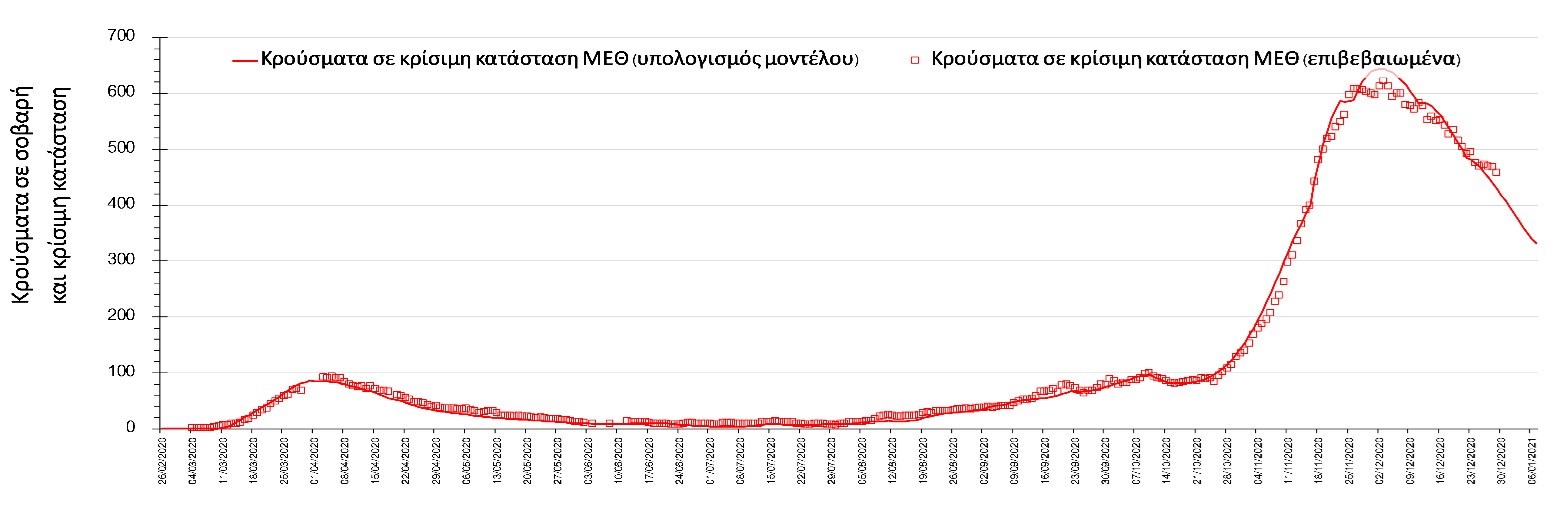 Όσον αφορά τους ασθενείς σε κρίσιμη κατάσταση (διασωληνωμένοι σε ΜΕΘ), ο αριθμός μειώθηκε πολύ ελαφρά σε σχέση με τη Δευτέρα (458 από 467), και παραμένει στα αναμενόμενα επίπεδα. Η καμπύλη εξέλιξης του αριθμού των ασθενών που χρειάζονται διασωλήνωση φαίνεται να ακολουθεί αργά την πορεία που διαφαίνονταν και από την υπολογιστική πλατφόρμα CORE, όπως αυτή παρουσιάζεται στο Σχήμα 1, ενώ μια εκτίμηση για την πορεία των θανάτων παρουσιάζεται στο Σχήμα 2.